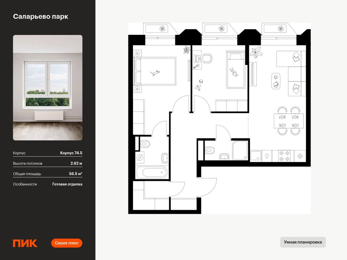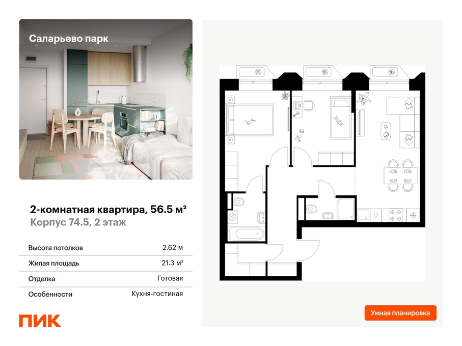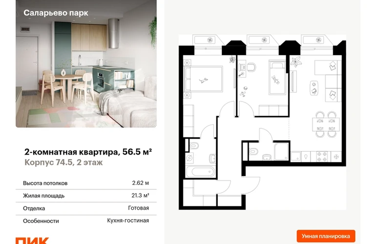 Продаётся 2-комн.квартира площадью 56.50 кв.м на 2 этаже 14 этажного дома (Корпус 74.5, секция 5) проекта ПИК Саларьево парк. Светлый просторный подъезд на уровне земли, функциональная планировка, большие окна, с отделкой. Жилой район «Саларьево парк» расположен в Новой Москве, в четырёх километрах от МКАД по Киевскому шоссе. Две станции метро: «Саларьево» и «Филатов луг», — находятся в пешей доступности от проекта. Дойти до них можно за 5–10 минут. В квартале уже создана качественная среда, где есть абсолютно всё для полноценной жизни, работы и отдыха. «Саларьево парк» — не просто квартал, а полноценный жилой район, который отличается разноплановой архитектурой. Над концепцией квартала работали несколько ведущих архитектурных бюро, которые стремились добиться разнообразия в фасадных решениях. Ярким примером такого подхода станут корпуса 82 и 83, которые относятся к «Серии плюс». Новый корпус 83 был создан по принципам южной архитектуры: расслабленный и лаконичный силуэт зданий, привлекающий к себе внимание. Архитектурная изюминка 83-го корпуса — террасы и фигурные балконы. Вместе с окнами и другими акцентными элементами они создают уникальный облик здания, отсылая нас к изысканной южной архитектуре. Все корпуса в квартале гармонично сочетаются, образуя единую городскую среду. Здесь приятно гулять и проводить время на улице всей семьёй. В «Саларьево парке» создана уникальная образовательная среда, включающая в себя шесть школ, рассчитанных на 6 250 учеников. Четыре из них уже открыты, их посещает 2 300 детей. Также на территории «Саларьево парка» находится 12 детских садов, один из которых с бассейном. Сейчас уже открыты 8 садов. В «Саларьево парке» открыта уникальная игровая площадка — PlayHub «Оригами». Здесь есть ручей, горка-труба и рельефные холмы. Взрослые смогут отдохнуть в уютном кафе, пока дети играют. Также на территории проекта есть SportHub — большая спортивная зона, разделённая по интересам и возрастам. Здесь можно заниматься разными видами спорта: футболом, баскетболом, волейболом и стритболом. Зимой центральную часть площадки превращают в каток. Во дворах-парках жилого квартала есть места для отдыха, детские и спортивные площадки. На первых этажах домов расположены магазины, кафе и полезные сервисы. Также вблизи проекта есть несколько масштабных торговых центров. До ТЦ «Саларис» пять минут пешком, до «Рио», Metro Cash & Carry и «Леруа Мерлен» — пять минут на автомобиле. Артикул - 1006630О застройщике