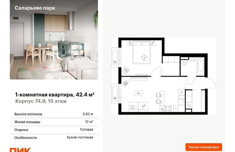 Продаётся 1-комн.квартира площадью 42.40 кв.м на 15 этаже 18 этажного дома (Корпус 74.9, секция 9) проекта ПИК Саларьево парк. Светлый просторный подъезд на уровне земли, функциональная планировка, большие окна, с отделкой. <br> <br>Жилой район «Саларьево парк» расположен в Новой Москве, в четырёх километрах от МКАД по Киевскому шоссе. Две станции метро: «Саларьево» и «Филатов луг» — находятся в пешей доступности от проекта. Дойти до них можно за 5–10 минут. В квартале уже создана качественная среда, где есть абсолютно всё для полноценной жизни, работы и отдыха. <br> <br>«Саларьево парк» — не просто квартал, а полноценный жилой район, который отличается разноплановой архитектурой. Над концепцией квартала работали несколько ведущих архитектурных бюро, которые стремились добиться разнообразия в фасадных решениях. Ярким примером такого подхода станет корпус 83, который относится к «Серии плюс». <br> <br>Новый корпус 83 был создан по принципам южной архитектуры: расслабленный и лаконичный силуэт зданий, привлекающий к себе внимание. Архитектурная изюминка 83-го корпуса — террасы и фигурные балконы. Вместе с окнами и другими акцентными элементами они создают уникальный облик здания, отсылая нас к изысканной южной архитектуре. <br> <br>Все корпуса в квартале гармонично сочетаются, образуя единую городскую среду. Здесь приятно гулять и проводить время на улице всей семьёй. <br> <br>В «Саларьево парке» создана уникальная образовательная среда, включающая в себя шесть школ, рассчитанных на 6 250 учеников. Две из них уже открыты, их посещает 2 300 детей. Также на территории «Саларьево парка» находится 12 детских садов, один из которых с бассейном. Сейчас уже открыты 7 садов. <br> <br>В «Саларьево парке» открыта уникальная игровая площадка — PlayHub «Оригами». Здесь есть ручей, горка-труба и рельефные холмы. Взрослые смогут отдохнуть в уютном кафе, пока дети играют. Также на территории проекта есть SportHub — большая спортивная зона, разделённая по интересам и возрастам. Здесь можно заниматься разными видами спорта: футболом, баскетболом, волейболом и стритболом. Зимой центральную часть площадки превращают в каток. <br> <br>Во дворах-парках жилого квартала есть места для отдыха, детские и спортивные площадки. На первых этажах домов расположены магазины, кафе и полезные сервисы. Также вблизи проекта есть несколько масштабных торговых центров. До ТЦ «Саларис» пять минут пешком, до «Рио», Metro Cash & Carry и «Лемана про» — пять минут на автомобиле. Артикул - 1007437О застройщике