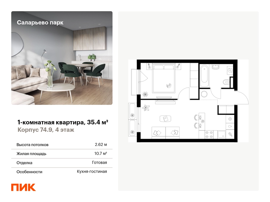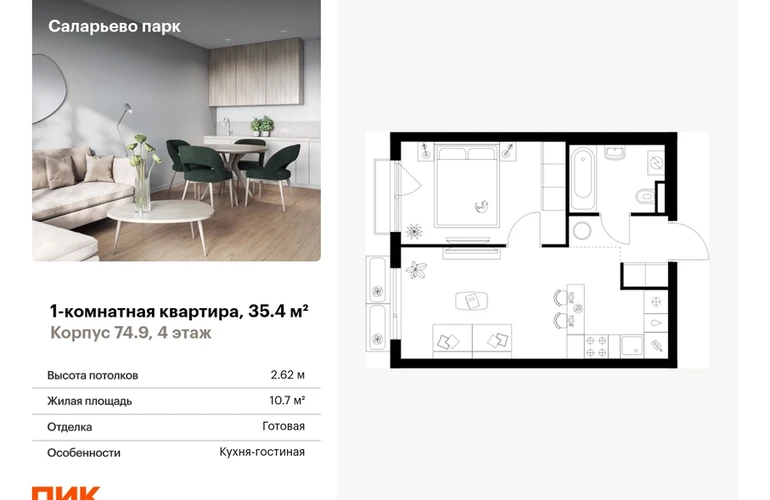Продаётся 1-комн.квартира площадью 35.40 кв.м на 4 этаже 18 этажного дома (Корпус 74.9, секция 9) проекта ПИК Саларьево парк. Светлый просторный подъезд на уровне земли, функциональная планировка, большие окна, с отделкой. Жилой район «Саларьево парк» расположен в Новой Москве, в четырёх километрах от МКАД по Киевскому шоссе. Две станции метро: «Саларьево» и «Филатов луг» — находятся в пешей доступности от проекта. Дойти до них можно за 5–10 минут. В квартале уже создана качественная среда, где есть абсолютно всё для полноценной жизни, работы и отдыха. «Саларьево парк» — не просто квартал, а полноценный жилой район, который отличается разноплановой архитектурой. Над концепцией квартала работали несколько ведущих архитектурных бюро, которые стремились добиться разнообразия в фасадных решениях. Ярким примером такого подхода станет корпус 83, который относится к «Серии плюс». Новый корпус 83 был создан по принципам южной архитектуры: расслабленный и лаконичный силуэт зданий, привлекающий к себе внимание. Архитектурная изюминка 83-го корпуса — террасы и фигурные балконы. Вместе с окнами и другими акцентными элементами они создают уникальный облик здания, отсылая нас к изысканной южной архитектуре. Все корпуса в квартале гармонично сочетаются, образуя единую городскую среду. Здесь приятно гулять и проводить время на улице всей семьёй. В «Саларьево парке» создана уникальная образовательная среда, включающая в себя шесть школ, рассчитанных на 6 250 учеников. Две из них уже открыты, их посещает 2 300 детей. Также на территории «Саларьево парка» находится 12 детских садов, один из которых с бассейном. Сейчас уже открыты 7 садов. В «Саларьево парке» открыта уникальная игровая площадка — PlayHub «Оригами». Здесь есть ручей, горка-труба и рельефные холмы. Взрослые смогут отдохнуть в уютном кафе, пока дети играют. Также на территории проекта есть SportHub — большая спортивная зона, разделённая по интересам и возрастам. Здесь можно заниматься разными видами спорта: футболом, баскетболом, волейболом и стритболом. Зимой центральную часть площадки превращают в каток. Во дворах-парках жилого квартала есть места для отдыха, детские и спортивные площадки. На первых этажах домов расположены магазины, кафе и полезные сервисы. Также вблизи проекта есть несколько масштабных торговых центров. До ТЦ «Саларис» пять минут пешком, до «Рио», Metro Cash & Carry и «Лемана про» — пять минут на автомобиле. Артикул - 1007280О застройщике
