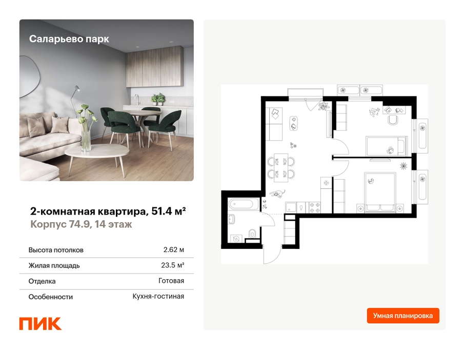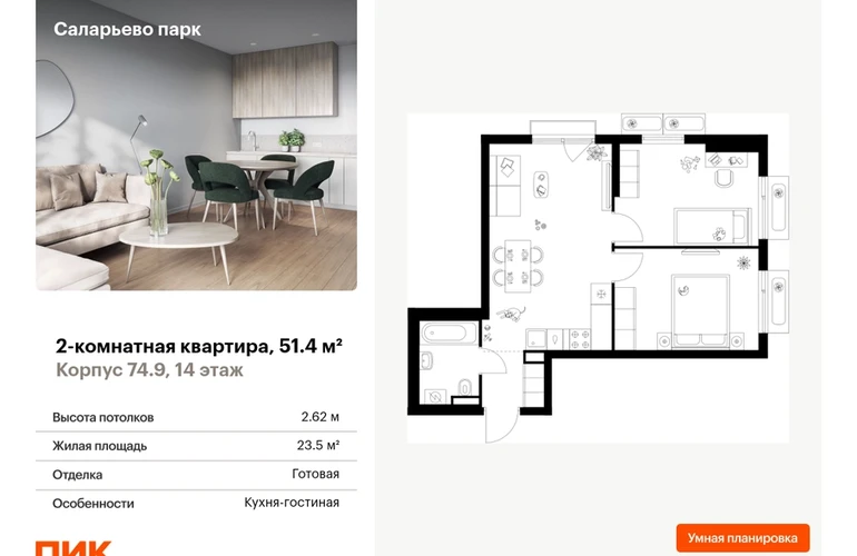 Продаётся 2-комн.квартира площадью 51.40 кв.м на 14 этаже 18 этажного дома (Корпус 74.9, секция 9) проекта ПИК Саларьево парк. Светлый просторный подъезд на уровне земли, функциональная планировка, большие окна, с отделкой. Артикул - 1007430О застройщике