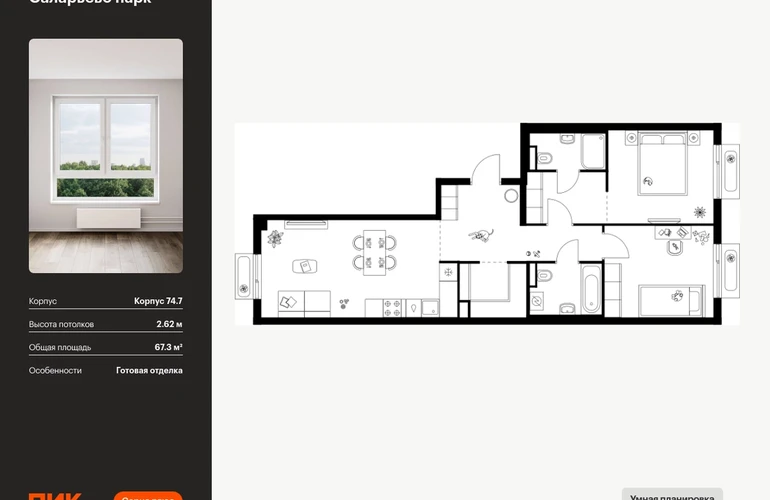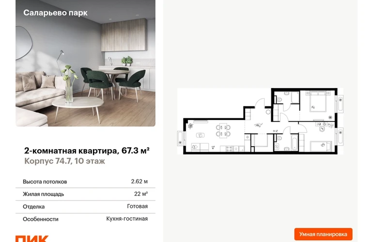 Продаётся 2-комн.квартира площадью 67.30 кв.м на 10 этаже 16 этажного дома (Корпус 74.7, секция 7) проекта ПИК Саларьево парк. Светлый просторный подъезд на уровне земли, функциональная планировка, большие окна, с отделкой. Жилой район «Саларьево парк» расположен в Новой Москве, в четырёх километрах от МКАД по Киевскому шоссе. Две станции метро: «Саларьево» и «Филатов луг», — находятся в пешей доступности от проекта. Дойти до них можно за 5–10 минут. В квартале уже создана качественная среда, где есть абсолютно всё для полноценной жизни, работы и отдыха. «Саларьево парк» — не просто квартал, а полноценный жилой район, который отличается разноплановой архитектурой. Над концепцией квартала работали несколько ведущих архитектурных бюро, которые стремились добиться разнообразия в фасадных решениях. Ярким примером такого подхода станут корпуса 82 и 83, которые относятся к «Серии плюс». Новый корпус 83 был создан по принципам южной архитектуры: расслабленный и лаконичный силуэт зданий, привлекающий к себе внимание. Архитектурная изюминка 83-го корпуса — террасы и фигурные балконы. Вместе с окнами и другими акцентными элементами они создают уникальный облик здания, отсылая нас к изысканной южной архитектуре. Все корпуса в квартале гармонично сочетаются, образуя единую городскую среду. Здесь приятно гулять и проводить время на улице всей семьёй. В «Саларьево парке» создана уникальная образовательная среда, включающая в себя шесть школ, рассчитанных на 6 250 учеников. Четыре из них уже открыты, их посещает 2 300 детей. Также на территории «Саларьево парка» находится 12 детских садов, один из которых с бассейном. Сейчас уже открыты 8 садов. В «Саларьево парке» открыта уникальная игровая площадка — PlayHub «Оригами». Здесь есть ручей, горка-труба и рельефные холмы. Взрослые смогут отдохнуть в уютном кафе, пока дети играют. Также на территории проекта есть SportHub — большая спортивная зона, разделённая по интересам и возрастам. Здесь можно заниматься разными видами спорта: футболом, баскетболом, волейболом и стритболом. Зимой центральную часть площадки превращают в каток. Во дворах-парках жилого квартала есть места для отдыха, детские и спортивные площадки. На первых этажах домов расположены магазины, кафе и полезные сервисы. Также вблизи проекта есть несколько масштабных торговых центров. До ТЦ «Саларис» пять минут пешком, до «Рио», Metro Cash & Carry и «Леруа Мерлен» — пять минут на автомобиле. Артикул - 1007096О застройщике