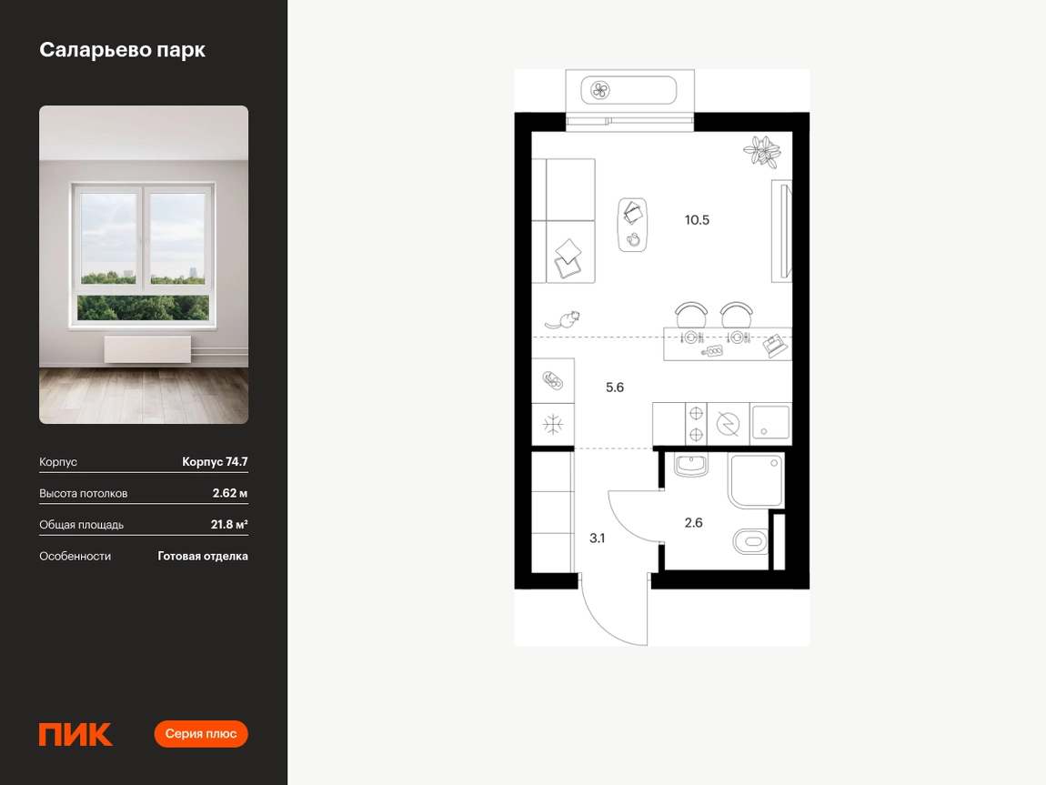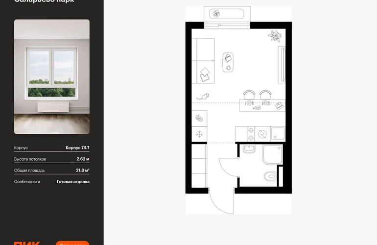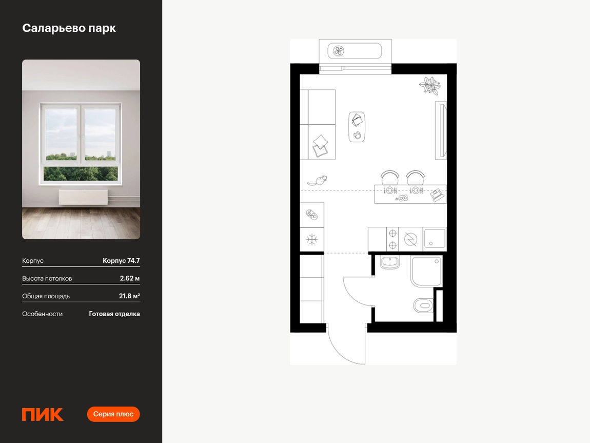 Продаётся квартира-студия площадью 21.80 кв.м на 8 этаже 16 этажного дома (Корпус 74.7, секция 7) проекта ПИК Саларьево парк. Светлый просторный подъезд на уровне земли, функциональная планировка, большие окна, с отделкой. Жилой район «Саларьево парк» расположен в Новой Москве, в четырёх километрах от МКАД по Киевскому шоссе. Две станции метро: «Саларьево» и «Филатов луг» — находятся в пешей доступности от проекта. Дойти до них можно за 5–10 минут. В квартале уже создана качественная среда, где есть абсолютно всё для полноценной жизни, работы и отдыха. «Саларьево парк» — не просто квартал, а полноценный жилой район, который отличается разноплановой архитектурой. Над концепцией квартала работали несколько ведущих архитектурных бюро, которые стремились добиться разнообразия в фасадных решениях. Ярким примером такого подхода станет корпус 83, который относится к «Серии плюс». Новый корпус 83 был создан по принципам южной архитектуры: расслабленный и лаконичный силуэт зданий, привлекающий к себе внимание. Архитектурная изюминка 83-го корпуса — террасы и фигурные балконы. Вместе с окнами и другими акцентными элементами они создают уникальный облик здания, отсылая нас к изысканной южной архитектуре. Все корпуса в квартале гармонично сочетаются, образуя единую городскую среду. Здесь приятно гулять и проводить время на улице всей семьёй. В «Саларьево парке» создана уникальная образовательная среда, включающая в себя шесть школ, рассчитанных на 6 250 учеников. Две из них уже открыты, их посещает 2 300 детей. Также на территории «Саларьево парка» находится 12 детских садов, один из которых с бассейном. Сейчас уже открыты 7 садов. В «Саларьево парке» открыта уникальная игровая площадка — PlayHub «Оригами». Здесь есть ручей, горка-труба и рельефные холмы. Взрослые смогут отдохнуть в уютном кафе, пока дети играют. Также на территории проекта есть SportHub — большая спортивная зона, разделённая по интересам и возрастам. Здесь можно заниматься разными видами спорта: футболом, баскетболом, волейболом и стритболом. Зимой центральную часть площадки превращают в каток. Во дворах-парках жилого квартала есть места для отдыха, детские и спортивные площадки. На первых этажах домов расположены магазины, кафе и полезные сервисы. Также вблизи проекта есть несколько масштабных торговых центров. До ТЦ «Саларис» пять минут пешком, до «Рио», Metro Cash & Carry и «Лемана про» — пять минут на автомобиле. Артикул - 1007062О застройщике
