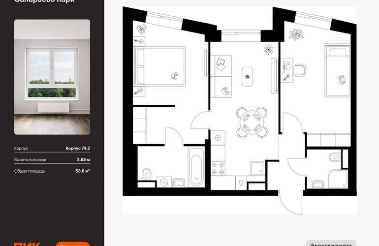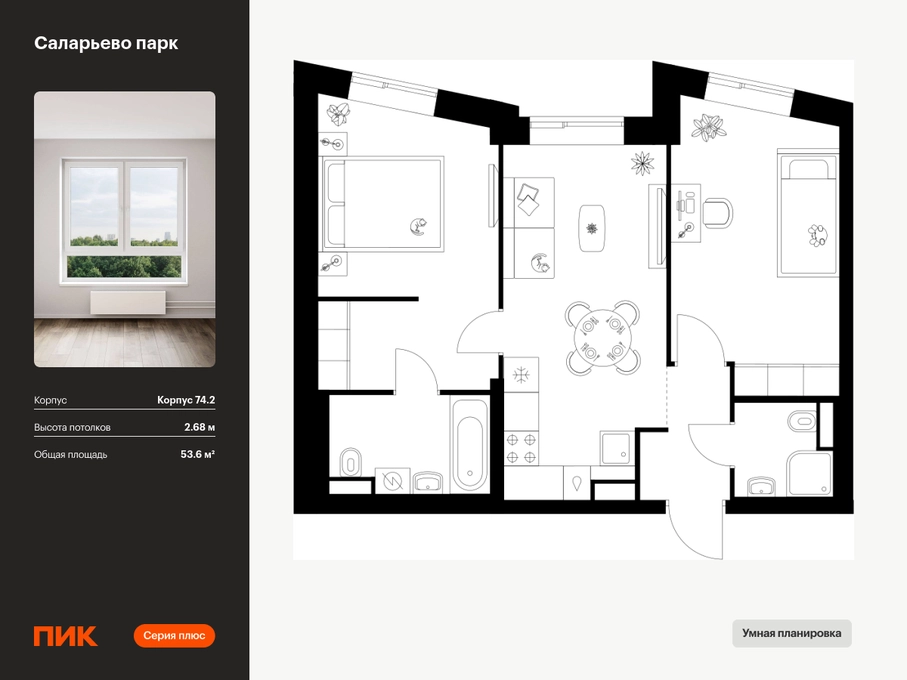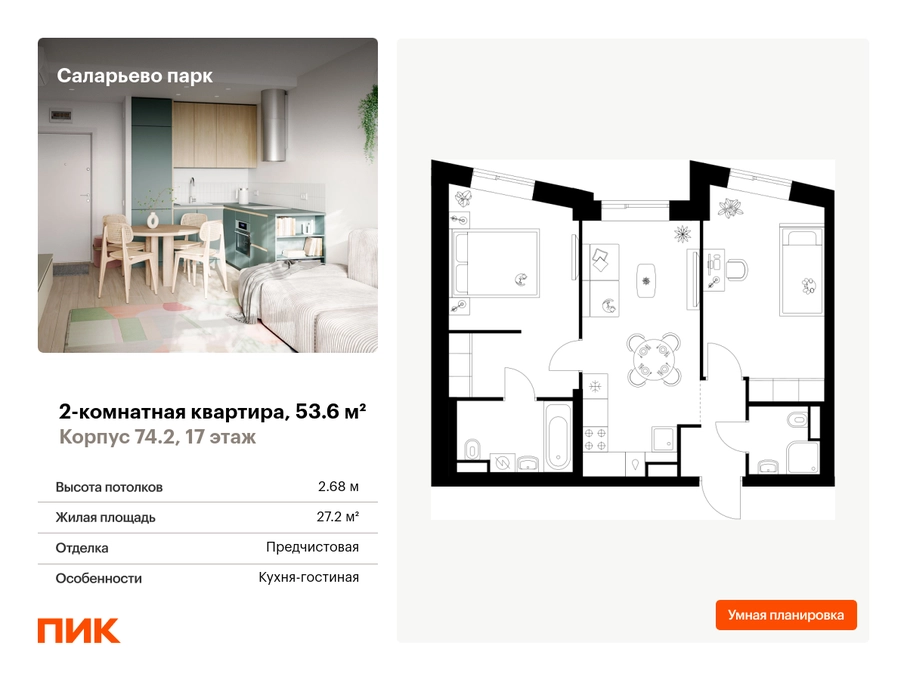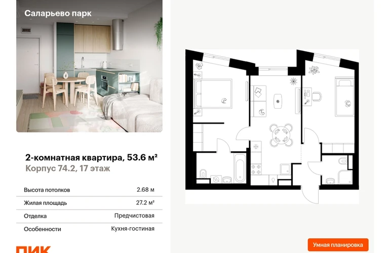 Продаётся 2-комн.квартира площадью 53.60 кв.м на 17 этаже 18 этажного дома (Корпус 74.2, секция 2) проекта ПИК Саларьево парк. Светлый просторный подъезд на уровне земли, функциональная планировка, большие окна, с отделкой. Жилой район «Саларьево парк» расположен в Новой Москве, в четырёх километрах от МКАД по Киевскому шоссе. Две станции метро: «Саларьево» и «Филатов луг» — находятся в пешей доступности от проекта. Дойти до них можно за 5–10 минут. В квартале уже создана качественная среда, где есть абсолютно всё для полноценной жизни, работы и отдыха. «Саларьево парк» — не просто квартал, а полноценный жилой район, который отличается разноплановой архитектурой. Над концепцией квартала работали несколько ведущих архитектурных бюро, которые стремились добиться разнообразия в фасадных решениях. Ярким примером такого подхода станет корпус 83, который относится к «Серии плюс». Новый корпус 83 был создан по принципам южной архитектуры: расслабленный и лаконичный силуэт зданий, привлекающий к себе внимание. Архитектурная изюминка 83-го корпуса — террасы и фигурные балконы. Вместе с окнами и другими акцентными элементами они создают уникальный облик здания, отсылая нас к изысканной южной архитектуре. Все корпуса в квартале гармонично сочетаются, образуя единую городскую среду. Здесь приятно гулять и проводить время на улице всей семьёй. В «Саларьево парке» создана уникальная образовательная среда, включающая в себя шесть школ, рассчитанных на 6 250 учеников. Две из них уже открыты, их посещает 2 300 детей. Также на территории «Саларьево парка» находится 12 детских садов, один из которых с бассейном. Сейчас уже открыты 7 садов. В «Саларьево парке» открыта уникальная игровая площадка — PlayHub «Оригами». Здесь есть ручей, горка-труба и рельефные холмы. Взрослые смогут отдохнуть в уютном кафе, пока дети играют. Также на территории проекта есть SportHub — большая спортивная зона, разделённая по интересам и возрастам. Здесь можно заниматься разными видами спорта: футболом, баскетболом, волейболом и стритболом. Зимой центральную часть площадки превращают в каток. Во дворах-парках жилого квартала есть места для отдыха, детские и спортивные площадки. На первых этажах домов расположены магазины, кафе и полезные сервисы. Также вблизи проекта есть несколько масштабных торговых центров. До ТЦ «Саларис» пять минут пешком, до «Рио», Metro Cash & Carry и «Лемана про» — пять минут на автомобиле. Артикул - 1006462О застройщике