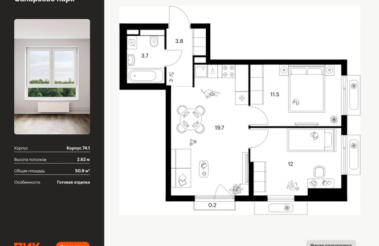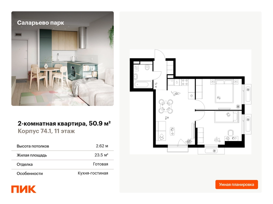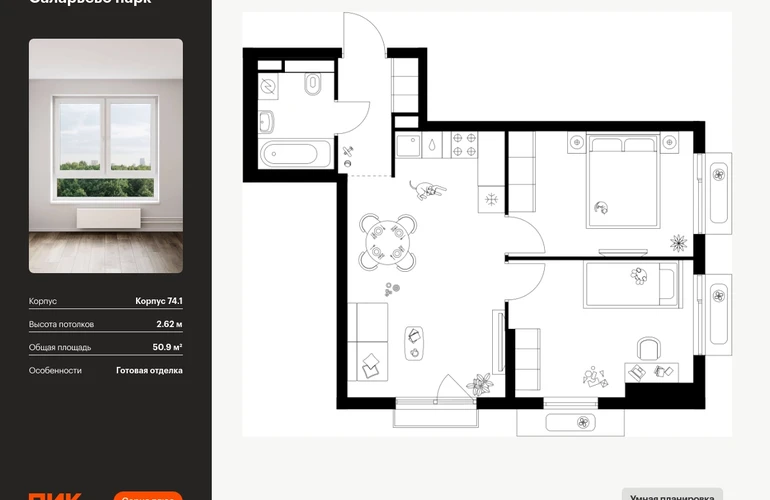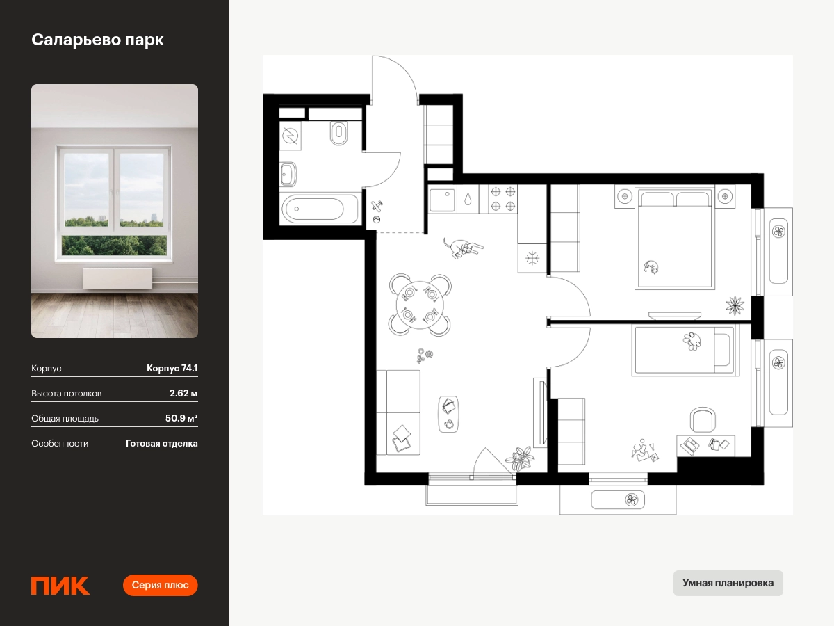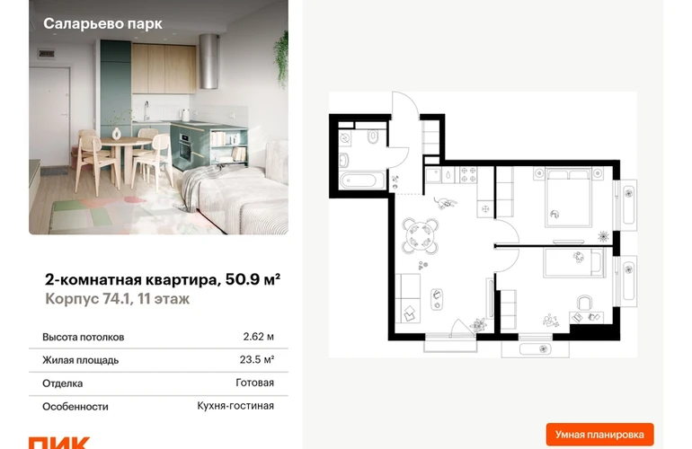 Продаётся 2-комн.квартира площадью 50.90 кв.м на 11 этаже 18 этажного дома (Корпус 74.1, секция 1) проекта ПИК Саларьево парк. Светлый просторный подъезд на уровне земли, функциональная планировка, большие окна, с отделкой. Жилой район «Саларьево парк» расположен в Новой Москве, в четырёх километрах от МКАД по Киевскому шоссе. Две станции метро: «Саларьево» и «Филатов луг», — находятся в пешей доступности от проекта. Дойти до них можно за 5–10 минут. В квартале уже создана качественная среда, где есть абсолютно всё для полноценной жизни, работы и отдыха. «Саларьево парк» — не просто квартал, а полноценный жилой район, который отличается разноплановой архитектурой. Над концепцией квартала работали несколько ведущих архитектурных бюро, которые стремились добиться разнообразия в фасадных решениях. Ярким примером такого подхода станут корпуса 82 и 83, которые относятся к «Серии плюс». Новый корпус 83 был создан по принципам южной архитектуры: расслабленный и лаконичный силуэт зданий, привлекающий к себе внимание. Архитектурная изюминка 83-го корпуса — террасы и фигурные балконы. Вместе с окнами и другими акцентными элементами они создают уникальный облик здания, отсылая нас к изысканной южной архитектуре. Все корпуса в квартале гармонично сочетаются, образуя единую городскую среду. Здесь приятно гулять и проводить время на улице всей семьёй. В «Саларьево парке» создана уникальная образовательная среда, включающая в себя шесть школ, рассчитанных на 6 250 учеников. Четыре из них уже открыты, их посещает 2 300 детей. Также на территории «Саларьево парка» находится 12 детских садов, один из которых с бассейном. Сейчас уже открыты 8 садов. В «Саларьево парке» открыта уникальная игровая площадка — PlayHub «Оригами». Здесь есть ручей, горка-труба и рельефные холмы. Взрослые смогут отдохнуть в уютном кафе, пока дети играют. Также на территории проекта есть SportHub — большая спортивная зона, разделённая по интересам и возрастам. Здесь можно заниматься разными видами спорта: футболом, баскетболом, волейболом и стритболом. Зимой центральную часть площадки превращают в каток. Во дворах-парках жилого квартала есть места для отдыха, детские и спортивные площадки. На первых этажах домов расположены магазины, кафе и полезные сервисы. Также вблизи проекта есть несколько масштабных торговых центров. До ТЦ «Саларис» пять минут пешком, до «Рио», Metro Cash & Carry и «Леруа Мерлен» — пять минут на автомобиле. Артикул - 1006155О застройщике