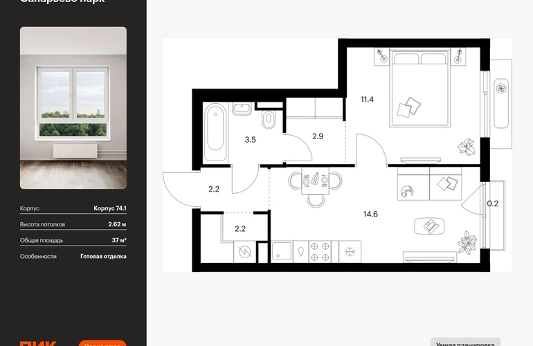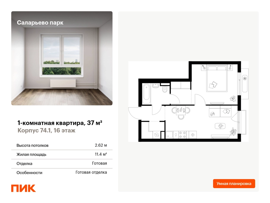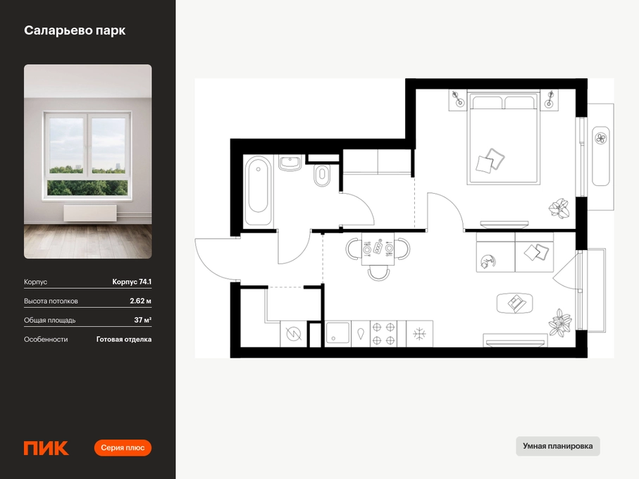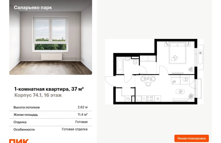 Продаётся 1-комн.квартира площадью 37.00 кв.м на 16 этаже 18 этажного дома (Корпус 74.1, секция 1) проекта ПИК Саларьево парк. Светлый просторный подъезд на уровне земли, функциональная планировка, большие окна, с отделкой. Жилой район «Саларьево парк» расположен в Новой Москве, в четырёх километрах от МКАД по Киевскому шоссе. Две станции метро: «Саларьево» и «Филатов луг», — находятся в пешей доступности от проекта. Дойти до них можно за 5–10 минут. В квартале уже создана качественная среда, где есть абсолютно всё для полноценной жизни, работы и отдыха. «Саларьево парк» — не просто квартал, а полноценный жилой район, который отличается разноплановой архитектурой. Над концепцией квартала работали несколько ведущих архитектурных бюро, которые стремились добиться разнообразия в фасадных решениях. Ярким примером такого подхода станут корпуса 82 и 83, которые относятся к «Серии плюс». Новый корпус 83 был создан по принципам южной архитектуры: расслабленный и лаконичный силуэт зданий, привлекающий к себе внимание. Архитектурная изюминка 83-го корпуса — террасы и фигурные балконы. Вместе с окнами и другими акцентными элементами они создают уникальный облик здания, отсылая нас к изысканной южной архитектуре. Все корпуса в квартале гармонично сочетаются, образуя единую городскую среду. Здесь приятно гулять и проводить время на улице всей семьёй. В «Саларьево парке» создана уникальная образовательная среда, включающая в себя шесть школ, рассчитанных на 6 250 учеников. Четыре из них уже открыты, их посещает 2 300 детей. Также на территории «Саларьево парка» находится 12 детских садов, один из которых с бассейном. Сейчас уже открыты 8 садов. В «Саларьево парке» открыта уникальная игровая площадка — PlayHub «Оригами». Здесь есть ручей, горка-труба и рельефные холмы. Взрослые смогут отдохнуть в уютном кафе, пока дети играют. Также на территории проекта есть SportHub — большая спортивная зона, разделённая по интересам и возрастам. Здесь можно заниматься разными видами спорта: футболом, баскетболом, волейболом и стритболом. Зимой центральную часть площадки превращают в каток. Во дворах-парках жилого квартала есть места для отдыха, детские и спортивные площадки. На первых этажах домов расположены магазины, кафе и полезные сервисы. Также вблизи проекта есть несколько масштабных торговых центров. До ТЦ «Саларис» пять минут пешком, до «Рио», Metro Cash & Carry и «Леруа Мерлен» — пять минут на автомобиле. Артикул - 1006237О застройщике