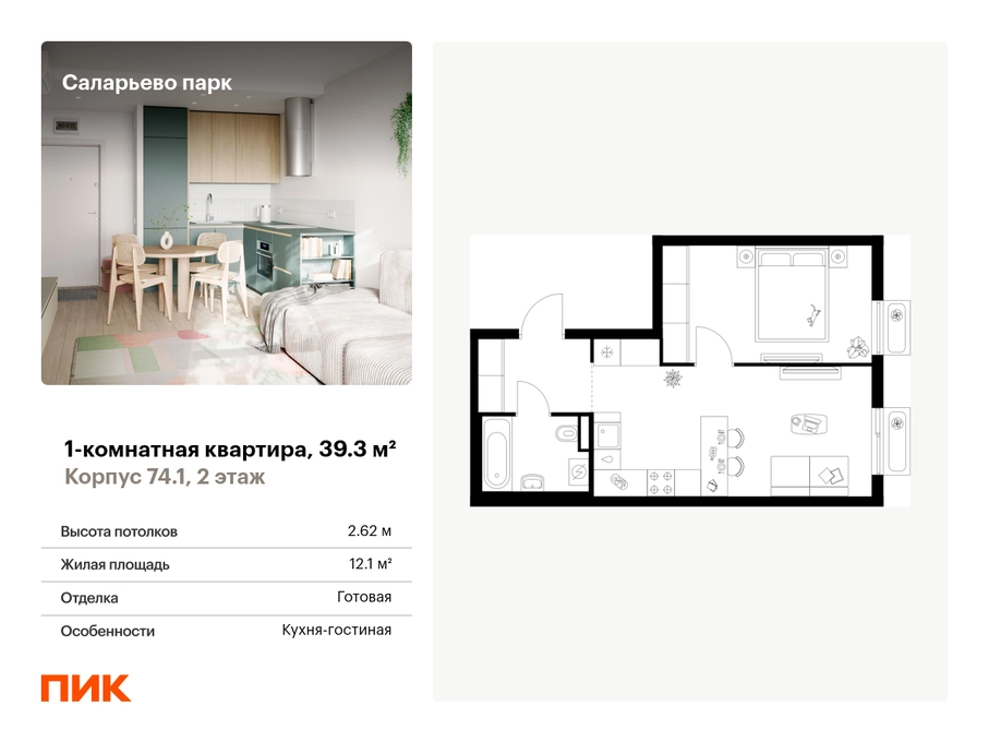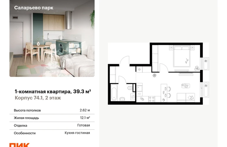 Продаётся 1-комн.квартира площадью 39.30 кв.м на 2 этаже 18 этажного дома (Корпус 74.1, секция 1) проекта ПИК Саларьево парк. Светлый просторный подъезд на уровне земли, функциональная планировка, большие окна, с отделкой. Жилой район «Саларьево парк» расположен в Новой Москве, в четырёх километрах от МКАД по Киевскому шоссе. Две станции метро: «Саларьево» и «Филатов луг», — находятся в пешей доступности от проекта. Дойти до них можно за 5–10 минут. В квартале уже создана качественная среда, где есть абсолютно всё для полноценной жизни, работы и отдыха. «Саларьево парк» — не просто квартал, а полноценный жилой район, который отличается разноплановой архитектурой. Над концепцией квартала работали несколько ведущих архитектурных бюро, которые стремились добиться разнообразия в фасадных решениях. Ярким примером такого подхода станут корпуса 82 и 83, которые относятся к «Серии плюс». Новый корпус 83 был создан по принципам южной архитектуры: расслабленный и лаконичный силуэт зданий, привлекающий к себе внимание. Архитектурная изюминка 83-го корпуса — террасы и фигурные балконы. Вместе с окнами и другими акцентными элементами они создают уникальный облик здания, отсылая нас к изысканной южной архитектуре. Все корпуса в квартале гармонично сочетаются, образуя единую городскую среду. Здесь приятно гулять и проводить время на улице всей семьёй. В «Саларьево парке» создана уникальная образовательная среда, включающая в себя шесть школ, рассчитанных на 6 250 учеников. Четыре из них уже открыты, их посещает 2 300 детей. Также на территории «Саларьево парка» находится 12 детских садов, один из которых с бассейном. Сейчас уже открыты 8 садов. В «Саларьево парке» открыта уникальная игровая площадка — PlayHub «Оригами». Здесь есть ручей, горка-труба и рельефные холмы. Взрослые смогут отдохнуть в уютном кафе, пока дети играют. Также на территории проекта есть SportHub — большая спортивная зона, разделённая по интересам и возрастам. Здесь можно заниматься разными видами спорта: футболом, баскетболом, волейболом и стритболом. Зимой центральную часть площадки превращают в каток. Во дворах-парках жилого квартала есть места для отдыха, детские и спортивные площадки. На первых этажах домов расположены магазины, кафе и полезные сервисы. Также вблизи проекта есть несколько масштабных торговых центров. До ТЦ «Саларис» пять минут пешком, до «Рио», Metro Cash & Carry и «Леруа Мерлен» — пять минут на автомобиле. Артикул - 1006034О застройщике