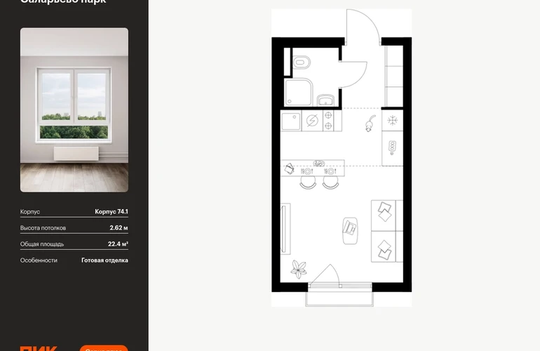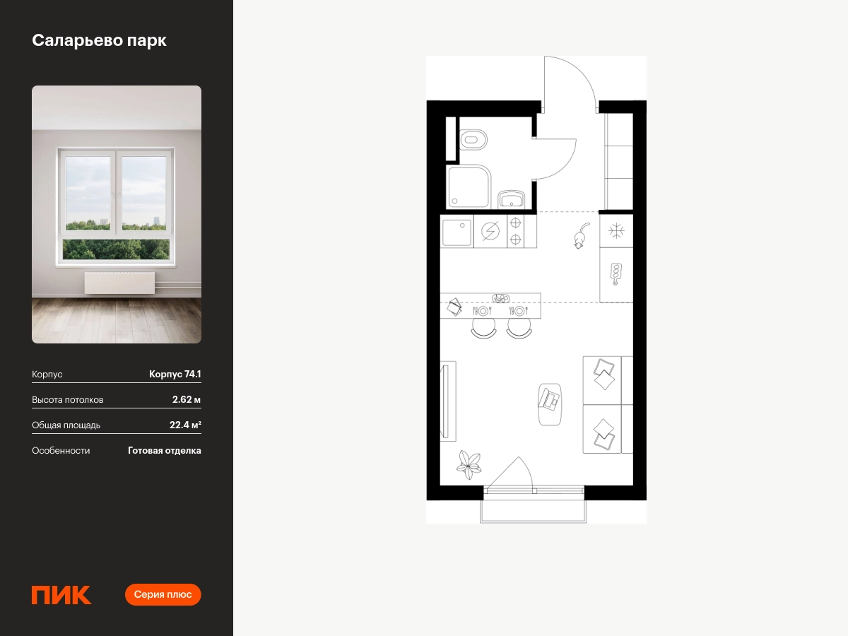 Продаётся квартира-студия площадью 22.40 кв.м на 8 этаже 18 этажного дома (Корпус 74.1, секция 1) проекта ПИК Саларьево парк. Светлый просторный подъезд на уровне земли, функциональная планировка, большие окна, с отделкой. Жилой район «Саларьево парк» расположен в Новой Москве, в четырёх километрах от МКАД по Киевскому шоссе. Две станции метро: «Саларьево» и «Филатов луг» — находятся в пешей доступности от проекта. Дойти до них можно за 5–10 минут. В квартале уже создана качественная среда, где есть абсолютно всё для полноценной жизни, работы и отдыха. «Саларьево парк» — не просто квартал, а полноценный жилой район, который отличается разноплановой архитектурой. Над концепцией квартала работали несколько ведущих архитектурных бюро, которые стремились добиться разнообразия в фасадных решениях. Ярким примером такого подхода станет корпус 83, который относится к «Серии плюс». Новый корпус 83 был создан по принципам южной архитектуры: расслабленный и лаконичный силуэт зданий, привлекающий к себе внимание. Архитектурная изюминка 83-го корпуса — террасы и фигурные балконы. Вместе с окнами и другими акцентными элементами они создают уникальный облик здания, отсылая нас к изысканной южной архитектуре. Все корпуса в квартале гармонично сочетаются, образуя единую городскую среду. Здесь приятно гулять и проводить время на улице всей семьёй. В «Саларьево парке» создана уникальная образовательная среда, включающая в себя шесть школ, рассчитанных на 6 250 учеников. Две из них уже открыты, их посещает 2 300 детей. Также на территории «Саларьево парка» находится 12 детских садов, один из которых с бассейном. Сейчас уже открыты 7 садов. В «Саларьево парке» открыта уникальная игровая площадка — PlayHub «Оригами». Здесь есть ручей, горка-труба и рельефные холмы. Взрослые смогут отдохнуть в уютном кафе, пока дети играют. Также на территории проекта есть SportHub — большая спортивная зона, разделённая по интересам и возрастам. Здесь можно заниматься разными видами спорта: футболом, баскетболом, волейболом и стритболом. Зимой центральную часть площадки превращают в каток. Во дворах-парках жилого квартала есть места для отдыха, детские и спортивные площадки. На первых этажах домов расположены магазины, кафе и полезные сервисы. Также вблизи проекта есть несколько масштабных торговых центров. До ТЦ «Саларис» пять минут пешком, до «Рио», Metro Cash & Carry и «Лемана про» — пять минут на автомобиле. Артикул - 1006113О застройщике