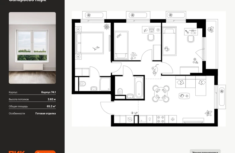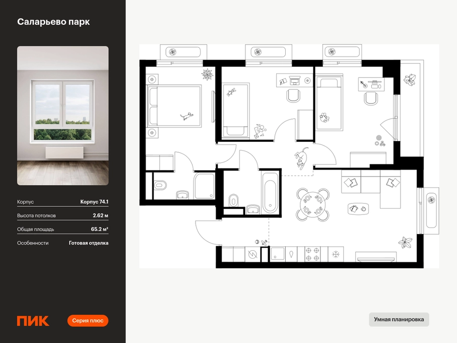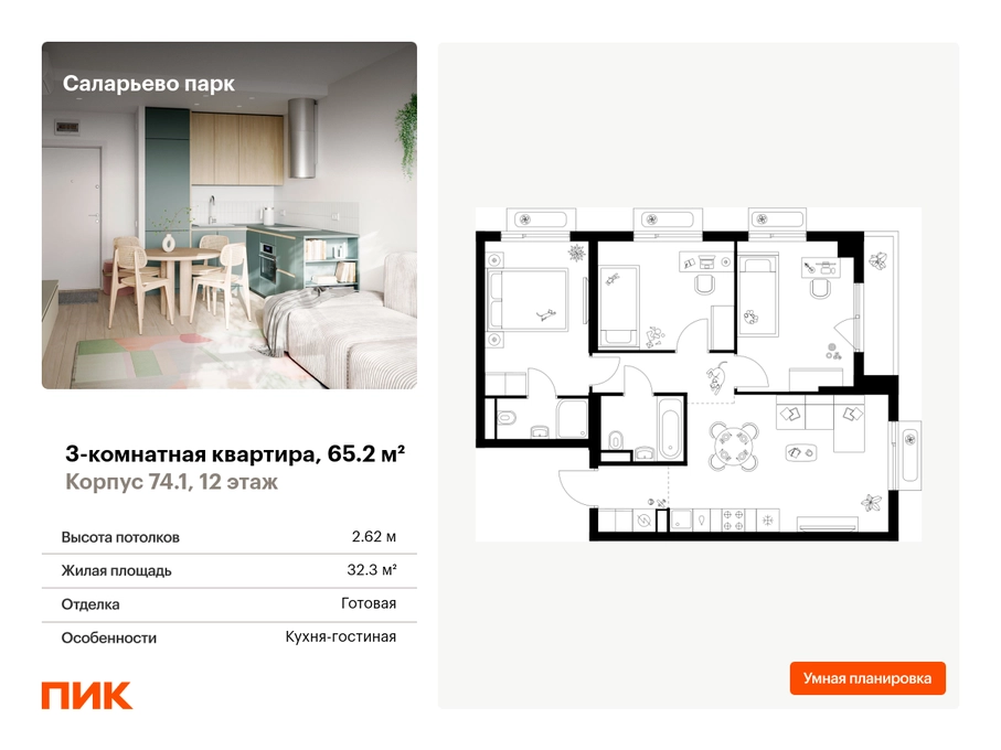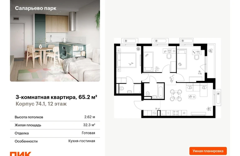 Продаётся 3-комн.квартира площадью 65.20 кв.м на 12 этаже 18 этажного дома (Корпус 74.1, секция 1) проекта ПИК Саларьево парк. Светлый просторный подъезд на уровне земли, функциональная планировка, большие окна, с отделкой. Жилой район «Саларьево парк» расположен в Новой Москве, в четырёх километрах от МКАД по Киевскому шоссе. Две станции метро: «Саларьево» и «Филатов луг», — находятся в пешей доступности от проекта. Дойти до них можно за 5–10 минут. В квартале уже создана качественная среда, где есть абсолютно всё для полноценной жизни, работы и отдыха. «Саларьево парк» — не просто квартал, а полноценный жилой район, который отличается разноплановой архитектурой. Над концепцией квартала работали несколько ведущих архитектурных бюро, которые стремились добиться разнообразия в фасадных решениях. Ярким примером такого подхода станут корпуса 82 и 83, которые относятся к «Серии плюс». Новый корпус 83 был создан по принципам южной архитектуры: расслабленный и лаконичный силуэт зданий, привлекающий к себе внимание. Архитектурная изюминка 83-го корпуса — террасы и фигурные балконы. Вместе с окнами и другими акцентными элементами они создают уникальный облик здания, отсылая нас к изысканной южной архитектуре. Все корпуса в квартале гармонично сочетаются, образуя единую городскую среду. Здесь приятно гулять и проводить время на улице всей семьёй. В «Саларьево парке» создана уникальная образовательная среда, включающая в себя шесть школ, рассчитанных на 6 250 учеников. Четыре из них уже открыты, их посещает 2 300 детей. Также на территории «Саларьево парка» находится 12 детских садов, один из которых с бассейном. Сейчас уже открыты 8 садов. В «Саларьево парке» открыта уникальная игровая площадка — PlayHub «Оригами». Здесь есть ручей, горка-труба и рельефные холмы. Взрослые смогут отдохнуть в уютном кафе, пока дети играют. Также на территории проекта есть SportHub — большая спортивная зона, разделённая по интересам и возрастам. Здесь можно заниматься разными видами спорта: футболом, баскетболом, волейболом и стритболом. Зимой центральную часть площадки превращают в каток. Во дворах-парках жилого квартала есть места для отдыха, детские и спортивные площадки. На первых этажах домов расположены магазины, кафе и полезные сервисы. Также вблизи проекта есть несколько масштабных торговых центров. До ТЦ «Саларис» пять минут пешком, до «Рио», Metro Cash & Carry и «Леруа Мерлен» — пять минут на автомобиле. Артикул - 1006177О застройщике