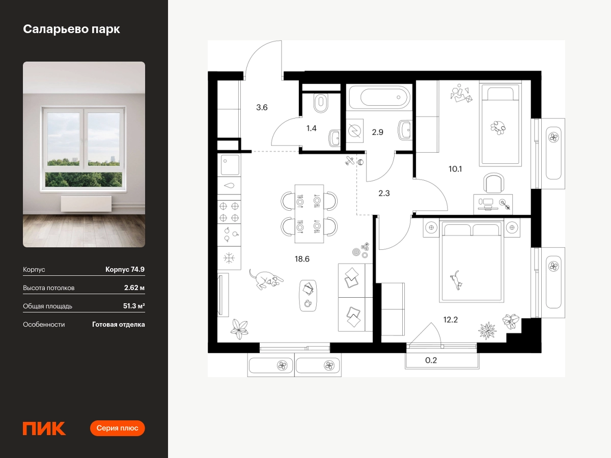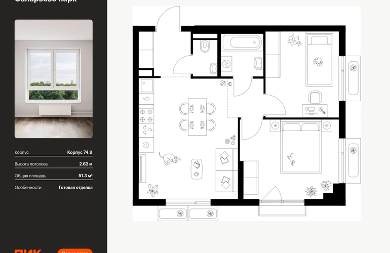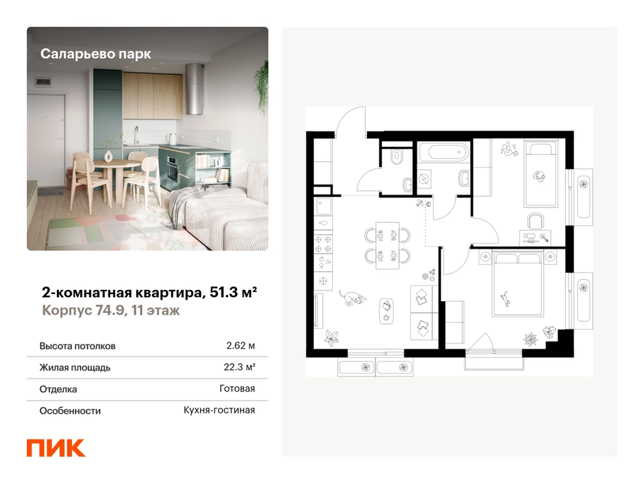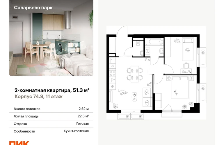 Продаётся 2-комн.квартира площадью 51.30 кв.м на 11 этаже 18 этажного дома (Корпус 74.9, секция 9) проекта ПИК Саларьево парк. Светлый просторный подъезд на уровне земли, функциональная планировка, большие окна, с отделкой. Жилой район «Саларьево парк» расположен в Новой Москве, в четырёх километрах от МКАД по Киевскому шоссе. Две станции метро: «Саларьево» и «Филатов луг», — находятся в пешей доступности от проекта. Дойти до них можно за 5–10 минут. В квартале уже создана качественная среда, где есть абсолютно всё для полноценной жизни, работы и отдыха. «Саларьево парк» — не просто квартал, а полноценный жилой район, который отличается разноплановой архитектурой. Над концепцией квартала работали несколько ведущих архитектурных бюро, которые стремились добиться разнообразия в фасадных решениях. Ярким примером такого подхода станут корпуса 82 и 83, которые относятся к «Серии плюс». Новый корпус 83 был создан по принципам южной архитектуры: расслабленный и лаконичный силуэт зданий, привлекающий к себе внимание. Архитектурная изюминка 83-го корпуса — террасы и фигурные балконы. Вместе с окнами и другими акцентными элементами они создают уникальный облик здания, отсылая нас к изысканной южной архитектуре. Все корпуса в квартале гармонично сочетаются, образуя единую городскую среду. Здесь приятно гулять и проводить время на улице всей семьёй. В «Саларьево парке» создана уникальная образовательная среда, включающая в себя шесть школ, рассчитанных на 6 250 учеников. Четыре из них уже открыты, их посещает 2 300 детей. Также на территории «Саларьево парка» находится 12 детских садов, один из которых с бассейном. Сейчас уже открыты 8 садов. В «Саларьево парке» открыта уникальная игровая площадка — PlayHub «Оригами». Здесь есть ручей, горка-труба и рельефные холмы. Взрослые смогут отдохнуть в уютном кафе, пока дети играют. Также на территории проекта есть SportHub — большая спортивная зона, разделённая по интересам и возрастам. Здесь можно заниматься разными видами спорта: футболом, баскетболом, волейболом и стритболом. Зимой центральную часть площадки превращают в каток. Во дворах-парках жилого квартала есть места для отдыха, детские и спортивные площадки. На первых этажах домов расположены магазины, кафе и полезные сервисы. Также вблизи проекта есть несколько масштабных торговых центров. До ТЦ «Саларис» пять минут пешком, до «Рио», Metro Cash & Carry и «Леруа Мерлен» — пять минут на автомобиле. Артикул - 1007377О застройщике
