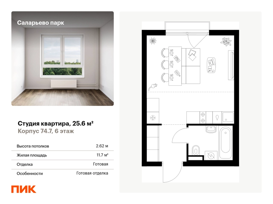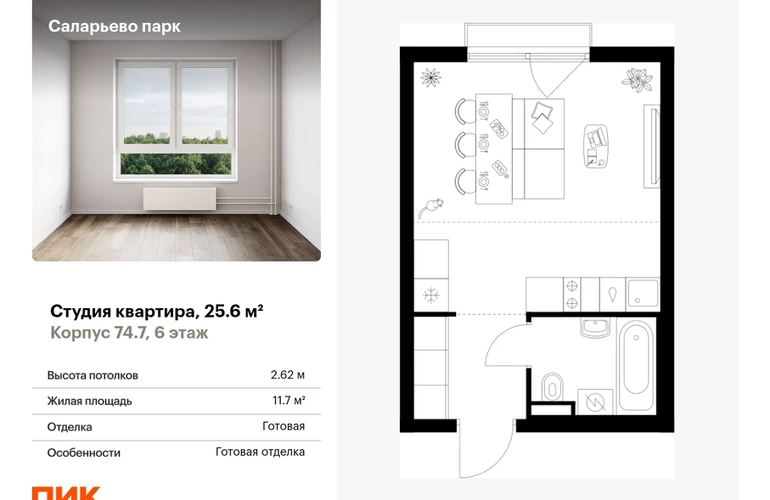 Продаётся квартира-студия площадью 25.60 кв.м на 6 этаже 16 этажного дома (Корпус 74.7, секция 7) проекта ПИК Саларьево парк. Светлый просторный подъезд на уровне земли, функциональная планировка, большие окна, с отделкой. <br> <br>Жилой район «Саларьево парк» расположен в Новой Москве, в четырёх километрах от МКАД по Киевскому шоссе. Две станции метро: «Саларьево» и «Филатов луг» — находятся в пешей доступности от проекта. Дойти до них можно за 5–10 минут. В квартале уже создана качественная среда, где есть абсолютно всё для полноценной жизни, работы и отдыха. <br> <br>«Саларьево парк» — не просто квартал, а полноценный жилой район, который отличается разноплановой архитектурой. Над концепцией квартала работали несколько ведущих архитектурных бюро, которые стремились добиться разнообразия в фасадных решениях. Ярким примером такого подхода станет корпус 83, который относится к «Серии плюс». <br> <br>Новый корпус 83 был создан по принципам южной архитектуры: расслабленный и лаконичный силуэт зданий, привлекающий к себе внимание. Архитектурная изюминка 83-го корпуса — террасы и фигурные балконы. Вместе с окнами и другими акцентными элементами они создают уникальный облик здания, отсылая нас к изысканной южной архитектуре. <br> <br>Все корпуса в квартале гармонично сочетаются, образуя единую городскую среду. Здесь приятно гулять и проводить время на улице всей семьёй. <br> <br>В «Саларьево парке» создана уникальная образовательная среда, включающая в себя шесть школ, рассчитанных на 6 250 учеников. Две из них уже открыты, их посещает 2 300 детей. Также на территории «Саларьево парка» находится 12 детских садов, один из которых с бассейном. Сейчас уже открыты 7 садов. <br> <br>В «Саларьево парке» открыта уникальная игровая площадка — PlayHub «Оригами». Здесь есть ручей, горка-труба и рельефные холмы. Взрослые смогут отдохнуть в уютном кафе, пока дети играют. Также на территории проекта есть SportHub — большая спортивная зона, разделённая по интересам и возрастам. Здесь можно заниматься разными видами спорта: футболом, баскетболом, волейболом и стритболом. Зимой центральную часть площадки превращают в каток. <br> <br>Во дворах-парках жилого квартала есть места для отдыха, детские и спортивные площадки. На первых этажах домов расположены магазины, кафе и полезные сервисы. Также вблизи проекта есть несколько масштабных торговых центров. До ТЦ «Саларис» пять минут пешком, до «Рио», Metro Cash & Carry и «Леруа Мерлен» — пять минут на автомобиле. Артикул - 1007029О застройщике