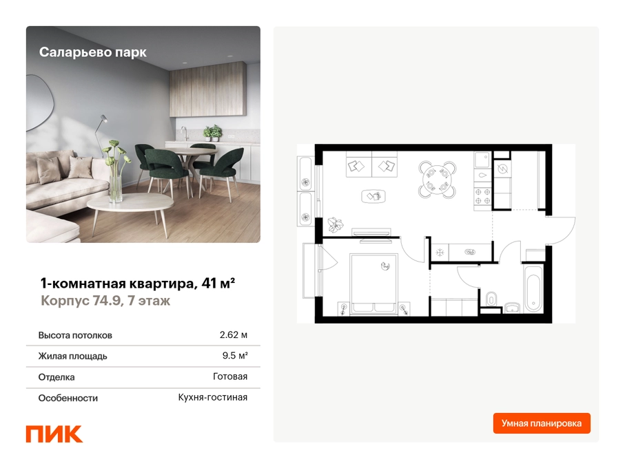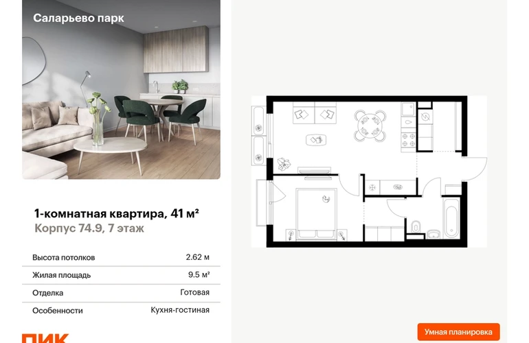 Продаётся 1-комн.квартира площадью 41.00 кв.м на 7 этаже 18 этажного дома (Корпус 74.9, секция 9) проекта ПИК Саларьево парк. Светлый просторный подъезд на уровне земли, функциональная планировка, большие окна, с отделкой. <br> <br>Жилой район «Саларьево парк» расположен в Новой Москве, в четырёх километрах от МКАД по Киевскому шоссе. Две станции метро: «Саларьево» и «Филатов луг» — находятся в пешей доступности от проекта. Дойти до них можно за 5–10 минут. В квартале уже создана качественная среда, где есть абсолютно всё для полноценной жизни, работы и отдыха. <br> <br>«Саларьево парк» — не просто квартал, а полноценный жилой район, который отличается разноплановой архитектурой. Над концепцией квартала работали несколько ведущих архитектурных бюро, которые стремились добиться разнообразия в фасадных решениях. Ярким примером такого подхода станет корпус 83, который относится к «Серии плюс». <br> <br>Новый корпус 83 был создан по принципам южной архитектуры: расслабленный и лаконичный силуэт зданий, привлекающий к себе внимание. Архитектурная изюминка 83-го корпуса — террасы и фигурные балконы. Вместе с окнами и другими акцентными элементами они создают уникальный облик здания, отсылая нас к изысканной южной архитектуре. <br> <br>Все корпуса в квартале гармонично сочетаются, образуя единую городскую среду. Здесь приятно гулять и проводить время на улице всей семьёй. <br> <br>В «Саларьево парке» создана уникальная образовательная среда, включающая в себя шесть школ, рассчитанных на 6 250 учеников. Две из них уже открыты, их посещает 2 300 детей. Также на территории «Саларьево парка» находится 12 детских садов, один из которых с бассейном. Сейчас уже открыты 7 садов. <br> <br>В «Саларьево парке» открыта уникальная игровая площадка — PlayHub «Оригами». Здесь есть ручей, горка-труба и рельефные холмы. Взрослые смогут отдохнуть в уютном кафе, пока дети играют. Также на территории проекта есть SportHub — большая спортивная зона, разделённая по интересам и возрастам. Здесь можно заниматься разными видами спорта: футболом, баскетболом, волейболом и стритболом. Зимой центральную часть площадки превращают в каток. <br> <br>Во дворах-парках жилого квартала есть места для отдыха, детские и спортивные площадки. На первых этажах домов расположены магазины, кафе и полезные сервисы. Также вблизи проекта есть несколько масштабных торговых центров. До ТЦ «Саларис» пять минут пешком, до «Рио», Metro Cash & Carry и «Лемана про» — пять минут на автомобиле. Артикул - 1007322О застройщике