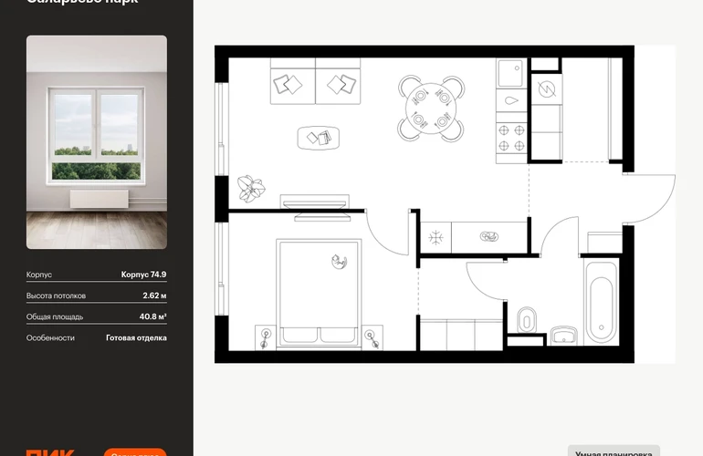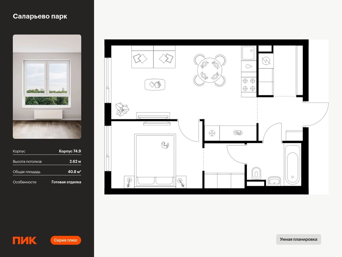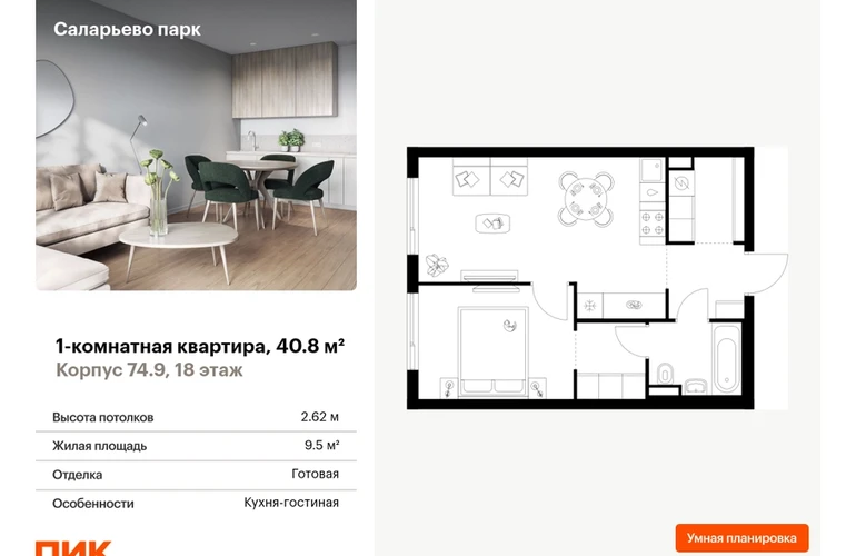 Продаётся 1-комн.квартира площадью 40.80 кв.м на 18 этаже 18 этажного дома (Корпус 74.9, секция 9) проекта ПИК Саларьево парк. Светлый просторный подъезд на уровне земли, функциональная планировка, большие окна, с отделкой. Жилой район «Саларьево парк» расположен в Новой Москве, в четырёх километрах от МКАД по Киевскому шоссе. Две станции метро: «Саларьево» и «Филатов луг» — находятся в пешей доступности от проекта. Дойти до них можно за 5–10 минут. В квартале уже создана качественная среда, где есть абсолютно всё для полноценной жизни, работы и отдыха. «Саларьево парк» — не просто квартал, а полноценный жилой район, который отличается разноплановой архитектурой. Над концепцией квартала работали несколько ведущих архитектурных бюро, которые стремились добиться разнообразия в фасадных решениях. Ярким примером такого подхода станет корпус 83, который относится к «Серии плюс». Новый корпус 83 был создан по принципам южной архитектуры: расслабленный и лаконичный силуэт зданий, привлекающий к себе внимание. Архитектурная изюминка 83-го корпуса — террасы и фигурные балконы. Вместе с окнами и другими акцентными элементами они создают уникальный облик здания, отсылая нас к изысканной южной архитектуре. Все корпуса в квартале гармонично сочетаются, образуя единую городскую среду. Здесь приятно гулять и проводить время на улице всей семьёй. В «Саларьево парке» создана уникальная образовательная среда, включающая в себя шесть школ, рассчитанных на 6 250 учеников. Две из них уже открыты, их посещает 2 300 детей. Также на территории «Саларьево парка» находится 12 детских садов, один из которых с бассейном. Сейчас уже открыты 7 садов. В «Саларьево парке» открыта уникальная игровая площадка — PlayHub «Оригами». Здесь есть ручей, горка-труба и рельефные холмы. Взрослые смогут отдохнуть в уютном кафе, пока дети играют. Также на территории проекта есть SportHub — большая спортивная зона, разделённая по интересам и возрастам. Здесь можно заниматься разными видами спорта: футболом, баскетболом, волейболом и стритболом. Зимой центральную часть площадки превращают в каток. Во дворах-парках жилого квартала есть места для отдыха, детские и спортивные площадки. На первых этажах домов расположены магазины, кафе и полезные сервисы. Также вблизи проекта есть несколько масштабных торговых центров. До ТЦ «Саларис» пять минут пешком, до «Рио», Metro Cash & Carry и «Лемана про» — пять минут на автомобиле. Артикул - 1007478О застройщике