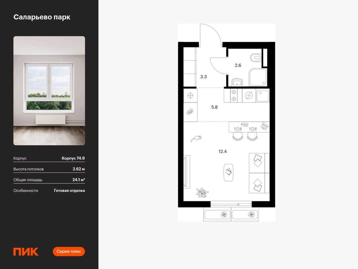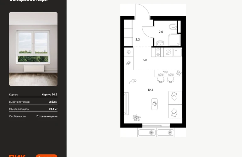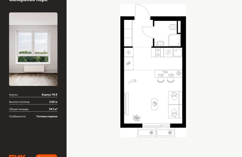 Продаётся квартира-студия площадью 24.10 кв.м на 16 этаже 18 этажного дома (Корпус 74.9, секция 9) проекта ПИК Саларьево парк. Светлый просторный подъезд на уровне земли, функциональная планировка, большие окна, с отделкой. Жилой район «Саларьево парк» расположен в Новой Москве, в четырёх километрах от МКАД по Киевскому шоссе. Две станции метро: «Саларьево» и «Филатов луг» — находятся в пешей доступности от проекта. Дойти до них можно за 5–10 минут. В квартале уже создана качественная среда, где есть абсолютно всё для полноценной жизни, работы и отдыха. «Саларьево парк» — не просто квартал, а полноценный жилой район, который отличается разноплановой архитектурой. Над концепцией квартала работали несколько ведущих архитектурных бюро, которые стремились добиться разнообразия в фасадных решениях. Ярким примером такого подхода станет корпус 83, который относится к «Серии плюс». Новый корпус 83 был создан по принципам южной архитектуры: расслабленный и лаконичный силуэт зданий, привлекающий к себе внимание. Архитектурная изюминка 83-го корпуса — террасы и фигурные балконы. Вместе с окнами и другими акцентными элементами они создают уникальный облик здания, отсылая нас к изысканной южной архитектуре. Все корпуса в квартале гармонично сочетаются, образуя единую городскую среду. Здесь приятно гулять и проводить время на улице всей семьёй. В «Саларьево парке» создана уникальная образовательная среда, включающая в себя шесть школ, рассчитанных на 6 250 учеников. Две из них уже открыты, их посещает 2 300 детей. Также на территории «Саларьево парка» находится 12 детских садов, один из которых с бассейном. Сейчас уже открыты 7 садов. В «Саларьево парке» открыта уникальная игровая площадка — PlayHub «Оригами». Здесь есть ручей, горка-труба и рельефные холмы. Взрослые смогут отдохнуть в уютном кафе, пока дети играют. Также на территории проекта есть SportHub — большая спортивная зона, разделённая по интересам и возрастам. Здесь можно заниматься разными видами спорта: футболом, баскетболом, волейболом и стритболом. Зимой центральную часть площадки превращают в каток. Во дворах-парках жилого квартала есть места для отдыха, детские и спортивные площадки. На первых этажах домов расположены магазины, кафе и полезные сервисы. Также вблизи проекта есть несколько масштабных торговых центров. До ТЦ «Саларис» пять минут пешком, до «Рио», Metro Cash & Carry и «Лемана про» — пять минут на автомобиле. Артикул - 1007448О застройщике
