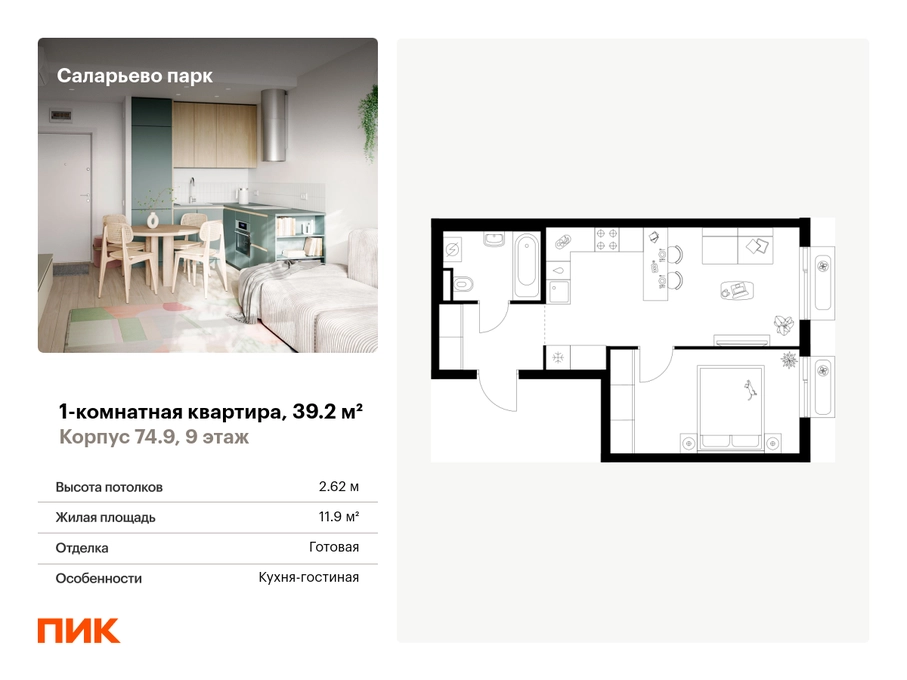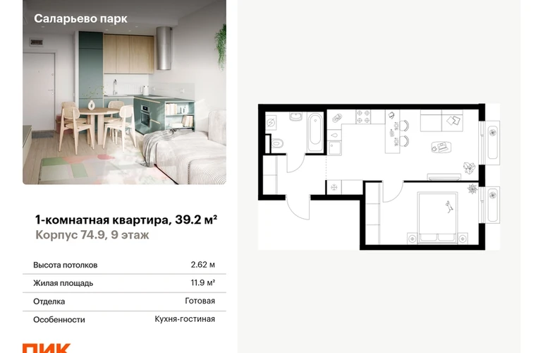 Продаётся 1-комн.квартира площадью 39.20 кв.м на 9 этаже 18 этажного дома (Корпус 74.9, секция 9) проекта ПИК Саларьево парк. Светлый просторный подъезд на уровне земли, функциональная планировка, большие окна, с отделкой. Артикул - 1007348О застройщике