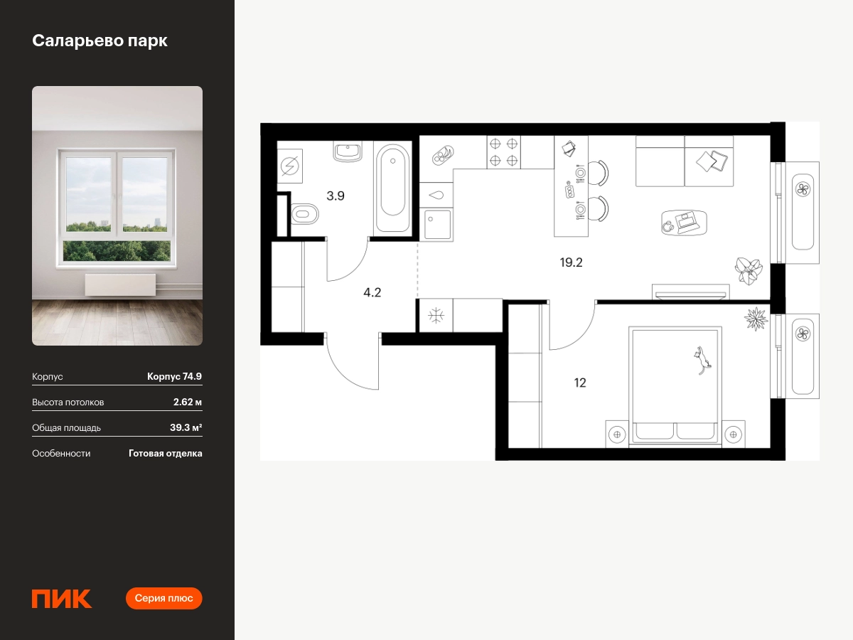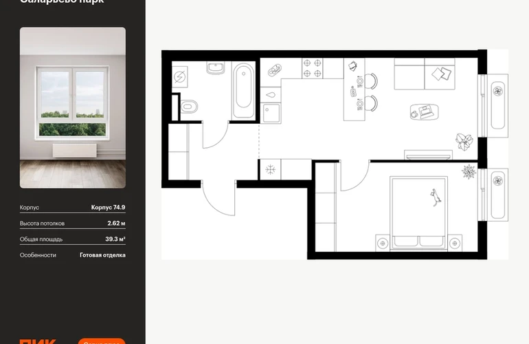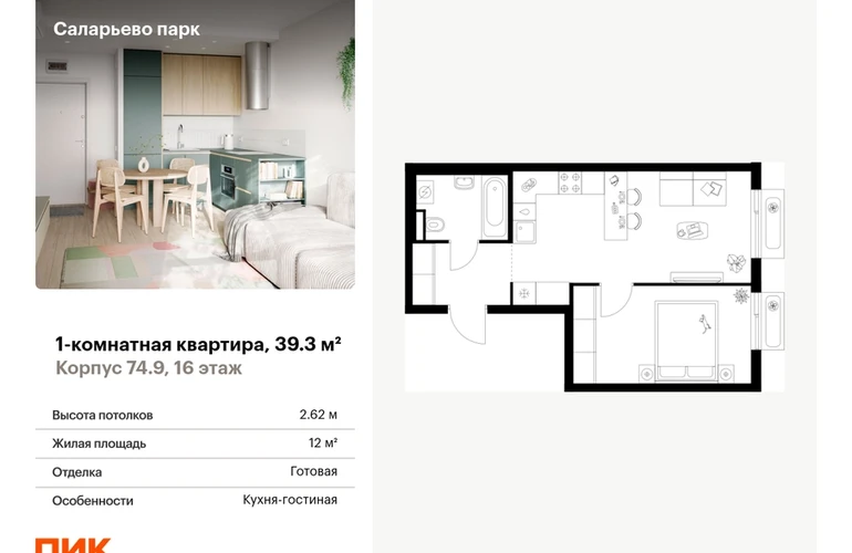Продаётся 1-комн.квартира площадью 39.30 кв.м на 16 этаже 18 этажного дома (Корпус 74.9, секция 9) проекта ПИК Саларьево парк. Светлый просторный подъезд на уровне земли, функциональная планировка, большие окна, с отделкой. <br> <br>Жилой район «Саларьево парк» расположен в Новой Москве, в четырёх километрах от МКАД по Киевскому шоссе. Две станции метро: «Саларьево» и «Филатов луг» — находятся в пешей доступности от проекта. Дойти до них можно за 5–10 минут. В квартале уже создана качественная среда, где есть абсолютно всё для полноценной жизни, работы и отдыха. <br> <br>«Саларьево парк» — не просто квартал, а полноценный жилой район, который отличается разноплановой архитектурой. Над концепцией квартала работали несколько ведущих архитектурных бюро, которые стремились добиться разнообразия в фасадных решениях. Ярким примером такого подхода станет корпус 83, который относится к «Серии плюс». <br> <br>Новый корпус 83 был создан по принципам южной архитектуры: расслабленный и лаконичный силуэт зданий, привлекающий к себе внимание. Архитектурная изюминка 83-го корпуса — террасы и фигурные балконы. Вместе с окнами и другими акцентными элементами они создают уникальный облик здания, отсылая нас к изысканной южной архитектуре. <br> <br>Все корпуса в квартале гармонично сочетаются, образуя единую городскую среду. Здесь приятно гулять и проводить время на улице всей семьёй. <br> <br>В «Саларьево парке» создана уникальная образовательная среда, включающая в себя шесть школ, рассчитанных на 6 250 учеников. Две из них уже открыты, их посещает 2 300 детей. Также на территории «Саларьево парка» находится 12 детских садов, один из которых с бассейном. Сейчас уже открыты 7 садов. <br> <br>В «Саларьево парке» открыта уникальная игровая площадка — PlayHub «Оригами». Здесь есть ручей, горка-труба и рельефные холмы. Взрослые смогут отдохнуть в уютном кафе, пока дети играют. Также на территории проекта есть SportHub — большая спортивная зона, разделённая по интересам и возрастам. Здесь можно заниматься разными видами спорта: футболом, баскетболом, волейболом и стритболом. Зимой центральную часть площадки превращают в каток. <br> <br>Во дворах-парках жилого квартала есть места для отдыха, детские и спортивные площадки. На первых этажах домов расположены магазины, кафе и полезные сервисы. Также вблизи проекта есть несколько масштабных торговых центров. До ТЦ «Саларис» пять минут пешком, до «Рио», Metro Cash & Carry и «Лемана про» — пять минут на автомобиле. Артикул - 1007445О застройщике