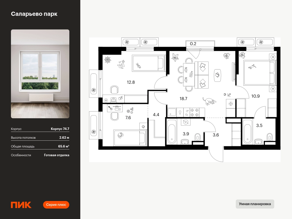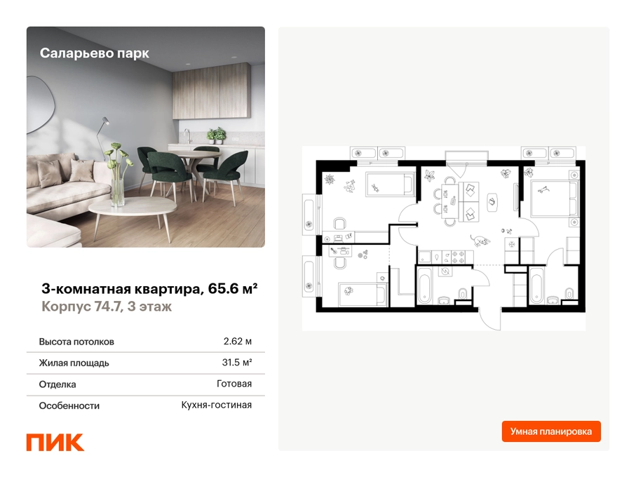 Продаётся 3-комн.квартира площадью 65.60 кв.м на 3 этаже 16 этажного дома (Корпус 74.7, секция 7) проекта ПИК Саларьево парк. Светлый просторный подъезд на уровне земли, функциональная планировка, большие окна, с отделкой. Жилой район «Саларьево парк» расположен в Новой Москве, в четырёх километрах от МКАД по Киевскому шоссе. Две станции метро: «Саларьево» и «Филатов луг» — находятся в пешей доступности от проекта. Дойти до них можно за 5–10 минут. В квартале уже создана качественная среда, где есть абсолютно всё для полноценной жизни, работы и отдыха. «Саларьево парк» — не просто квартал, а полноценный жилой район, который отличается разноплановой архитектурой. Над концепцией квартала работали несколько ведущих архитектурных бюро, которые стремились добиться разнообразия в фасадных решениях. Ярким примером такого подхода станет корпус 83, который относится к «Серии плюс». Новый корпус 83 был создан по принципам южной архитектуры: расслабленный и лаконичный силуэт зданий, привлекающий к себе внимание. Архитектурная изюминка 83-го корпуса — террасы и фигурные балконы. Вместе с окнами и другими акцентными элементами они создают уникальный облик здания, отсылая нас к изысканной южной архитектуре. Все корпуса в квартале гармонично сочетаются, образуя единую городскую среду. Здесь приятно гулять и проводить время на улице всей семьёй. В «Саларьево парке» создана уникальная образовательная среда, включающая в себя шесть школ, рассчитанных на 6 250 учеников. Две из них уже открыты, их посещает 2 300 детей. Также на территории «Саларьево парка» находится 12 детских садов, один из которых с бассейном. Сейчас уже открыты 7 садов. В «Саларьево парке» открыта уникальная игровая площадка — PlayHub «Оригами». Здесь есть ручей, горка-труба и рельефные холмы. Взрослые смогут отдохнуть в уютном кафе, пока дети играют. Также на территории проекта есть SportHub — большая спортивная зона, разделённая по интересам и возрастам. Здесь можно заниматься разными видами спорта: футболом, баскетболом, волейболом и стритболом. Зимой центральную часть площадки превращают в каток. Во дворах-парках жилого квартала есть места для отдыха, детские и спортивные площадки. На первых этажах домов расположены магазины, кафе и полезные сервисы. Также вблизи проекта есть несколько масштабных торговых центров. До ТЦ «Саларис» пять минут пешком, до «Рио», Metro Cash & Carry и «Лемана про» — пять минут на автомобиле. Артикул - 1006984О застройщике
