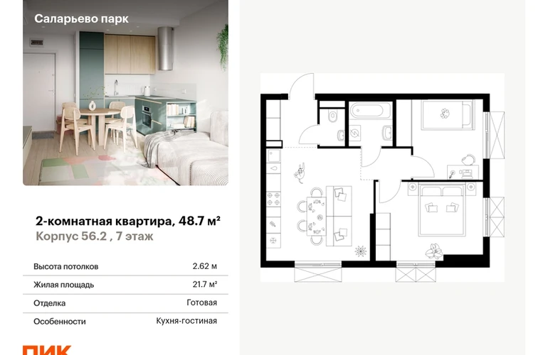 Продаётся 2-комн.квартира площадью 48.70 кв.м на 7 этаже 22 этажного дома (Корпус 56.2 , секция 3) проекта ПИК Саларьево парк. Светлый просторный подъезд на уровне земли, функциональная планировка, большие окна, с отделкой. <br> <br>Жилой район «Саларьево парк» расположен в Новой Москве, в четырёх километрах от МКАД по Киевскому шоссе. Две станции метро: «Саларьево» и «Филатов луг» — находятся в пешей доступности от проекта. Дойти до них можно за 5–10 минут. В квартале уже создана качественная среда, где есть абсолютно всё для полноценной жизни, работы и отдыха. <br> <br>«Саларьево парк» — не просто квартал, а полноценный жилой район, который отличается разноплановой архитектурой. Над концепцией квартала работали несколько ведущих архитектурных бюро, которые стремились добиться разнообразия в фасадных решениях. Ярким примером такого подхода станет корпус 83, который относится к «Серии плюс». <br> <br>Новый корпус 83 был создан по принципам южной архитектуры: расслабленный и лаконичный силуэт зданий, привлекающий к себе внимание. Архитектурная изюминка 83-го корпуса — террасы и фигурные балконы. Вместе с окнами и другими акцентными элементами они создают уникальный облик здания, отсылая нас к изысканной южной архитектуре. <br> <br>Все корпуса в квартале гармонично сочетаются, образуя единую городскую среду. Здесь приятно гулять и проводить время на улице всей семьёй. <br> <br>В «Саларьево парке» создана уникальная образовательная среда, включающая в себя шесть школ, рассчитанных на 6 250 учеников. Две из них уже открыты, их посещает 2 300 детей. Также на территории «Саларьево парка» находится 12 детских садов, один из которых с бассейном. Сейчас уже открыты 7 садов. <br> <br>В «Саларьево парке» открыта уникальная игровая площадка — PlayHub «Оригами». Здесь есть ручей, горка-труба и рельефные холмы. Взрослые смогут отдохнуть в уютном кафе, пока дети играют. Также на территории проекта есть SportHub — большая спортивная зона, разделённая по интересам и возрастам. Здесь можно заниматься разными видами спорта: футболом, баскетболом, волейболом и стритболом. Зимой центральную часть площадки превращают в каток. <br> <br>Во дворах-парках жилого квартала есть места для отдыха, детские и спортивные площадки. На первых этажах домов расположены магазины, кафе и полезные сервисы. Также вблизи проекта есть несколько масштабных торговых центров. До ТЦ «Саларис» пять минут пешком, до «Рио», Metro Cash & Carry и «Леруа Мерлен» — пять минут на автомобиле. Артикул - 990388О застройщике