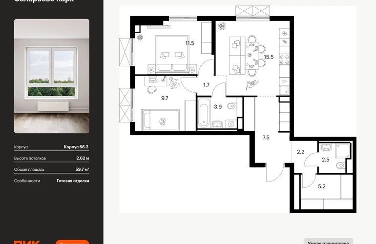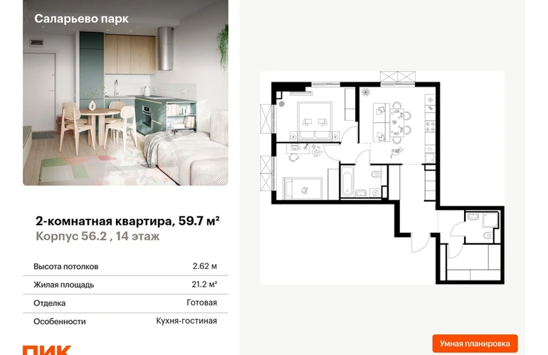 Продаётся 2-комн.квартира площадью 59.70 кв.м на 14 этаже 22 этажного дома (Корпус 56.2 , секция 2) проекта ПИК Саларьево парк. Светлый просторный подъезд на уровне земли, функциональная планировка, большие окна, с отделкой. <br> <br>Жилой район «Саларьево парк» расположен в Новой Москве, в четырёх километрах от МКАД по Киевскому шоссе. Две станции метро: «Саларьево» и «Филатов луг» — находятся в пешей доступности от проекта. Дойти до них можно за 5–10 минут. В квартале уже создана качественная среда, где есть абсолютно всё для полноценной жизни, работы и отдыха. <br> <br>«Саларьево парк» — не просто квартал, а полноценный жилой район, который отличается разноплановой архитектурой. Над концепцией квартала работали несколько ведущих архитектурных бюро, которые стремились добиться разнообразия в фасадных решениях. Ярким примером такого подхода станет корпус 83, который относится к «Серии плюс». <br> <br>Новый корпус 83 был создан по принципам южной архитектуры: расслабленный и лаконичный силуэт зданий, привлекающий к себе внимание. Архитектурная изюминка 83-го корпуса — террасы и фигурные балконы. Вместе с окнами и другими акцентными элементами они создают уникальный облик здания, отсылая нас к изысканной южной архитектуре. <br> <br>Все корпуса в квартале гармонично сочетаются, образуя единую городскую среду. Здесь приятно гулять и проводить время на улице всей семьёй. <br> <br>В «Саларьево парке» создана уникальная образовательная среда, включающая в себя шесть школ, рассчитанных на 6 250 учеников. Две из них уже открыты, их посещает 2 300 детей. Также на территории «Саларьево парка» находится 12 детских садов, один из которых с бассейном. Сейчас уже открыты 7 садов. <br> <br>В «Саларьево парке» открыта уникальная игровая площадка — PlayHub «Оригами». Здесь есть ручей, горка-труба и рельефные холмы. Взрослые смогут отдохнуть в уютном кафе, пока дети играют. Также на территории проекта есть SportHub — большая спортивная зона, разделённая по интересам и возрастам. Здесь можно заниматься разными видами спорта: футболом, баскетболом, волейболом и стритболом. Зимой центральную часть площадки превращают в каток. <br> <br>Во дворах-парках жилого квартала есть места для отдыха, детские и спортивные площадки. На первых этажах домов расположены магазины, кафе и полезные сервисы. Также вблизи проекта есть несколько масштабных торговых центров. До ТЦ «Саларис» пять минут пешком, до «Рио», Metro Cash & Carry и «Лемана про» — пять минут на автомобиле. Артикул - 990869О застройщике
