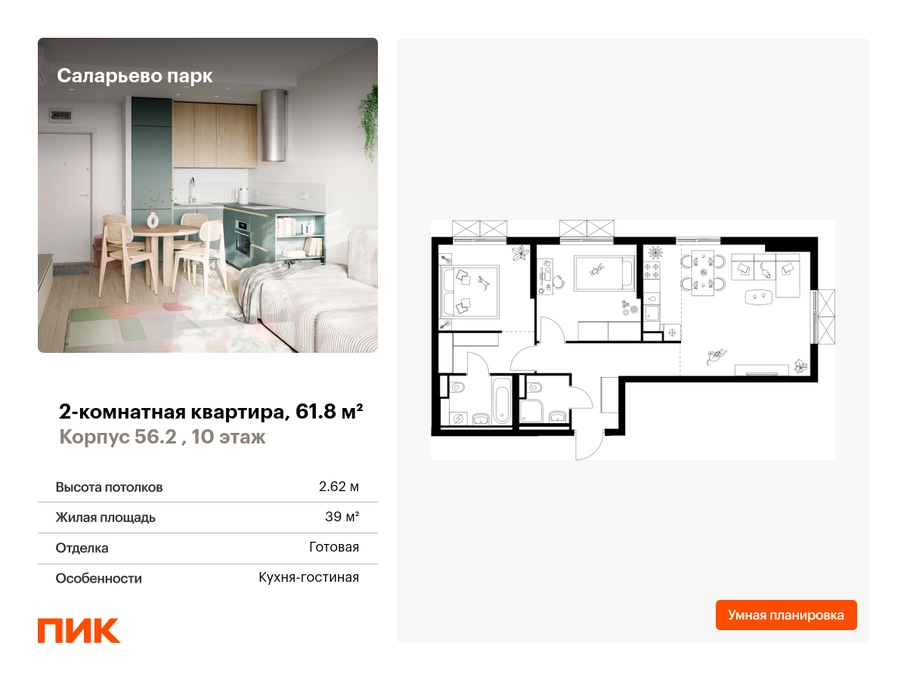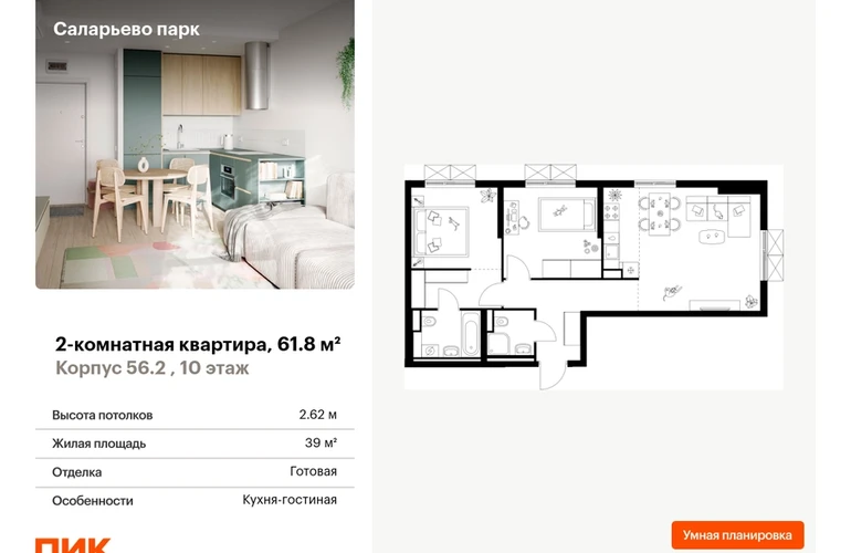 Продаётся 2-комн.квартира площадью 61.80 кв.м на 10 этаже 22 этажного дома (Корпус 56.2 , секция 2) проекта ПИК Саларьево парк. Светлый просторный подъезд на уровне земли, функциональная планировка, большие окна, с отделкой. <br> <br>Жилой район «Саларьево парк» расположен в Новой Москве, в четырёх километрах от МКАД по Киевскому шоссе. Две станции метро: «Саларьево» и «Филатов луг» — находятся в пешей доступности от проекта. Дойти до них можно за 5–10 минут. В квартале уже создана качественная среда, где есть абсолютно всё для полноценной жизни, работы и отдыха. <br> <br>«Саларьево парк» — не просто квартал, а полноценный жилой район, который отличается разноплановой архитектурой. Над концепцией квартала работали несколько ведущих архитектурных бюро, которые стремились добиться разнообразия в фасадных решениях. Ярким примером такого подхода станет корпус 83, который относится к «Серии плюс». <br> <br>Новый корпус 83 был создан по принципам южной архитектуры: расслабленный и лаконичный силуэт зданий, привлекающий к себе внимание. Архитектурная изюминка 83-го корпуса — террасы и фигурные балконы. Вместе с окнами и другими акцентными элементами они создают уникальный облик здания, отсылая нас к изысканной южной архитектуре. <br> <br>Все корпуса в квартале гармонично сочетаются, образуя единую городскую среду. Здесь приятно гулять и проводить время на улице всей семьёй. <br> <br>В «Саларьево парке» создана уникальная образовательная среда, включающая в себя шесть школ, рассчитанных на 6 250 учеников. Две из них уже открыты, их посещает 2 300 детей. Также на территории «Саларьево парка» находится 12 детских садов, один из которых с бассейном. Сейчас уже открыты 7 садов. <br> <br>В «Саларьево парке» открыта уникальная игровая площадка — PlayHub «Оригами». Здесь есть ручей, горка-труба и рельефные холмы. Взрослые смогут отдохнуть в уютном кафе, пока дети играют. Также на территории проекта есть SportHub — большая спортивная зона, разделённая по интересам и возрастам. Здесь можно заниматься разными видами спорта: футболом, баскетболом, волейболом и стритболом. Зимой центральную часть площадки превращают в каток. <br> <br>Во дворах-парках жилого квартала есть места для отдыха, детские и спортивные площадки. На первых этажах домов расположены магазины, кафе и полезные сервисы. Также вблизи проекта есть несколько масштабных торговых центров. До ТЦ «Саларис» пять минут пешком, до «Рио», Metro Cash & Carry и «Леруа Мерлен» — пять минут на автомобиле. Артикул - 990765О застройщике