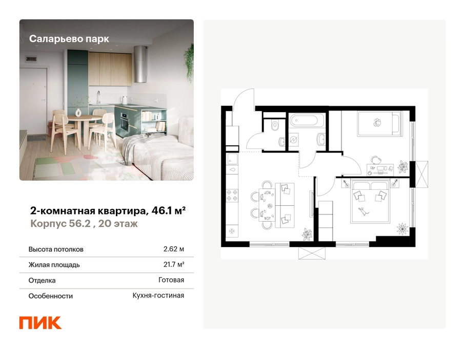 Продаётся 2-комн.квартира площадью 46.10 кв.м на 20 этаже 22 этажного дома (Корпус 56.2 , секция 3) проекта ПИК Саларьево парк. Светлый просторный подъезд на уровне земли, функциональная планировка, большие окна, с отделкой. <br> <br>Жилой район «Саларьево парк» расположен в Новой Москве, в четырёх километрах от МКАД по Киевскому шоссе. Две станции метро: «Саларьево» и «Филатов луг» — находятся в пешей доступности от проекта. Дойти до них можно за 5–10 минут. В квартале уже создана качественная среда, где есть абсолютно всё для полноценной жизни, работы и отдыха. <br> <br>«Саларьево парк» — не просто квартал, а полноценный жилой район, который отличается разноплановой архитектурой. Над концепцией квартала работали несколько ведущих архитектурных бюро, которые стремились добиться разнообразия в фасадных решениях. Ярким примером такого подхода станет корпус 83, который относится к «Серии плюс». <br> <br>Новый корпус 83 был создан по принципам южной архитектуры: расслабленный и лаконичный силуэт зданий, привлекающий к себе внимание. Архитектурная изюминка 83-го корпуса — террасы и фигурные балконы. Вместе с окнами и другими акцентными элементами они создают уникальный облик здания, отсылая нас к изысканной южной архитектуре. <br> <br>Все корпуса в квартале гармонично сочетаются, образуя единую городскую среду. Здесь приятно гулять и проводить время на улице всей семьёй. <br> <br>В «Саларьево парке» создана уникальная образовательная среда, включающая в себя шесть школ, рассчитанных на 6 250 учеников. Две из них уже открыты, их посещает 2 300 детей. Также на территории «Саларьево парка» находится 12 детских садов, один из которых с бассейном. Сейчас уже открыты 7 садов. <br> <br>В «Саларьево парке» открыта уникальная игровая площадка — PlayHub «Оригами». Здесь есть ручей, горка-труба и рельефные холмы. Взрослые смогут отдохнуть в уютном кафе, пока дети играют. Также на территории проекта есть SportHub — большая спортивная зона, разделённая по интересам и возрастам. Здесь можно заниматься разными видами спорта: футболом, баскетболом, волейболом и стритболом. Зимой центральную часть площадки превращают в каток. <br> <br>Во дворах-парках жилого квартала есть места для отдыха, детские и спортивные площадки. На первых этажах домов расположены магазины, кафе и полезные сервисы. Также вблизи проекта есть несколько масштабных торговых центров. До ТЦ «Саларис» пять минут пешком, до «Рио», Metro Cash & Carry и «Леруа Мерлен» — пять минут на автомобиле. Артикул - 990752О застройщике