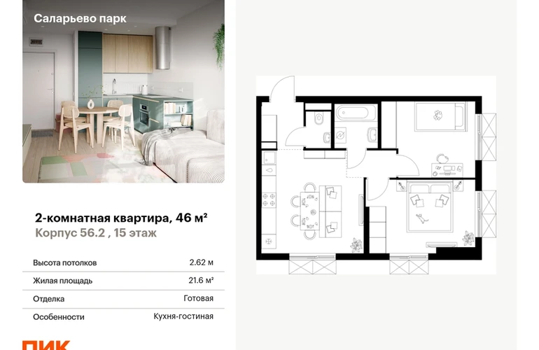 Продаётся 2-комн.квартира площадью 46.00 кв.м на 15 этаже 22 этажного дома (Корпус 56.2 , секция 1) проекта ПИК Саларьево парк. Светлый просторный подъезд на уровне земли, функциональная планировка, большие окна, с отделкой. <br> <br>Жилой район «Саларьево парк» расположен в Новой Москве, в четырёх километрах от МКАД по Киевскому шоссе. Две станции метро: «Саларьево» и «Филатов луг» — находятся в пешей доступности от проекта. Дойти до них можно за 5–10 минут. В квартале уже создана качественная среда, где есть абсолютно всё для полноценной жизни, работы и отдыха. <br> <br>«Саларьево парк» — не просто квартал, а полноценный жилой район, который отличается разноплановой архитектурой. Над концепцией квартала работали несколько ведущих архитектурных бюро, которые стремились добиться разнообразия в фасадных решениях. Ярким примером такого подхода станет корпус 83, который относится к «Серии плюс». <br> <br>Новый корпус 83 был создан по принципам южной архитектуры: расслабленный и лаконичный силуэт зданий, привлекающий к себе внимание. Архитектурная изюминка 83-го корпуса — террасы и фигурные балконы. Вместе с окнами и другими акцентными элементами они создают уникальный облик здания, отсылая нас к изысканной южной архитектуре. <br> <br>Все корпуса в квартале гармонично сочетаются, образуя единую городскую среду. Здесь приятно гулять и проводить время на улице всей семьёй. <br> <br>В «Саларьево парке» создана уникальная образовательная среда, включающая в себя шесть школ, рассчитанных на 6 250 учеников. Две из них уже открыты, их посещает 2 300 детей. Также на территории «Саларьево парка» находится 12 детских садов, один из которых с бассейном. Сейчас уже открыты 7 садов. <br> <br>В «Саларьево парке» открыта уникальная игровая площадка — PlayHub «Оригами». Здесь есть ручей, горка-труба и рельефные холмы. Взрослые смогут отдохнуть в уютном кафе, пока дети играют. Также на территории проекта есть SportHub — большая спортивная зона, разделённая по интересам и возрастам. Здесь можно заниматься разными видами спорта: футболом, баскетболом, волейболом и стритболом. Зимой центральную часть площадки превращают в каток. <br> <br>Во дворах-парках жилого квартала есть места для отдыха, детские и спортивные площадки. На первых этажах домов расположены магазины, кафе и полезные сервисы. Также вблизи проекта есть несколько масштабных торговых центров. До ТЦ «Саларис» пять минут пешком, до «Рио», Metro Cash & Carry и «Леруа Мерлен» — пять минут на автомобиле. Артикул - 990188О застройщике