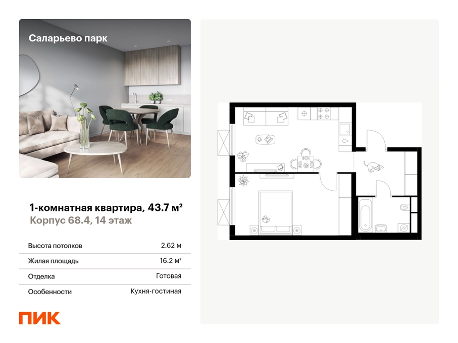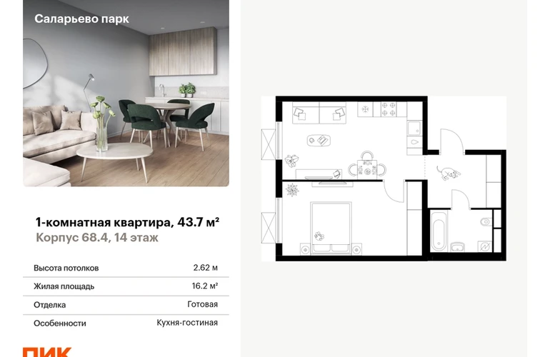 Продаётся 1-комн.квартира площадью 43.70 кв.м на 14 этаже 24 этажного дома (Корпус 68.4, секция 1) проекта ПИК Саларьево парк. Светлый просторный подъезд на уровне земли, функциональная планировка, большие окна, с отделкой. <br> <br>Жилой район «Саларьево парк» расположен в Новой Москве, в четырёх километрах от МКАД по Киевскому шоссе. Две станции метро: «Саларьево» и «Филатов луг» — находятся в пешей доступности от проекта. Дойти до них можно за 5–10 минут. В квартале уже создана качественная среда, где есть абсолютно всё для полноценной жизни, работы и отдыха. <br> <br>«Саларьево парк» — не просто квартал, а полноценный жилой район, который отличается разноплановой архитектурой. Над концепцией квартала работали несколько ведущих архитектурных бюро, которые стремились добиться разнообразия в фасадных решениях. Ярким примером такого подхода станет корпус 83, который относится к «Серии плюс». <br> <br>Новый корпус 83 был создан по принципам южной архитектуры: расслабленный и лаконичный силуэт зданий, привлекающий к себе внимание. Архитектурная изюминка 83-го корпуса — террасы и фигурные балконы. Вместе с окнами и другими акцентными элементами они создают уникальный облик здания, отсылая нас к изысканной южной архитектуре. <br> <br>Все корпуса в квартале гармонично сочетаются, образуя единую городскую среду. Здесь приятно гулять и проводить время на улице всей семьёй. <br> <br>В «Саларьево парке» создана уникальная образовательная среда, включающая в себя шесть школ, рассчитанных на 6 250 учеников. Две из них уже открыты, их посещает 2 300 детей. Также на территории «Саларьево парка» находится 12 детских садов, один из которых с бассейном. Сейчас уже открыты 7 садов. <br> <br>В «Саларьево парке» открыта уникальная игровая площадка — PlayHub «Оригами». Здесь есть ручей, горка-труба и рельефные холмы. Взрослые смогут отдохнуть в уютном кафе, пока дети играют. Также на территории проекта есть SportHub — большая спортивная зона, разделённая по интересам и возрастам. Здесь можно заниматься разными видами спорта: футболом, баскетболом, волейболом и стритболом. Зимой центральную часть площадки превращают в каток. <br> <br>Во дворах-парках жилого квартала есть места для отдыха, детские и спортивные площадки. На первых этажах домов расположены магазины, кафе и полезные сервисы. Также вблизи проекта есть несколько масштабных торговых центров. До ТЦ «Саларис» пять минут пешком, до «Рио», Metro Cash & Carry и «Лемана про» — пять минут на автомобиле. Артикул - 867248О застройщике