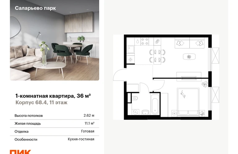 Продаётся 1-комн.квартира площадью 36.00 кв.м на 11 этаже 24 этажного дома (Корпус 68.4, секция 1) проекта ПИК Саларьево парк. Светлый просторный подъезд на уровне земли, функциональная планировка, большие окна, с отделкой. <br> <br>Жилой район «Саларьево парк» расположен в Новой Москве, в четырёх километрах от МКАД по Киевскому шоссе. Две станции метро: «Саларьево» и «Филатов луг» — находятся в пешей доступности от проекта. Дойти до них можно за 5–10 минут. В квартале уже создана качественная среда, где есть абсолютно всё для полноценной жизни, работы и отдыха. <br> <br>«Саларьево парк» — не просто квартал, а полноценный жилой район, который отличается разноплановой архитектурой. Над концепцией квартала работали несколько ведущих архитектурных бюро, которые стремились добиться разнообразия в фасадных решениях. Ярким примером такого подхода станет корпус 83, который относится к «Серии плюс». <br> <br>Новый корпус 83 был создан по принципам южной архитектуры: расслабленный и лаконичный силуэт зданий, привлекающий к себе внимание. Архитектурная изюминка 83-го корпуса — террасы и фигурные балконы. Вместе с окнами и другими акцентными элементами они создают уникальный облик здания, отсылая нас к изысканной южной архитектуре. <br> <br>Все корпуса в квартале гармонично сочетаются, образуя единую городскую среду. Здесь приятно гулять и проводить время на улице всей семьёй. <br> <br>В «Саларьево парке» создана уникальная образовательная среда, включающая в себя шесть школ, рассчитанных на 6 250 учеников. Две из них уже открыты, их посещает 2 300 детей. Также на территории «Саларьево парка» находится 12 детских садов, один из которых с бассейном. Сейчас уже открыты 7 садов. <br> <br>В «Саларьево парке» открыта уникальная игровая площадка — PlayHub «Оригами». Здесь есть ручей, горка-труба и рельефные холмы. Взрослые смогут отдохнуть в уютном кафе, пока дети играют. Также на территории проекта есть SportHub — большая спортивная зона, разделённая по интересам и возрастам. Здесь можно заниматься разными видами спорта: футболом, баскетболом, волейболом и стритболом. Зимой центральную часть площадки превращают в каток. <br> <br>Во дворах-парках жилого квартала есть места для отдыха, детские и спортивные площадки. На первых этажах домов расположены магазины, кафе и полезные сервисы. Также вблизи проекта есть несколько масштабных торговых центров. До ТЦ «Саларис» пять минут пешком, до «Рио», Metro Cash & Carry и «Леруа Мерлен» — пять минут на автомобиле. Артикул - 867151О застройщике