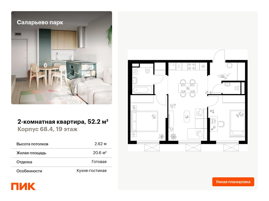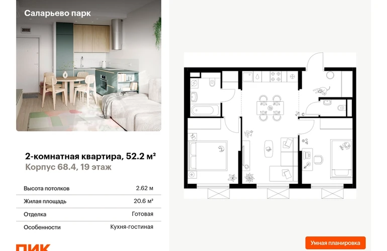 Продаётся 2-комн.квартира площадью 52.20 кв.м на 19 этаже 24 этажного дома (Корпус 68.4, секция 1) проекта ПИК Саларьево парк. Светлый просторный подъезд на уровне земли, функциональная планировка, большие окна, с отделкой. <br> <br>Жилой район «Саларьево парк» расположен в Новой Москве, в четырёх километрах от МКАД по Киевскому шоссе. Две станции метро: «Саларьево» и «Филатов луг» — находятся в пешей доступности от проекта. Дойти до них можно за 5–10 минут. В квартале уже создана качественная среда, где есть абсолютно всё для полноценной жизни, работы и отдыха. <br> <br>«Саларьево парк» — не просто квартал, а полноценный жилой район, который отличается разноплановой архитектурой. Над концепцией квартала работали несколько ведущих архитектурных бюро, которые стремились добиться разнообразия в фасадных решениях. Ярким примером такого подхода станет корпус 83, который относится к «Серии плюс». <br> <br>Новый корпус 83 был создан по принципам южной архитектуры: расслабленный и лаконичный силуэт зданий, привлекающий к себе внимание. Архитектурная изюминка 83-го корпуса — террасы и фигурные балконы. Вместе с окнами и другими акцентными элементами они создают уникальный облик здания, отсылая нас к изысканной южной архитектуре. <br> <br>Все корпуса в квартале гармонично сочетаются, образуя единую городскую среду. Здесь приятно гулять и проводить время на улице всей семьёй. <br> <br>В «Саларьево парке» создана уникальная образовательная среда, включающая в себя шесть школ, рассчитанных на 6 250 учеников. Две из них уже открыты, их посещает 2 300 детей. Также на территории «Саларьево парка» находится 12 детских садов, один из которых с бассейном. Сейчас уже открыты 7 садов. <br> <br>В «Саларьево парке» открыта уникальная игровая площадка — PlayHub «Оригами». Здесь есть ручей, горка-труба и рельефные холмы. Взрослые смогут отдохнуть в уютном кафе, пока дети играют. Также на территории проекта есть SportHub — большая спортивная зона, разделённая по интересам и возрастам. Здесь можно заниматься разными видами спорта: футболом, баскетболом, волейболом и стритболом. Зимой центральную часть площадки превращают в каток. <br> <br>Во дворах-парках жилого квартала есть места для отдыха, детские и спортивные площадки. На первых этажах домов расположены магазины, кафе и полезные сервисы. Также вблизи проекта есть несколько масштабных торговых центров. До ТЦ «Саларис» пять минут пешком, до «Рио», Metro Cash & Carry и «Лемана про» — пять минут на автомобиле. Артикул - 867492О застройщике