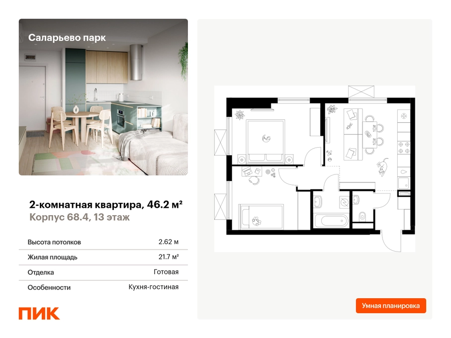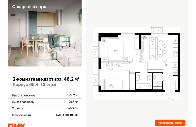 Продаётся 2-комн.квартира площадью 46.20 кв.м на 13 этаже 24 этажного дома (Корпус 68.4, секция 1) проекта ПИК Саларьево парк. Светлый просторный подъезд на уровне земли, функциональная планировка, большие окна, с отделкой. <br> <br>Жилой район «Саларьево парк» расположен в Новой Москве, в четырёх километрах от МКАД по Киевскому шоссе. Две станции метро: «Саларьево» и «Филатов луг» — находятся в пешей доступности от проекта. Дойти до них можно за 5–10 минут. В квартале уже создана качественная среда, где есть абсолютно всё для полноценной жизни, работы и отдыха. <br> <br>«Саларьево парк» — не просто квартал, а полноценный жилой район, который отличается разноплановой архитектурой. Над концепцией квартала работали несколько ведущих архитектурных бюро, которые стремились добиться разнообразия в фасадных решениях. Ярким примером такого подхода станет корпус 83, который относится к «Серии плюс». <br> <br>Новый корпус 83 был создан по принципам южной архитектуры: расслабленный и лаконичный силуэт зданий, привлекающий к себе внимание. Архитектурная изюминка 83-го корпуса — террасы и фигурные балконы. Вместе с окнами и другими акцентными элементами они создают уникальный облик здания, отсылая нас к изысканной южной архитектуре. <br> <br>Все корпуса в квартале гармонично сочетаются, образуя единую городскую среду. Здесь приятно гулять и проводить время на улице всей семьёй. <br> <br>В «Саларьево парке» создана уникальная образовательная среда, включающая в себя шесть школ, рассчитанных на 6 250 учеников. Две из них уже открыты, их посещает 2 300 детей. Также на территории «Саларьево парка» находится 12 детских садов, один из которых с бассейном. Сейчас уже открыты 7 садов. <br> <br>В «Саларьево парке» открыта уникальная игровая площадка — PlayHub «Оригами». Здесь есть ручей, горка-труба и рельефные холмы. Взрослые смогут отдохнуть в уютном кафе, пока дети играют. Также на территории проекта есть SportHub — большая спортивная зона, разделённая по интересам и возрастам. Здесь можно заниматься разными видами спорта: футболом, баскетболом, волейболом и стритболом. Зимой центральную часть площадки превращают в каток. <br> <br>Во дворах-парках жилого квартала есть места для отдыха, детские и спортивные площадки. На первых этажах домов расположены магазины, кафе и полезные сервисы. Также вблизи проекта есть несколько масштабных торговых центров. До ТЦ «Саларис» пять минут пешком, до «Рио», Metro Cash & Carry и «Лемана про» — пять минут на автомобиле. Артикул - 867246О застройщике