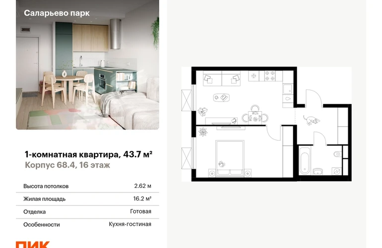 Продаётся 1-комн.квартира площадью 43.70 кв.м на 16 этаже 24 этажного дома (Корпус 68.4, секция 1) проекта ПИК Саларьево парк. Светлый просторный подъезд на уровне земли, функциональная планировка, большие окна, с отделкой. <br> <br>Жилой район «Саларьево парк» расположен в Новой Москве, в четырёх километрах от МКАД по Киевскому шоссе. Две станции метро: «Саларьево» и «Филатов луг» — находятся в пешей доступности от проекта. Дойти до них можно за 5–10 минут. В квартале уже создана качественная среда, где есть абсолютно всё для полноценной жизни, работы и отдыха. <br> <br>«Саларьево парк» — не просто квартал, а полноценный жилой район, который отличается разноплановой архитектурой. Над концепцией квартала работали несколько ведущих архитектурных бюро, которые стремились добиться разнообразия в фасадных решениях. Ярким примером такого подхода станет корпус 83, который относится к «Серии плюс». <br> <br>Новый корпус 83 был создан по принципам южной архитектуры: расслабленный и лаконичный силуэт зданий, привлекающий к себе внимание. Архитектурная изюминка 83-го корпуса — террасы и фигурные балконы. Вместе с окнами и другими акцентными элементами они создают уникальный облик здания, отсылая нас к изысканной южной архитектуре. <br> <br>Все корпуса в квартале гармонично сочетаются, образуя единую городскую среду. Здесь приятно гулять и проводить время на улице всей семьёй. <br> <br>В «Саларьево парке» создана уникальная образовательная среда, включающая в себя шесть школ, рассчитанных на 6 250 учеников. Две из них уже открыты, их посещает 2 300 детей. Также на территории «Саларьево парка» находится 12 детских садов, один из которых с бассейном. Сейчас уже открыты 7 садов. <br> <br>В «Саларьево парке» открыта уникальная игровая площадка — PlayHub «Оригами». Здесь есть ручей, горка-труба и рельефные холмы. Взрослые смогут отдохнуть в уютном кафе, пока дети играют. Также на территории проекта есть SportHub — большая спортивная зона, разделённая по интересам и возрастам. Здесь можно заниматься разными видами спорта: футболом, баскетболом, волейболом и стритболом. Зимой центральную часть площадки превращают в каток. <br> <br>Во дворах-парках жилого квартала есть места для отдыха, детские и спортивные площадки. На первых этажах домов расположены магазины, кафе и полезные сервисы. Также вблизи проекта есть несколько масштабных торговых центров. До ТЦ «Саларис» пять минут пешком, до «Рио», Metro Cash & Carry и «Леруа Мерлен» — пять минут на автомобиле. Артикул - 867320О застройщике