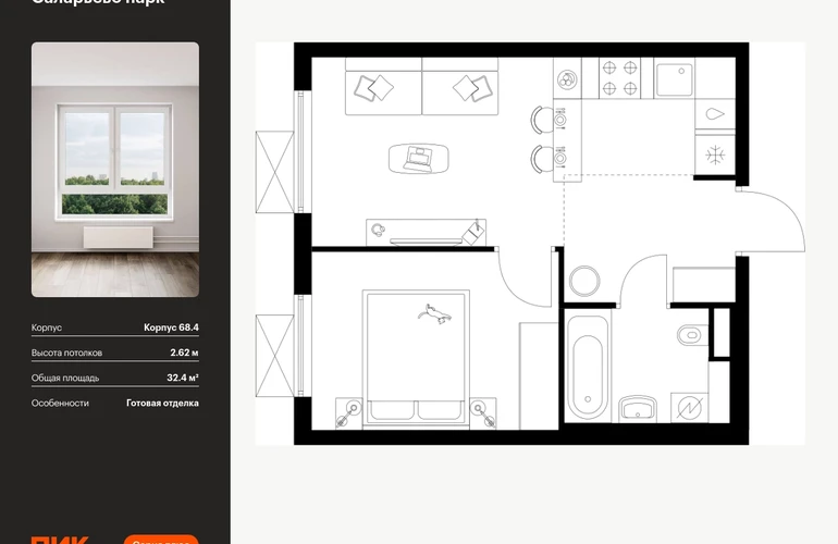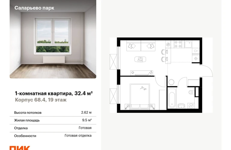 Продаётся 1-комн.квартира площадью 32.40 кв.м на 19 этаже 24 этажного дома (Корпус 68.4, секция 1) проекта ПИК Саларьево парк. Светлый просторный подъезд на уровне земли, функциональная планировка, большие окна, с отделкой. <br> <br>Жилой район «Саларьево парк» расположен в Новой Москве, в четырёх километрах от МКАД по Киевскому шоссе. Две станции метро: «Саларьево» и «Филатов луг» — находятся в пешей доступности от проекта. Дойти до них можно за 5–10 минут. В квартале уже создана качественная среда, где есть абсолютно всё для полноценной жизни, работы и отдыха. <br> <br>«Саларьево парк» — не просто квартал, а полноценный жилой район, который отличается разноплановой архитектурой. Над концепцией квартала работали несколько ведущих архитектурных бюро, которые стремились добиться разнообразия в фасадных решениях. Ярким примером такого подхода станет корпус 83, который относится к «Серии плюс». <br> <br>Новый корпус 83 был создан по принципам южной архитектуры: расслабленный и лаконичный силуэт зданий, привлекающий к себе внимание. Архитектурная изюминка 83-го корпуса — террасы и фигурные балконы. Вместе с окнами и другими акцентными элементами они создают уникальный облик здания, отсылая нас к изысканной южной архитектуре. <br> <br>Все корпуса в квартале гармонично сочетаются, образуя единую городскую среду. Здесь приятно гулять и проводить время на улице всей семьёй. <br> <br>В «Саларьево парке» создана уникальная образовательная среда, включающая в себя шесть школ, рассчитанных на 6 250 учеников. Две из них уже открыты, их посещает 2 300 детей. Также на территории «Саларьево парка» находится 12 детских садов, один из которых с бассейном. Сейчас уже открыты 7 садов. <br> <br>В «Саларьево парке» открыта уникальная игровая площадка — PlayHub «Оригами». Здесь есть ручей, горка-труба и рельефные холмы. Взрослые смогут отдохнуть в уютном кафе, пока дети играют. Также на территории проекта есть SportHub — большая спортивная зона, разделённая по интересам и возрастам. Здесь можно заниматься разными видами спорта: футболом, баскетболом, волейболом и стритболом. Зимой центральную часть площадки превращают в каток. <br> <br>Во дворах-парках жилого квартала есть места для отдыха, детские и спортивные площадки. На первых этажах домов расположены магазины, кафе и полезные сервисы. Также вблизи проекта есть несколько масштабных торговых центров. До ТЦ «Саларис» пять минут пешком, до «Рио», Metro Cash & Carry и «Лемана про» — пять минут на автомобиле. Артикул - 867478О застройщике