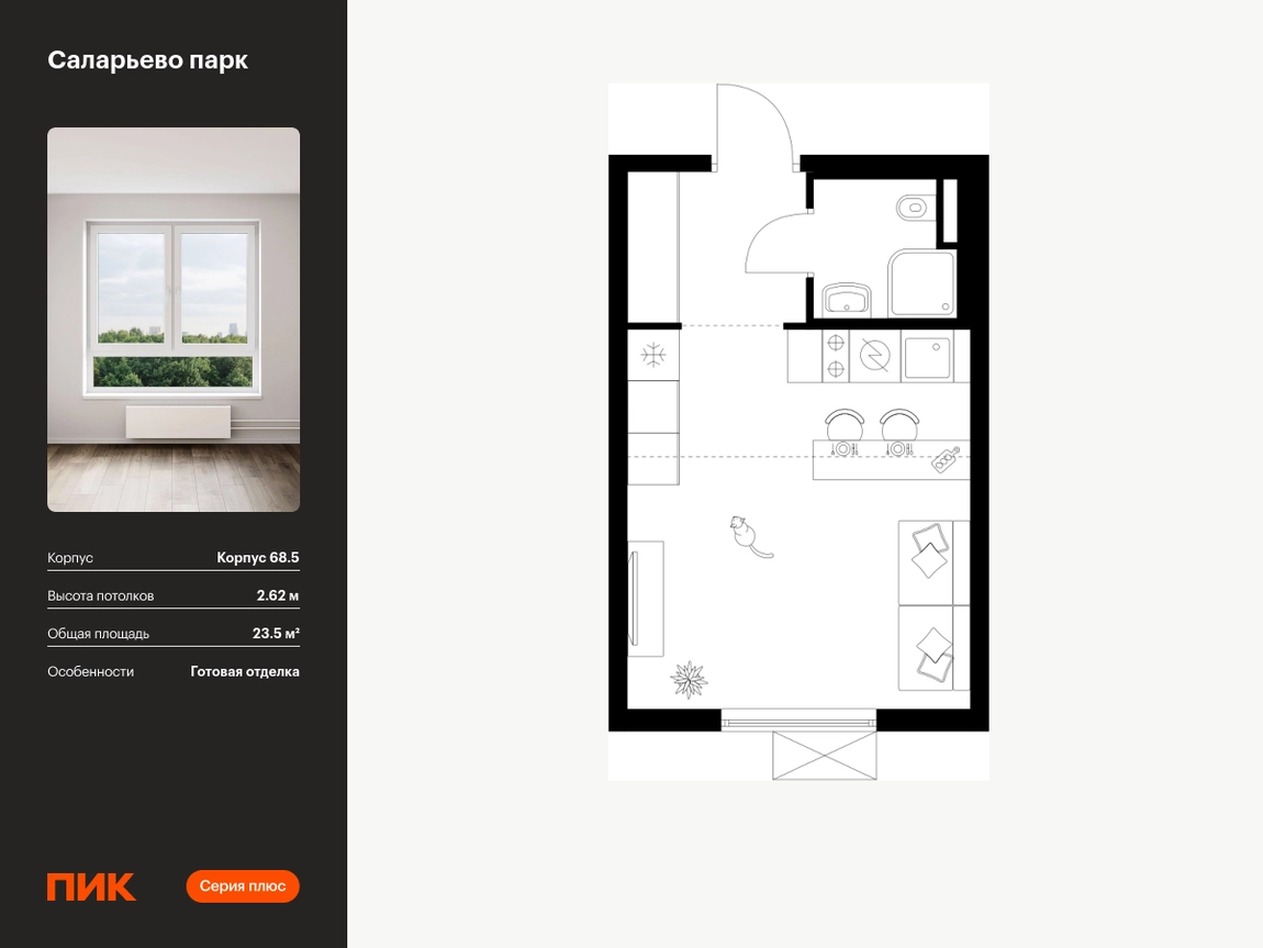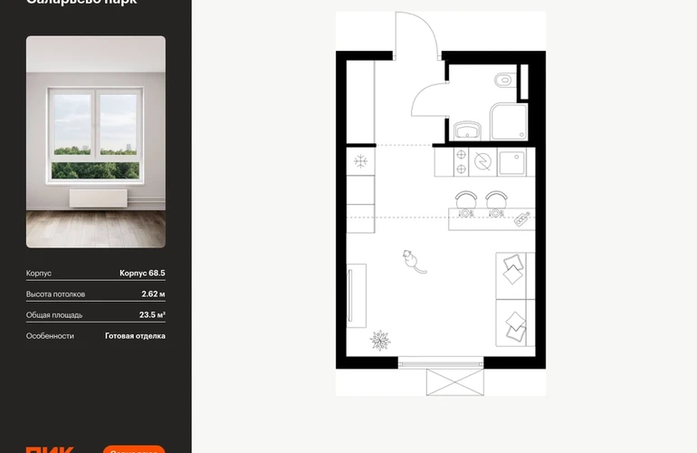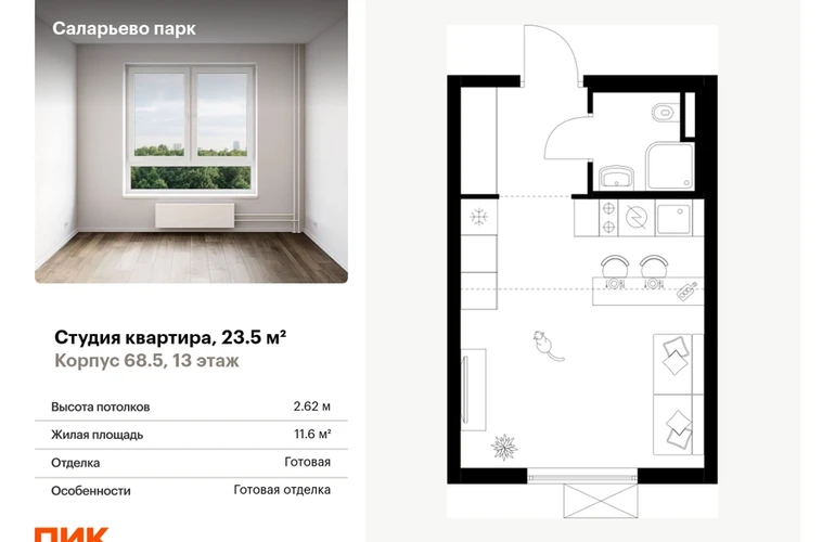 Продаётся квартира-студия площадью 23.50 кв.м на 13 этаже 24 этажного дома (Корпус 68.5, секция 5) проекта ПИК Саларьево парк. Светлый просторный подъезд на уровне земли, функциональная планировка, большие окна, с отделкой. <br> <br>Жилой район «Саларьево парк» расположен в Новой Москве, в четырёх километрах от МКАД по Киевскому шоссе. Две станции метро: «Саларьево» и «Филатов луг» — находятся в пешей доступности от проекта. Дойти до них можно за 5–10 минут. В квартале уже создана качественная среда, где есть абсолютно всё для полноценной жизни, работы и отдыха. <br> <br>«Саларьево парк» — не просто квартал, а полноценный жилой район, который отличается разноплановой архитектурой. Над концепцией квартала работали несколько ведущих архитектурных бюро, которые стремились добиться разнообразия в фасадных решениях. Ярким примером такого подхода станет корпус 83, который относится к «Серии плюс». <br> <br>Новый корпус 83 был создан по принципам южной архитектуры: расслабленный и лаконичный силуэт зданий, привлекающий к себе внимание. Архитектурная изюминка 83-го корпуса — террасы и фигурные балконы. Вместе с окнами и другими акцентными элементами они создают уникальный облик здания, отсылая нас к изысканной южной архитектуре. <br> <br>Все корпуса в квартале гармонично сочетаются, образуя единую городскую среду. Здесь приятно гулять и проводить время на улице всей семьёй. <br> <br>В «Саларьево парке» создана уникальная образовательная среда, включающая в себя шесть школ, рассчитанных на 6 250 учеников. Две из них уже открыты, их посещает 2 300 детей. Также на территории «Саларьево парка» находится 12 детских садов, один из которых с бассейном. Сейчас уже открыты 7 садов. <br> <br>В «Саларьево парке» открыта уникальная игровая площадка — PlayHub «Оригами». Здесь есть ручей, горка-труба и рельефные холмы. Взрослые смогут отдохнуть в уютном кафе, пока дети играют. Также на территории проекта есть SportHub — большая спортивная зона, разделённая по интересам и возрастам. Здесь можно заниматься разными видами спорта: футболом, баскетболом, волейболом и стритболом. Зимой центральную часть площадки превращают в каток. <br> <br>Во дворах-парках жилого квартала есть места для отдыха, детские и спортивные площадки. На первых этажах домов расположены магазины, кафе и полезные сервисы. Также вблизи проекта есть несколько масштабных торговых центров. До ТЦ «Саларис» пять минут пешком, до «Рио», Metro Cash & Carry и «Лемана про» — пять минут на автомобиле. Артикул - 867969О застройщике