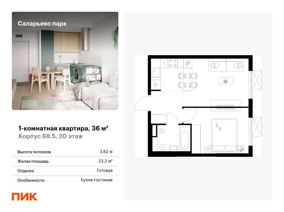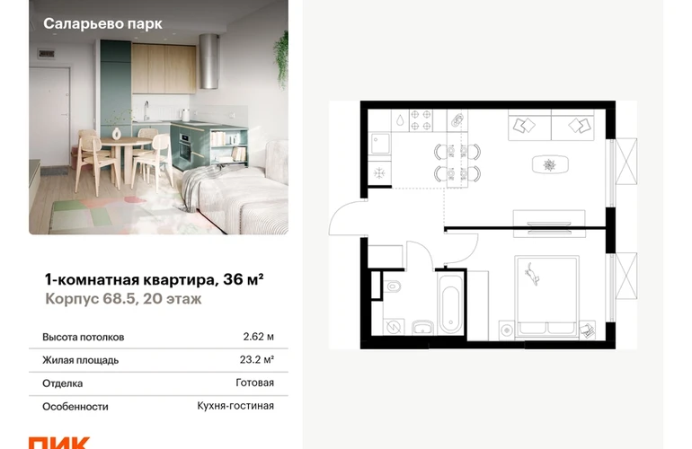 Продаётся 1-комн.квартира площадью 36.00 кв.м на 20 этаже 24 этажного дома (Корпус 68.5, секция 5) проекта ПИК Саларьево парк. Светлый просторный подъезд на уровне земли, функциональная планировка, большие окна, с отделкой. <br> <br>Жилой район «Саларьево парк» расположен в Новой Москве, в четырёх километрах от МКАД по Киевскому шоссе. Две станции метро: «Саларьево» и «Филатов луг» — находятся в пешей доступности от проекта. Дойти до них можно за 5–10 минут. В квартале уже создана качественная среда, где есть абсолютно всё для полноценной жизни, работы и отдыха. <br> <br>«Саларьево парк» — не просто квартал, а полноценный жилой район, который отличается разноплановой архитектурой. Над концепцией квартала работали несколько ведущих архитектурных бюро, которые стремились добиться разнообразия в фасадных решениях. Ярким примером такого подхода станет корпус 83, который относится к «Серии плюс». <br> <br>Новый корпус 83 был создан по принципам южной архитектуры: расслабленный и лаконичный силуэт зданий, привлекающий к себе внимание. Архитектурная изюминка 83-го корпуса — террасы и фигурные балконы. Вместе с окнами и другими акцентными элементами они создают уникальный облик здания, отсылая нас к изысканной южной архитектуре. <br> <br>Все корпуса в квартале гармонично сочетаются, образуя единую городскую среду. Здесь приятно гулять и проводить время на улице всей семьёй. <br> <br>В «Саларьево парке» создана уникальная образовательная среда, включающая в себя шесть школ, рассчитанных на 6 250 учеников. Две из них уже открыты, их посещает 2 300 детей. Также на территории «Саларьево парка» находится 12 детских садов, один из которых с бассейном. Сейчас уже открыты 7 садов. <br> <br>В «Саларьево парке» открыта уникальная игровая площадка — PlayHub «Оригами». Здесь есть ручей, горка-труба и рельефные холмы. Взрослые смогут отдохнуть в уютном кафе, пока дети играют. Также на территории проекта есть SportHub — большая спортивная зона, разделённая по интересам и возрастам. Здесь можно заниматься разными видами спорта: футболом, баскетболом, волейболом и стритболом. Зимой центральную часть площадки превращают в каток. <br> <br>Во дворах-парках жилого квартала есть места для отдыха, детские и спортивные площадки. На первых этажах домов расположены магазины, кафе и полезные сервисы. Также вблизи проекта есть несколько масштабных торговых центров. До ТЦ «Саларис» пять минут пешком, до «Рио», Metro Cash & Carry и «Леруа Мерлен» — пять минут на автомобиле. Артикул - 868199О застройщике