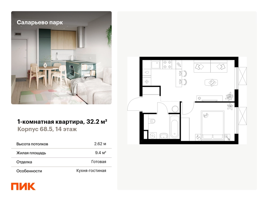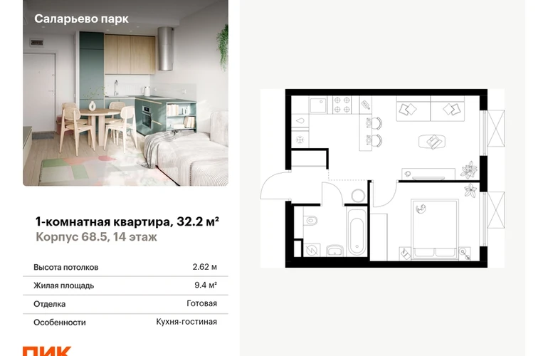 Продаётся 1-комн.квартира площадью 32.20 кв.м на 14 этаже 24 этажного дома (Корпус 68.5, секция 5) проекта ПИК Саларьево парк. Светлый просторный подъезд на уровне земли, функциональная планировка, большие окна, с отделкой. <br> <br>Жилой район «Саларьево парк» расположен в Новой Москве, в четырёх километрах от МКАД по Киевскому шоссе. Две станции метро: «Саларьево» и «Филатов луг» — находятся в пешей доступности от проекта. Дойти до них можно за 5–10 минут. В квартале уже создана качественная среда, где есть абсолютно всё для полноценной жизни, работы и отдыха. <br> <br>«Саларьево парк» — не просто квартал, а полноценный жилой район, который отличается разноплановой архитектурой. Над концепцией квартала работали несколько ведущих архитектурных бюро, которые стремились добиться разнообразия в фасадных решениях. Ярким примером такого подхода станет корпус 83, который относится к «Серии плюс». <br> <br>Новый корпус 83 был создан по принципам южной архитектуры: расслабленный и лаконичный силуэт зданий, привлекающий к себе внимание. Архитектурная изюминка 83-го корпуса — террасы и фигурные балконы. Вместе с окнами и другими акцентными элементами они создают уникальный облик здания, отсылая нас к изысканной южной архитектуре. <br> <br>Все корпуса в квартале гармонично сочетаются, образуя единую городскую среду. Здесь приятно гулять и проводить время на улице всей семьёй. <br> <br>В «Саларьево парке» создана уникальная образовательная среда, включающая в себя шесть школ, рассчитанных на 6 250 учеников. Две из них уже открыты, их посещает 2 300 детей. Также на территории «Саларьево парка» находится 12 детских садов, один из которых с бассейном. Сейчас уже открыты 7 садов. <br> <br>В «Саларьево парке» открыта уникальная игровая площадка — PlayHub «Оригами». Здесь есть ручей, горка-труба и рельефные холмы. Взрослые смогут отдохнуть в уютном кафе, пока дети играют. Также на территории проекта есть SportHub — большая спортивная зона, разделённая по интересам и возрастам. Здесь можно заниматься разными видами спорта: футболом, баскетболом, волейболом и стритболом. Зимой центральную часть площадки превращают в каток. <br> <br>Во дворах-парках жилого квартала есть места для отдыха, детские и спортивные площадки. На первых этажах домов расположены магазины, кафе и полезные сервисы. Также вблизи проекта есть несколько масштабных торговых центров. До ТЦ «Саларис» пять минут пешком, до «Рио», Metro Cash & Carry и «Лемана про» — пять минут на автомобиле. Артикул - 867963О застройщике