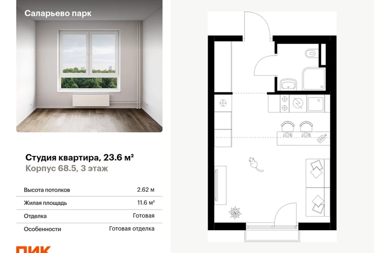 Продаётся квартира-студия площадью 23.60 кв.м на 3 этаже 24 этажного дома (Корпус 68.5, секция 5) проекта ПИК Саларьево парк. Светлый просторный подъезд на уровне земли, функциональная планировка, большие окна, с отделкой. <br> <br>Жилой район «Саларьево парк» расположен в Новой Москве, в четырёх километрах от МКАД по Киевскому шоссе. Две станции метро: «Саларьево» и «Филатов луг» — находятся в пешей доступности от проекта. Дойти до них можно за 5–10 минут. В квартале уже создана качественная среда, где есть абсолютно всё для полноценной жизни, работы и отдыха. <br> <br>«Саларьево парк» — не просто квартал, а полноценный жилой район, который отличается разноплановой архитектурой. Над концепцией квартала работали несколько ведущих архитектурных бюро, которые стремились добиться разнообразия в фасадных решениях. Ярким примером такого подхода станет корпус 83, который относится к «Серии плюс». <br> <br>Новый корпус 83 был создан по принципам южной архитектуры: расслабленный и лаконичный силуэт зданий, привлекающий к себе внимание. Архитектурная изюминка 83-го корпуса — террасы и фигурные балконы. Вместе с окнами и другими акцентными элементами они создают уникальный облик здания, отсылая нас к изысканной южной архитектуре. <br> <br>Все корпуса в квартале гармонично сочетаются, образуя единую городскую среду. Здесь приятно гулять и проводить время на улице всей семьёй. <br> <br>В «Саларьево парке» создана уникальная образовательная среда, включающая в себя шесть школ, рассчитанных на 6 250 учеников. Две из них уже открыты, их посещает 2 300 детей. Также на территории «Саларьево парка» находится 12 детских садов, один из которых с бассейном. Сейчас уже открыты 7 садов. <br> <br>В «Саларьево парке» открыта уникальная игровая площадка — PlayHub «Оригами». Здесь есть ручей, горка-труба и рельефные холмы. Взрослые смогут отдохнуть в уютном кафе, пока дети играют. Также на территории проекта есть SportHub — большая спортивная зона, разделённая по интересам и возрастам. Здесь можно заниматься разными видами спорта: футболом, баскетболом, волейболом и стритболом. Зимой центральную часть площадки превращают в каток. <br> <br>Во дворах-парках жилого квартала есть места для отдыха, детские и спортивные площадки. На первых этажах домов расположены магазины, кафе и полезные сервисы. Также вблизи проекта есть несколько масштабных торговых центров. До ТЦ «Саларис» пять минут пешком, до «Рио», Metro Cash & Carry и «Леруа Мерлен» — пять минут на автомобиле. Артикул - 867420О застройщике