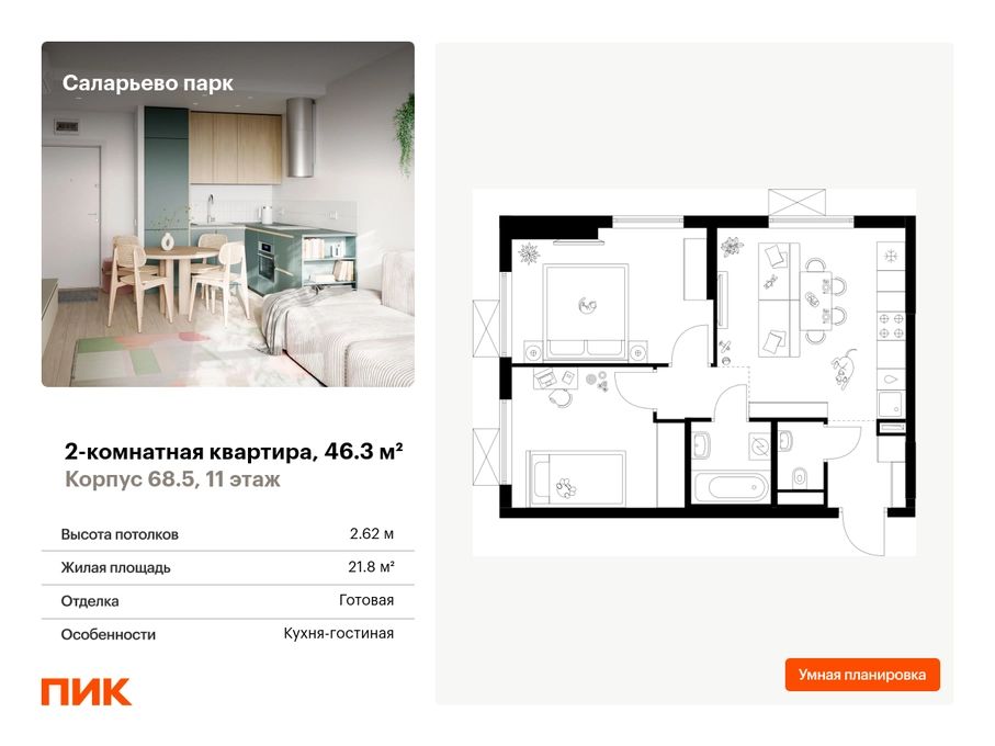 Продаётся 2-комн.квартира площадью 46.30 кв.м на 11 этаже 24 этажного дома (Корпус 68.5, секция 5) проекта ПИК Саларьево парк. Светлый просторный подъезд на уровне земли, функциональная планировка, большие окна, с отделкой. <br> <br>Жилой район «Саларьево парк» расположен в Новой Москве, в четырёх километрах от МКАД по Киевскому шоссе. Две станции метро: «Саларьево» и «Филатов луг» — находятся в пешей доступности от проекта. Дойти до них можно за 5–10 минут. В квартале уже создана качественная среда, где есть абсолютно всё для полноценной жизни, работы и отдыха. <br> <br>«Саларьево парк» — не просто квартал, а полноценный жилой район, который отличается разноплановой архитектурой. Над концепцией квартала работали несколько ведущих архитектурных бюро, которые стремились добиться разнообразия в фасадных решениях. Ярким примером такого подхода станет корпус 83, который относится к «Серии плюс». <br> <br>Новый корпус 83 был создан по принципам южной архитектуры: расслабленный и лаконичный силуэт зданий, привлекающий к себе внимание. Архитектурная изюминка 83-го корпуса — террасы и фигурные балконы. Вместе с окнами и другими акцентными элементами они создают уникальный облик здания, отсылая нас к изысканной южной архитектуре. <br> <br>Все корпуса в квартале гармонично сочетаются, образуя единую городскую среду. Здесь приятно гулять и проводить время на улице всей семьёй. <br> <br>В «Саларьево парке» создана уникальная образовательная среда, включающая в себя шесть школ, рассчитанных на 6 250 учеников. Две из них уже открыты, их посещает 2 300 детей. Также на территории «Саларьево парка» находится 12 детских садов, один из которых с бассейном. Сейчас уже открыты 7 садов. <br> <br>В «Саларьево парке» открыта уникальная игровая площадка — PlayHub «Оригами». Здесь есть ручей, горка-труба и рельефные холмы. Взрослые смогут отдохнуть в уютном кафе, пока дети играют. Также на территории проекта есть SportHub — большая спортивная зона, разделённая по интересам и возрастам. Здесь можно заниматься разными видами спорта: футболом, баскетболом, волейболом и стритболом. Зимой центральную часть площадки превращают в каток. <br> <br>Во дворах-парках жилого квартала есть места для отдыха, детские и спортивные площадки. На первых этажах домов расположены магазины, кафе и полезные сервисы. Также вблизи проекта есть несколько масштабных торговых центров. До ТЦ «Саларис» пять минут пешком, до «Рио», Metro Cash & Carry и «Леруа Мерлен» — пять минут на автомобиле. Артикул - 867908О застройщике