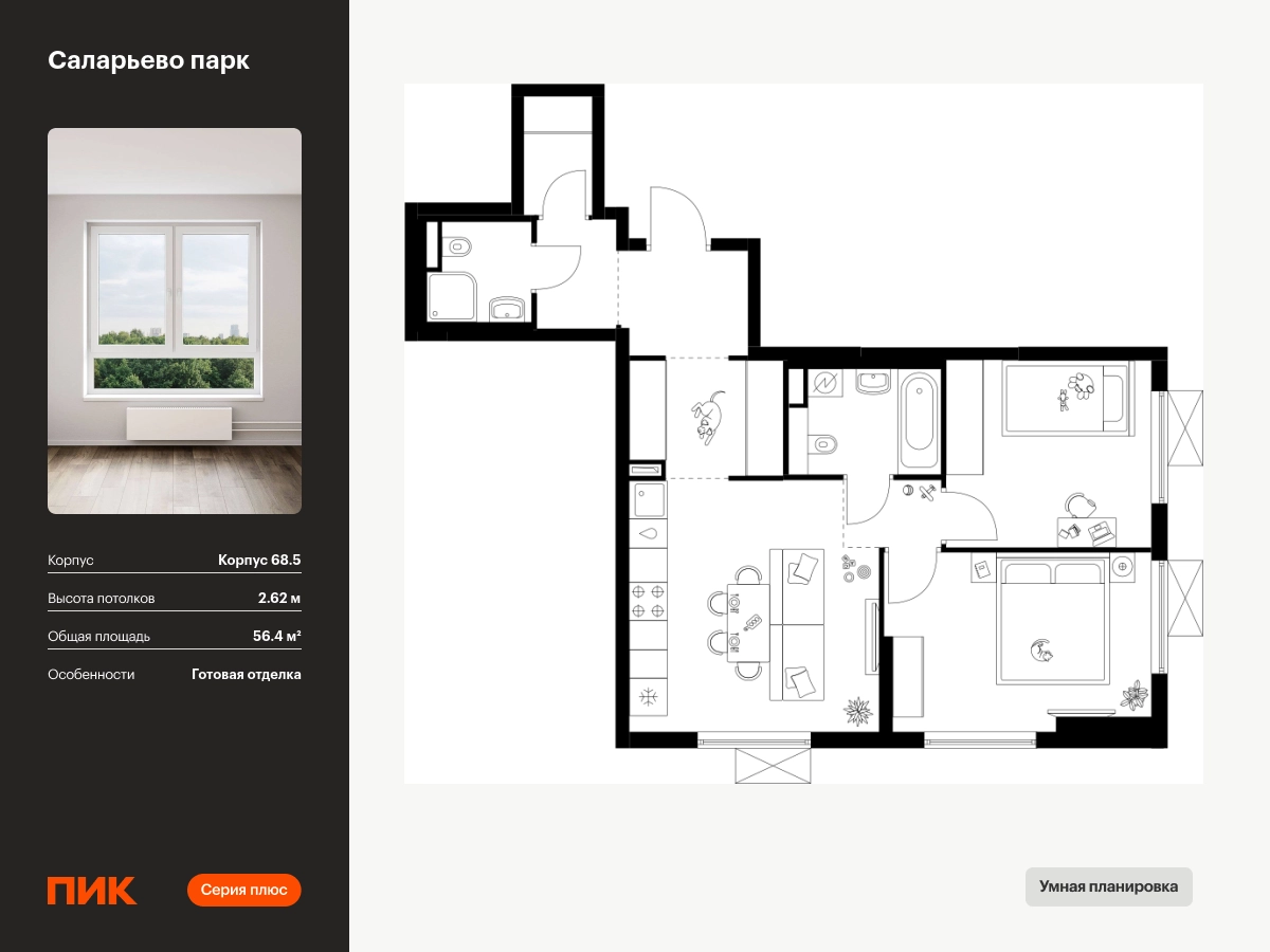 Продаётся 2-комн.квартира площадью 56.40 кв.м на 23 этаже 24 этажного дома (Корпус 68.5, секция 5) проекта ПИК Саларьево парк. Светлый просторный подъезд на уровне земли, функциональная планировка, большие окна, с отделкой. <br> <br>Жилой район «Саларьево парк» расположен в Новой Москве, в четырёх километрах от МКАД по Киевскому шоссе. Две станции метро: «Саларьево» и «Филатов луг» — находятся в пешей доступности от проекта. Дойти до них можно за 5–10 минут. В квартале уже создана качественная среда, где есть абсолютно всё для полноценной жизни, работы и отдыха. <br> <br>«Саларьево парк» — не просто квартал, а полноценный жилой район, который отличается разноплановой архитектурой. Над концепцией квартала работали несколько ведущих архитектурных бюро, которые стремились добиться разнообразия в фасадных решениях. Ярким примером такого подхода станет корпус 83, который относится к «Серии плюс». <br> <br>Новый корпус 83 был создан по принципам южной архитектуры: расслабленный и лаконичный силуэт зданий, привлекающий к себе внимание. Архитектурная изюминка 83-го корпуса — террасы и фигурные балконы. Вместе с окнами и другими акцентными элементами они создают уникальный облик здания, отсылая нас к изысканной южной архитектуре. <br> <br>Все корпуса в квартале гармонично сочетаются, образуя единую городскую среду. Здесь приятно гулять и проводить время на улице всей семьёй. <br> <br>В «Саларьево парке» создана уникальная образовательная среда, включающая в себя шесть школ, рассчитанных на 6 250 учеников. Две из них уже открыты, их посещает 2 300 детей. Также на территории «Саларьево парка» находится 12 детских садов, один из которых с бассейном. Сейчас уже открыты 7 садов. <br> <br>В «Саларьево парке» открыта уникальная игровая площадка — PlayHub «Оригами». Здесь есть ручей, горка-труба и рельефные холмы. Взрослые смогут отдохнуть в уютном кафе, пока дети играют. Также на территории проекта есть SportHub — большая спортивная зона, разделённая по интересам и возрастам. Здесь можно заниматься разными видами спорта: футболом, баскетболом, волейболом и стритболом. Зимой центральную часть площадки превращают в каток. <br> <br>Во дворах-парках жилого квартала есть места для отдыха, детские и спортивные площадки. На первых этажах домов расположены магазины, кафе и полезные сервисы. Также вблизи проекта есть несколько масштабных торговых центров. До ТЦ «Саларис» пять минут пешком, до «Рио», Metro Cash & Carry и «Лемана про» — пять минут на автомобиле. Артикул - 868256О застройщике