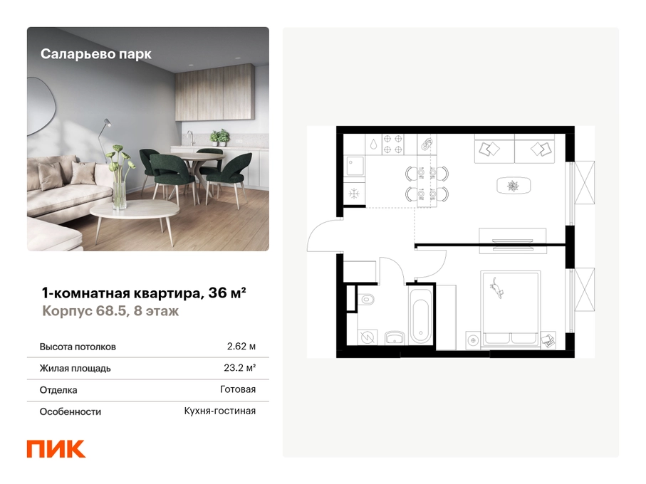 Продаётся 1-комн.квартира площадью 36.00 кв.м на 8 этаже 24 этажного дома (Корпус 68.5, секция 5) проекта ПИК Саларьево парк. Светлый просторный подъезд на уровне земли, функциональная планировка, большие окна, с отделкой. <br> <br>Жилой район «Саларьево парк» расположен в Новой Москве, в четырёх километрах от МКАД по Киевскому шоссе. Две станции метро: «Саларьево» и «Филатов луг» — находятся в пешей доступности от проекта. Дойти до них можно за 5–10 минут. В квартале уже создана качественная среда, где есть абсолютно всё для полноценной жизни, работы и отдыха. <br> <br>«Саларьево парк» — не просто квартал, а полноценный жилой район, который отличается разноплановой архитектурой. Над концепцией квартала работали несколько ведущих архитектурных бюро, которые стремились добиться разнообразия в фасадных решениях. Ярким примером такого подхода станет корпус 83, который относится к «Серии плюс». <br> <br>Новый корпус 83 был создан по принципам южной архитектуры: расслабленный и лаконичный силуэт зданий, привлекающий к себе внимание. Архитектурная изюминка 83-го корпуса — террасы и фигурные балконы. Вместе с окнами и другими акцентными элементами они создают уникальный облик здания, отсылая нас к изысканной южной архитектуре. <br> <br>Все корпуса в квартале гармонично сочетаются, образуя единую городскую среду. Здесь приятно гулять и проводить время на улице всей семьёй. <br> <br>В «Саларьево парке» создана уникальная образовательная среда, включающая в себя шесть школ, рассчитанных на 6 250 учеников. Две из них уже открыты, их посещает 2 300 детей. Также на территории «Саларьево парка» находится 12 детских садов, один из которых с бассейном. Сейчас уже открыты 7 садов. <br> <br>В «Саларьево парке» открыта уникальная игровая площадка — PlayHub «Оригами». Здесь есть ручей, горка-труба и рельефные холмы. Взрослые смогут отдохнуть в уютном кафе, пока дети играют. Также на территории проекта есть SportHub — большая спортивная зона, разделённая по интересам и возрастам. Здесь можно заниматься разными видами спорта: футболом, баскетболом, волейболом и стритболом. Зимой центральную часть площадки превращают в каток. <br> <br>Во дворах-парках жилого квартала есть места для отдыха, детские и спортивные площадки. На первых этажах домов расположены магазины, кафе и полезные сервисы. Также вблизи проекта есть несколько масштабных торговых центров. До ТЦ «Саларис» пять минут пешком, до «Рио», Metro Cash & Carry и «Лемана про» — пять минут на автомобиле. Артикул - 867715О застройщике