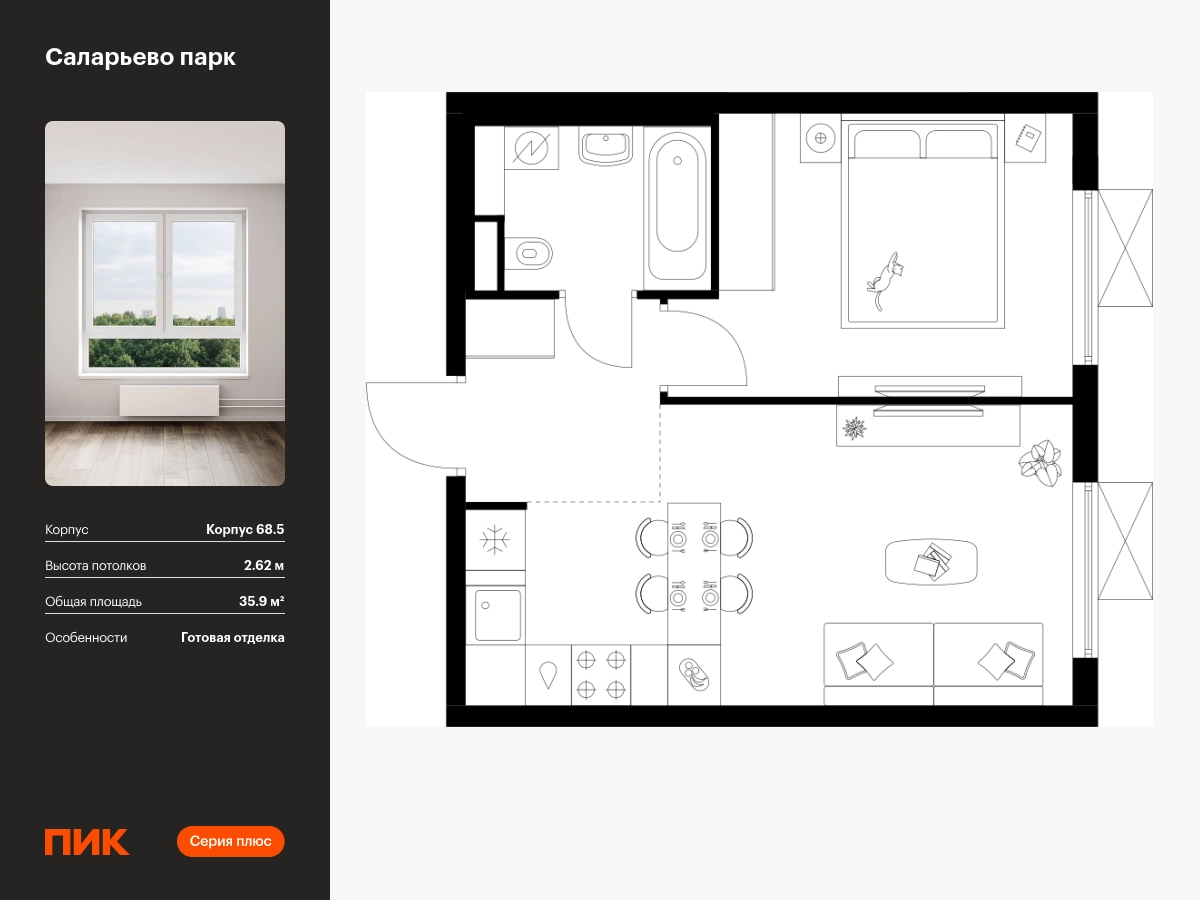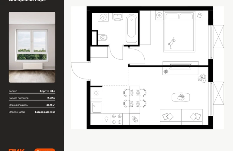 Продаётся 1-комн.квартира площадью 35.90 кв.м на 23 этаже 24 этажного дома (Корпус 68.5, секция 5) проекта ПИК Саларьево парк. Светлый просторный подъезд на уровне земли, функциональная планировка, большие окна, с отделкой. <br> <br>Жилой район «Саларьево парк» расположен в Новой Москве, в четырёх километрах от МКАД по Киевскому шоссе. Две станции метро: «Саларьево» и «Филатов луг» — находятся в пешей доступности от проекта. Дойти до них можно за 5–10 минут. В квартале уже создана качественная среда, где есть абсолютно всё для полноценной жизни, работы и отдыха. <br> <br>«Саларьево парк» — не просто квартал, а полноценный жилой район, который отличается разноплановой архитектурой. Над концепцией квартала работали несколько ведущих архитектурных бюро, которые стремились добиться разнообразия в фасадных решениях. Ярким примером такого подхода станет корпус 83, который относится к «Серии плюс». <br> <br>Новый корпус 83 был создан по принципам южной архитектуры: расслабленный и лаконичный силуэт зданий, привлекающий к себе внимание. Архитектурная изюминка 83-го корпуса — террасы и фигурные балконы. Вместе с окнами и другими акцентными элементами они создают уникальный облик здания, отсылая нас к изысканной южной архитектуре. <br> <br>Все корпуса в квартале гармонично сочетаются, образуя единую городскую среду. Здесь приятно гулять и проводить время на улице всей семьёй. <br> <br>В «Саларьево парке» создана уникальная образовательная среда, включающая в себя шесть школ, рассчитанных на 6 250 учеников. Две из них уже открыты, их посещает 2 300 детей. Также на территории «Саларьево парка» находится 12 детских садов, один из которых с бассейном. Сейчас уже открыты 7 садов. <br> <br>В «Саларьево парке» открыта уникальная игровая площадка — PlayHub «Оригами». Здесь есть ручей, горка-труба и рельефные холмы. Взрослые смогут отдохнуть в уютном кафе, пока дети играют. Также на территории проекта есть SportHub — большая спортивная зона, разделённая по интересам и возрастам. Здесь можно заниматься разными видами спорта: футболом, баскетболом, волейболом и стритболом. Зимой центральную часть площадки превращают в каток. <br> <br>Во дворах-парках жилого квартала есть места для отдыха, детские и спортивные площадки. На первых этажах домов расположены магазины, кафе и полезные сервисы. Также вблизи проекта есть несколько масштабных торговых центров. До ТЦ «Саларис» пять минут пешком, до «Рио», Metro Cash & Carry и «Лемана про» — пять минут на автомобиле. Артикул - 868255О застройщике