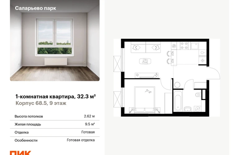 Продаётся 1-комн.квартира площадью 32.30 кв.м на 9 этаже 24 этажного дома (Корпус 68.5, секция 5) проекта ПИК Саларьево парк. Светлый просторный подъезд на уровне земли, функциональная планировка, большие окна, с отделкой. <br> <br>Жилой район «Саларьево парк» расположен в Новой Москве, в четырёх километрах от МКАД по Киевскому шоссе. Две станции метро: «Саларьево» и «Филатов луг» — находятся в пешей доступности от проекта. Дойти до них можно за 5–10 минут. В квартале уже создана качественная среда, где есть абсолютно всё для полноценной жизни, работы и отдыха. <br> <br>«Саларьево парк» — не просто квартал, а полноценный жилой район, который отличается разноплановой архитектурой. Над концепцией квартала работали несколько ведущих архитектурных бюро, которые стремились добиться разнообразия в фасадных решениях. Ярким примером такого подхода станет корпус 83, который относится к «Серии плюс». <br> <br>Новый корпус 83 был создан по принципам южной архитектуры: расслабленный и лаконичный силуэт зданий, привлекающий к себе внимание. Архитектурная изюминка 83-го корпуса — террасы и фигурные балконы. Вместе с окнами и другими акцентными элементами они создают уникальный облик здания, отсылая нас к изысканной южной архитектуре. <br> <br>Все корпуса в квартале гармонично сочетаются, образуя единую городскую среду. Здесь приятно гулять и проводить время на улице всей семьёй. <br> <br>В «Саларьево парке» создана уникальная образовательная среда, включающая в себя шесть школ, рассчитанных на 6 250 учеников. Две из них уже открыты, их посещает 2 300 детей. Также на территории «Саларьево парка» находится 12 детских садов, один из которых с бассейном. Сейчас уже открыты 7 садов. <br> <br>В «Саларьево парке» открыта уникальная игровая площадка — PlayHub «Оригами». Здесь есть ручей, горка-труба и рельефные холмы. Взрослые смогут отдохнуть в уютном кафе, пока дети играют. Также на территории проекта есть SportHub — большая спортивная зона, разделённая по интересам и возрастам. Здесь можно заниматься разными видами спорта: футболом, баскетболом, волейболом и стритболом. Зимой центральную часть площадки превращают в каток. <br> <br>Во дворах-парках жилого квартала есть места для отдыха, детские и спортивные площадки. На первых этажах домов расположены магазины, кафе и полезные сервисы. Также вблизи проекта есть несколько масштабных торговых центров. До ТЦ «Саларис» пять минут пешком, до «Рио», Metro Cash & Carry и «Леруа Мерлен» — пять минут на автомобиле. Артикул - 867783О застройщике