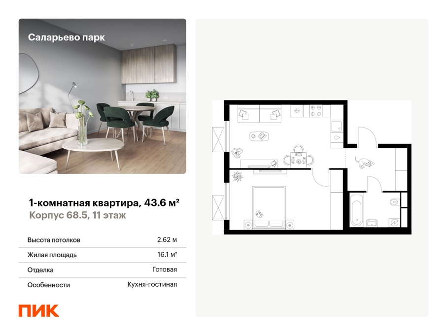 Продаётся 1-комн.квартира площадью 43.60 кв.м на 11 этаже 24 этажного дома (Корпус 68.5, секция 5) проекта ПИК Саларьево парк. Светлый просторный подъезд на уровне земли, функциональная планировка, большие окна, с отделкой. <br> <br>Жилой район «Саларьево парк» расположен в Новой Москве, в четырёх километрах от МКАД по Киевскому шоссе. Две станции метро: «Саларьево» и «Филатов луг» — находятся в пешей доступности от проекта. Дойти до них можно за 5–10 минут. В квартале уже создана качественная среда, где есть абсолютно всё для полноценной жизни, работы и отдыха. <br> <br>«Саларьево парк» — не просто квартал, а полноценный жилой район, который отличается разноплановой архитектурой. Над концепцией квартала работали несколько ведущих архитектурных бюро, которые стремились добиться разнообразия в фасадных решениях. Ярким примером такого подхода станет корпус 83, который относится к «Серии плюс». <br> <br>Новый корпус 83 был создан по принципам южной архитектуры: расслабленный и лаконичный силуэт зданий, привлекающий к себе внимание. Архитектурная изюминка 83-го корпуса — террасы и фигурные балконы. Вместе с окнами и другими акцентными элементами они создают уникальный облик здания, отсылая нас к изысканной южной архитектуре. <br> <br>Все корпуса в квартале гармонично сочетаются, образуя единую городскую среду. Здесь приятно гулять и проводить время на улице всей семьёй. <br> <br>В «Саларьево парке» создана уникальная образовательная среда, включающая в себя шесть школ, рассчитанных на 6 250 учеников. Две из них уже открыты, их посещает 2 300 детей. Также на территории «Саларьево парка» находится 12 детских садов, один из которых с бассейном. Сейчас уже открыты 7 садов. <br> <br>В «Саларьево парке» открыта уникальная игровая площадка — PlayHub «Оригами». Здесь есть ручей, горка-труба и рельефные холмы. Взрослые смогут отдохнуть в уютном кафе, пока дети играют. Также на территории проекта есть SportHub — большая спортивная зона, разделённая по интересам и возрастам. Здесь можно заниматься разными видами спорта: футболом, баскетболом, волейболом и стритболом. Зимой центральную часть площадки превращают в каток. <br> <br>Во дворах-парках жилого квартала есть места для отдыха, детские и спортивные площадки. На первых этажах домов расположены магазины, кафе и полезные сервисы. Также вблизи проекта есть несколько масштабных торговых центров. До ТЦ «Саларис» пять минут пешком, до «Рио», Metro Cash & Carry и «Леруа Мерлен» — пять минут на автомобиле. Артикул - 867864О застройщике