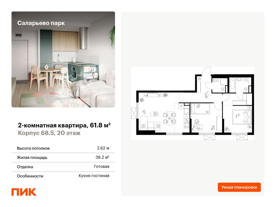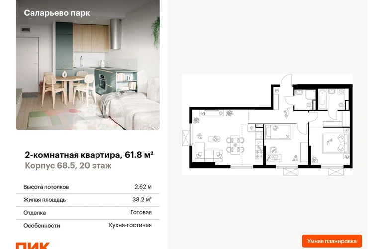 Продаётся 2-комн.квартира площадью 61.80 кв.м на 20 этаже 24 этажного дома (Корпус 68.5, секция 5) проекта ПИК Саларьево парк. Светлый просторный подъезд на уровне земли, функциональная планировка, большие окна, с отделкой. <br> <br>Жилой район «Саларьево парк» расположен в Новой Москве, в четырёх километрах от МКАД по Киевскому шоссе. Две станции метро: «Саларьево» и «Филатов луг» — находятся в пешей доступности от проекта. Дойти до них можно за 5–10 минут. В квартале уже создана качественная среда, где есть абсолютно всё для полноценной жизни, работы и отдыха. <br> <br>«Саларьево парк» — не просто квартал, а полноценный жилой район, который отличается разноплановой архитектурой. Над концепцией квартала работали несколько ведущих архитектурных бюро, которые стремились добиться разнообразия в фасадных решениях. Ярким примером такого подхода станет корпус 83, который относится к «Серии плюс». <br> <br>Новый корпус 83 был создан по принципам южной архитектуры: расслабленный и лаконичный силуэт зданий, привлекающий к себе внимание. Архитектурная изюминка 83-го корпуса — террасы и фигурные балконы. Вместе с окнами и другими акцентными элементами они создают уникальный облик здания, отсылая нас к изысканной южной архитектуре. <br> <br>Все корпуса в квартале гармонично сочетаются, образуя единую городскую среду. Здесь приятно гулять и проводить время на улице всей семьёй. <br> <br>В «Саларьево парке» создана уникальная образовательная среда, включающая в себя шесть школ, рассчитанных на 6 250 учеников. Две из них уже открыты, их посещает 2 300 детей. Также на территории «Саларьево парка» находится 12 детских садов, один из которых с бассейном. Сейчас уже открыты 7 садов. <br> <br>В «Саларьево парке» открыта уникальная игровая площадка — PlayHub «Оригами». Здесь есть ручей, горка-труба и рельефные холмы. Взрослые смогут отдохнуть в уютном кафе, пока дети играют. Также на территории проекта есть SportHub — большая спортивная зона, разделённая по интересам и возрастам. Здесь можно заниматься разными видами спорта: футболом, баскетболом, волейболом и стритболом. Зимой центральную часть площадки превращают в каток. <br> <br>Во дворах-парках жилого квартала есть места для отдыха, детские и спортивные площадки. На первых этажах домов расположены магазины, кафе и полезные сервисы. Также вблизи проекта есть несколько масштабных торговых центров. До ТЦ «Саларис» пять минут пешком, до «Рио», Metro Cash & Carry и «Лемана про» — пять минут на автомобиле. Артикул - 868220О застройщике