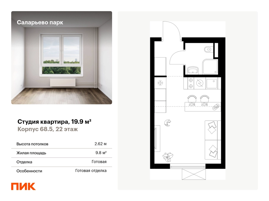 Продаётся квартира-студия площадью 19.90 кв.м на 22 этаже 24 этажного дома (Корпус 68.5, секция 5) проекта ПИК Саларьево парк. Светлый просторный подъезд на уровне земли, функциональная планировка, большие окна, с отделкой. <br> <br>Жилой район «Саларьево парк» расположен в Новой Москве, в четырёх километрах от МКАД по Киевскому шоссе. Две станции метро: «Саларьево» и «Филатов луг» — находятся в пешей доступности от проекта. Дойти до них можно за 5–10 минут. В квартале уже создана качественная среда, где есть абсолютно всё для полноценной жизни, работы и отдыха. <br> <br>«Саларьево парк» — не просто квартал, а полноценный жилой район, который отличается разноплановой архитектурой. Над концепцией квартала работали несколько ведущих архитектурных бюро, которые стремились добиться разнообразия в фасадных решениях. Ярким примером такого подхода станет корпус 83, который относится к «Серии плюс». <br> <br>Новый корпус 83 был создан по принципам южной архитектуры: расслабленный и лаконичный силуэт зданий, привлекающий к себе внимание. Архитектурная изюминка 83-го корпуса — террасы и фигурные балконы. Вместе с окнами и другими акцентными элементами они создают уникальный облик здания, отсылая нас к изысканной южной архитектуре. <br> <br>Все корпуса в квартале гармонично сочетаются, образуя единую городскую среду. Здесь приятно гулять и проводить время на улице всей семьёй. <br> <br>В «Саларьево парке» создана уникальная образовательная среда, включающая в себя шесть школ, рассчитанных на 6 250 учеников. Две из них уже открыты, их посещает 2 300 детей. Также на территории «Саларьево парка» находится 12 детских садов, один из которых с бассейном. Сейчас уже открыты 7 садов. <br> <br>В «Саларьево парке» открыта уникальная игровая площадка — PlayHub «Оригами». Здесь есть ручей, горка-труба и рельефные холмы. Взрослые смогут отдохнуть в уютном кафе, пока дети играют. Также на территории проекта есть SportHub — большая спортивная зона, разделённая по интересам и возрастам. Здесь можно заниматься разными видами спорта: футболом, баскетболом, волейболом и стритболом. Зимой центральную часть площадки превращают в каток. <br> <br>Во дворах-парках жилого квартала есть места для отдыха, детские и спортивные площадки. На первых этажах домов расположены магазины, кафе и полезные сервисы. Также вблизи проекта есть несколько масштабных торговых центров. До ТЦ «Саларис» пять минут пешком, до «Рио», Metro Cash & Carry и «Лемана про» — пять минут на автомобиле. Артикул - 868257О застройщике