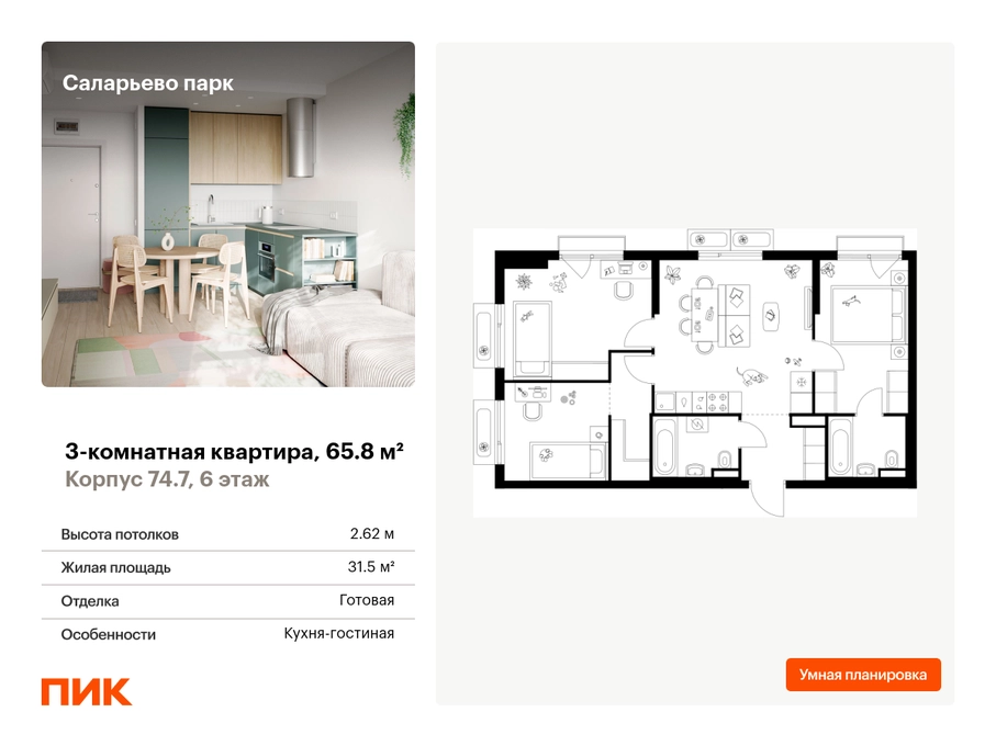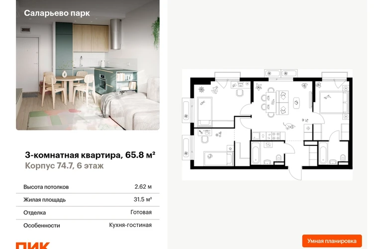 Продаётся 3-комн.квартира площадью 65.80 кв.м на 6 этаже 16 этажного дома (Корпус 74.7, секция 7) проекта ПИК Саларьево парк. Светлый просторный подъезд на уровне земли, функциональная планировка, большие окна, с отделкой. Жилой район «Саларьево парк» расположен в Новой Москве, в четырёх километрах от МКАД по Киевскому шоссе. Две станции метро: «Саларьево» и «Филатов луг» — находятся в пешей доступности от проекта. Дойти до них можно за 5–10 минут. В квартале уже создана качественная среда, где есть абсолютно всё для полноценной жизни, работы и отдыха. «Саларьево парк» — не просто квартал, а полноценный жилой район, который отличается разноплановой архитектурой. Над концепцией квартала работали несколько ведущих архитектурных бюро, которые стремились добиться разнообразия в фасадных решениях. Ярким примером такого подхода станет корпус 83, который относится к «Серии плюс». Новый корпус 83 был создан по принципам южной архитектуры: расслабленный и лаконичный силуэт зданий, привлекающий к себе внимание. Архитектурная изюминка 83-го корпуса — террасы и фигурные балконы. Вместе с окнами и другими акцентными элементами они создают уникальный облик здания, отсылая нас к изысканной южной архитектуре. Все корпуса в квартале гармонично сочетаются, образуя единую городскую среду. Здесь приятно гулять и проводить время на улице всей семьёй. В «Саларьево парке» создана уникальная образовательная среда, включающая в себя шесть школ, рассчитанных на 6 250 учеников. Две из них уже открыты, их посещает 2 300 детей. Также на территории «Саларьево парка» находится 12 детских садов, один из которых с бассейном. Сейчас уже открыты 7 садов. В «Саларьево парке» открыта уникальная игровая площадка — PlayHub «Оригами». Здесь есть ручей, горка-труба и рельефные холмы. Взрослые смогут отдохнуть в уютном кафе, пока дети играют. Также на территории проекта есть SportHub — большая спортивная зона, разделённая по интересам и возрастам. Здесь можно заниматься разными видами спорта: футболом, баскетболом, волейболом и стритболом. Зимой центральную часть площадки превращают в каток. Во дворах-парках жилого квартала есть места для отдыха, детские и спортивные площадки. На первых этажах домов расположены магазины, кафе и полезные сервисы. Также вблизи проекта есть несколько масштабных торговых центров. До ТЦ «Саларис» пять минут пешком, до «Рио», Metro Cash & Carry и «Лемана про» — пять минут на автомобиле. Артикул - 1007027О застройщике
