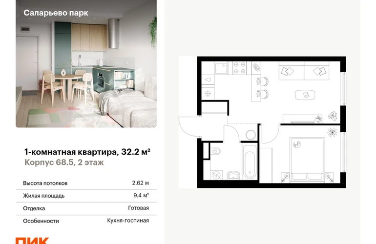 Продаётся 1-комн.квартира площадью 32.20 кв.м на 2 этаже 24 этажного дома (Корпус 68.5, секция 5) проекта ПИК Саларьево парк. Светлый просторный подъезд на уровне земли, функциональная планировка, большие окна, с отделкой. <br> <br>Жилой район «Саларьево парк» расположен в Новой Москве, в четырёх километрах от МКАД по Киевскому шоссе. Две станции метро: «Саларьево» и «Филатов луг» — находятся в пешей доступности от проекта. Дойти до них можно за 5–10 минут. В квартале уже создана качественная среда, где есть абсолютно всё для полноценной жизни, работы и отдыха. <br> <br>«Саларьево парк» — не просто квартал, а полноценный жилой район, который отличается разноплановой архитектурой. Над концепцией квартала работали несколько ведущих архитектурных бюро, которые стремились добиться разнообразия в фасадных решениях. Ярким примером такого подхода станет корпус 83, который относится к «Серии плюс». <br> <br>Новый корпус 83 был создан по принципам южной архитектуры: расслабленный и лаконичный силуэт зданий, привлекающий к себе внимание. Архитектурная изюминка 83-го корпуса — террасы и фигурные балконы. Вместе с окнами и другими акцентными элементами они создают уникальный облик здания, отсылая нас к изысканной южной архитектуре. <br> <br>Все корпуса в квартале гармонично сочетаются, образуя единую городскую среду. Здесь приятно гулять и проводить время на улице всей семьёй. <br> <br>В «Саларьево парке» создана уникальная образовательная среда, включающая в себя шесть школ, рассчитанных на 6 250 учеников. Две из них уже открыты, их посещает 2 300 детей. Также на территории «Саларьево парка» находится 12 детских садов, один из которых с бассейном. Сейчас уже открыты 7 садов. <br> <br>В «Саларьево парке» открыта уникальная игровая площадка — PlayHub «Оригами». Здесь есть ручей, горка-труба и рельефные холмы. Взрослые смогут отдохнуть в уютном кафе, пока дети играют. Также на территории проекта есть SportHub — большая спортивная зона, разделённая по интересам и возрастам. Здесь можно заниматься разными видами спорта: футболом, баскетболом, волейболом и стритболом. Зимой центральную часть площадки превращают в каток. <br> <br>Во дворах-парках жилого квартала есть места для отдыха, детские и спортивные площадки. На первых этажах домов расположены магазины, кафе и полезные сервисы. Также вблизи проекта есть несколько масштабных торговых центров. До ТЦ «Саларис» пять минут пешком, до «Рио», Metro Cash & Carry и «Лемана про» — пять минут на автомобиле. Артикул - 867361О застройщике
