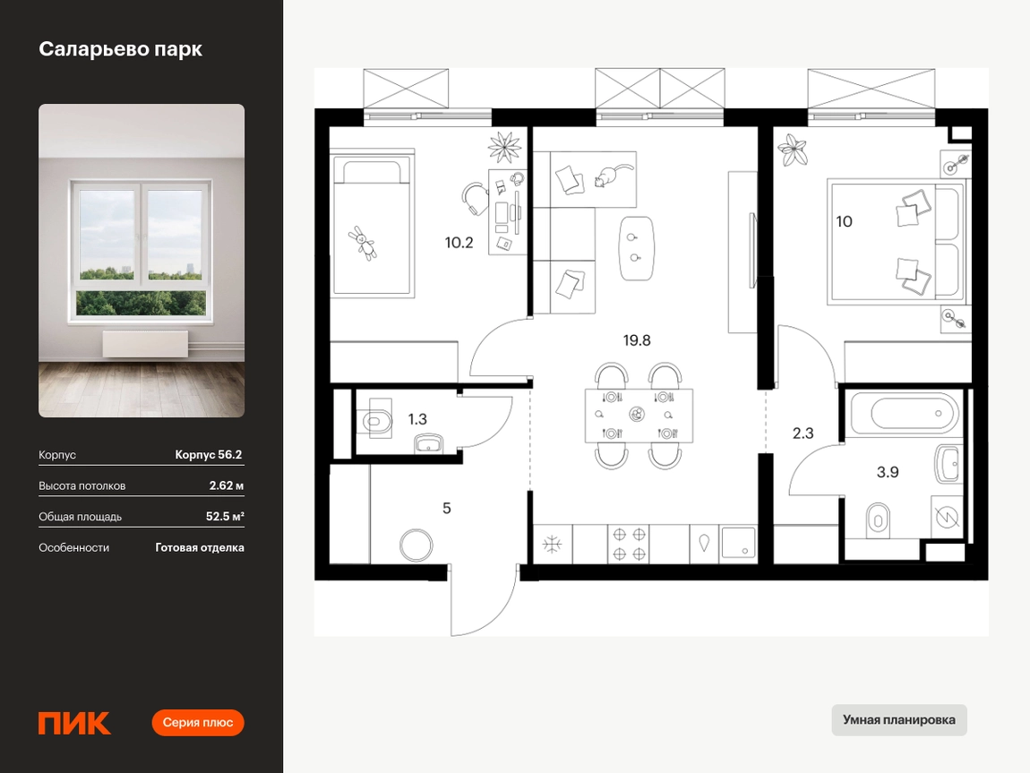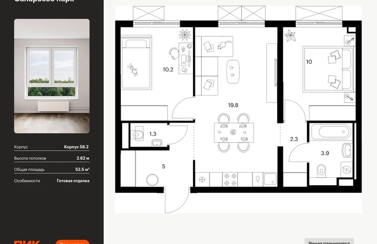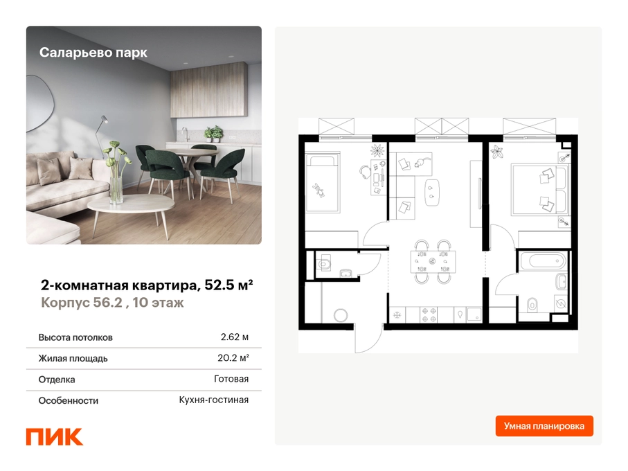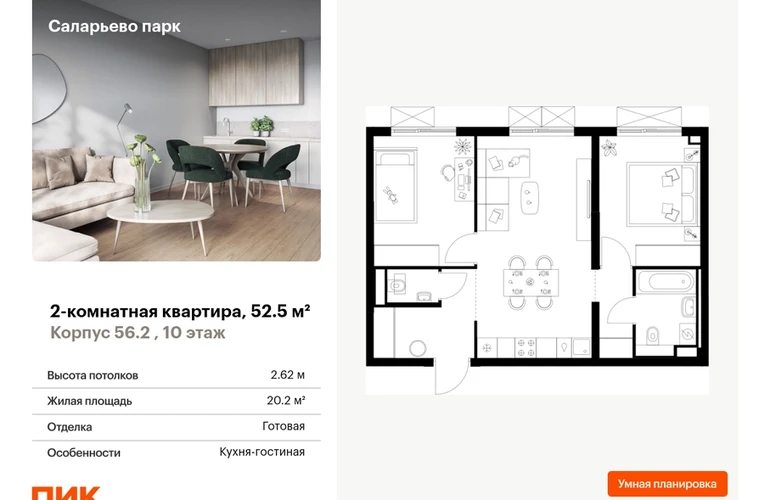 Продаётся 2-комн.квартира площадью 52.50 кв.м на 10 этаже 22 этажного дома (Корпус 56.2 , секция 3) проекта ПИК Саларьево парк. Светлый просторный подъезд на уровне земли, функциональная планировка, большие окна, с отделкой. <br> <br>Жилой район «Саларьево парк» расположен в Новой Москве, в четырёх километрах от МКАД по Киевскому шоссе. Две станции метро: «Саларьево» и «Филатов луг» — находятся в пешей доступности от проекта. Дойти до них можно за 5–10 минут. В квартале уже создана качественная среда, где есть абсолютно всё для полноценной жизни, работы и отдыха. <br> <br>«Саларьево парк» — не просто квартал, а полноценный жилой район, который отличается разноплановой архитектурой. Над концепцией квартала работали несколько ведущих архитектурных бюро, которые стремились добиться разнообразия в фасадных решениях. Ярким примером такого подхода станет корпус 83, который относится к «Серии плюс». <br> <br>Новый корпус 83 был создан по принципам южной архитектуры: расслабленный и лаконичный силуэт зданий, привлекающий к себе внимание. Архитектурная изюминка 83-го корпуса — террасы и фигурные балконы. Вместе с окнами и другими акцентными элементами они создают уникальный облик здания, отсылая нас к изысканной южной архитектуре. <br> <br>Все корпуса в квартале гармонично сочетаются, образуя единую городскую среду. Здесь приятно гулять и проводить время на улице всей семьёй. <br> <br>В «Саларьево парке» создана уникальная образовательная среда, включающая в себя шесть школ, рассчитанных на 6 250 учеников. Две из них уже открыты, их посещает 2 300 детей. Также на территории «Саларьево парка» находится 12 детских садов, один из которых с бассейном. Сейчас уже открыты 7 садов. <br> <br>В «Саларьево парке» открыта уникальная игровая площадка — PlayHub «Оригами». Здесь есть ручей, горка-труба и рельефные холмы. Взрослые смогут отдохнуть в уютном кафе, пока дети играют. Также на территории проекта есть SportHub — большая спортивная зона, разделённая по интересам и возрастам. Здесь можно заниматься разными видами спорта: футболом, баскетболом, волейболом и стритболом. Зимой центральную часть площадки превращают в каток. <br> <br>Во дворах-парках жилого квартала есть места для отдыха, детские и спортивные площадки. На первых этажах домов расположены магазины, кафе и полезные сервисы. Также вблизи проекта есть несколько масштабных торговых центров. До ТЦ «Саларис» пять минут пешком, до «Рио», Metro Cash & Carry и «Лемана про» — пять минут на автомобиле. Артикул - 990452О застройщике