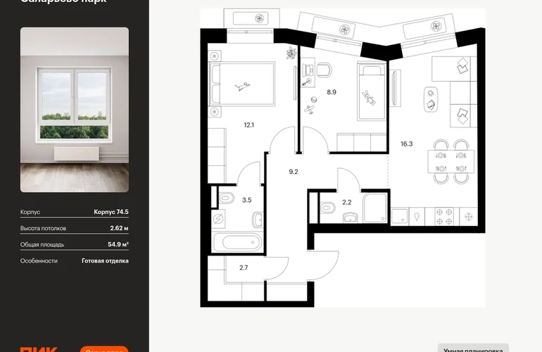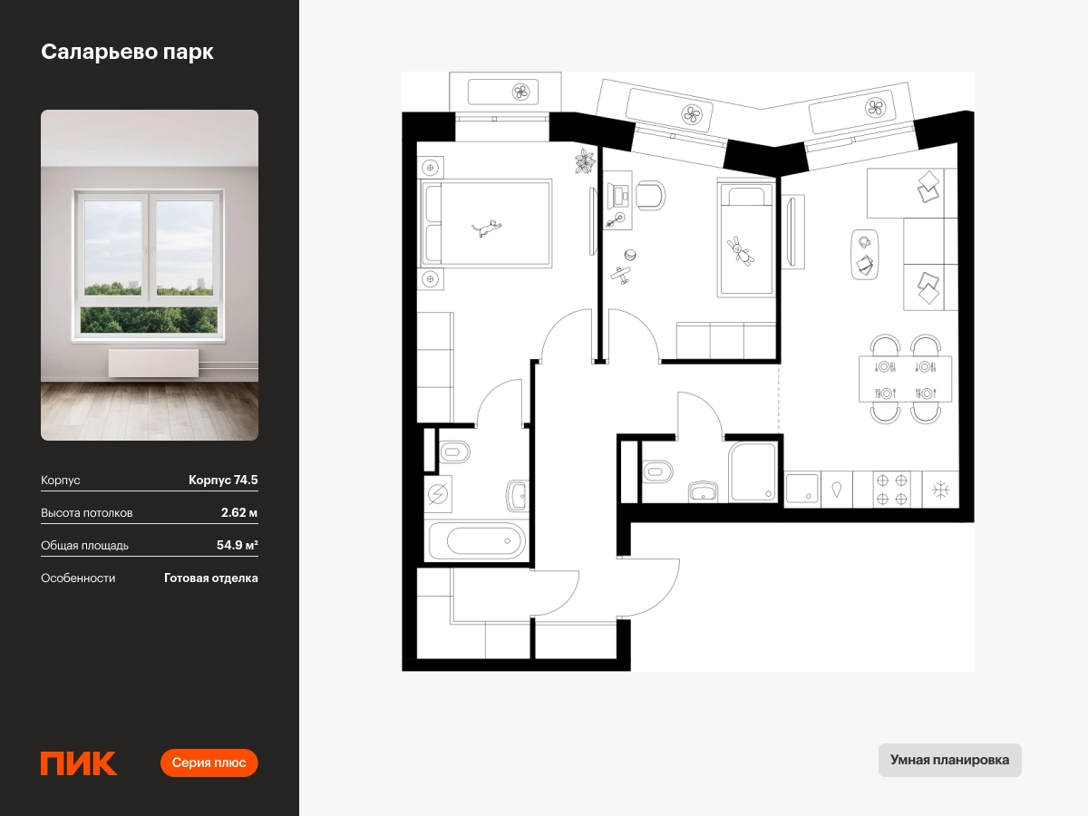 Продаётся 2-комн.квартира площадью 54.90 кв.м на 12 этаже 14 этажного дома (Корпус 74.5, секция 5) проекта ПИК Саларьево парк. Светлый просторный подъезд на уровне земли, функциональная планировка, большие окна, с отделкой. Жилой район «Саларьево парк» расположен в Новой Москве, в четырёх километрах от МКАД по Киевскому шоссе. Две станции метро: «Саларьево» и «Филатов луг», — находятся в пешей доступности от проекта. Дойти до них можно за 5–10 минут. В квартале уже создана качественная среда, где есть абсолютно всё для полноценной жизни, работы и отдыха. «Саларьево парк» — не просто квартал, а полноценный жилой район, который отличается разноплановой архитектурой. Над концепцией квартала работали несколько ведущих архитектурных бюро, которые стремились добиться разнообразия в фасадных решениях. Ярким примером такого подхода станут корпуса 82 и 83, которые относятся к «Серии плюс». Новый корпус 83 был создан по принципам южной архитектуры: расслабленный и лаконичный силуэт зданий, привлекающий к себе внимание. Архитектурная изюминка 83-го корпуса — террасы и фигурные балконы. Вместе с окнами и другими акцентными элементами они создают уникальный облик здания, отсылая нас к изысканной южной архитектуре. Все корпуса в квартале гармонично сочетаются, образуя единую городскую среду. Здесь приятно гулять и проводить время на улице всей семьёй. В «Саларьево парке» создана уникальная образовательная среда, включающая в себя шесть школ, рассчитанных на 6 250 учеников. Четыре из них уже открыты, их посещает 2 300 детей. Также на территории «Саларьево парка» находится 12 детских садов, один из которых с бассейном. Сейчас уже открыты 8 садов. В «Саларьево парке» открыта уникальная игровая площадка — PlayHub «Оригами». Здесь есть ручей, горка-труба и рельефные холмы. Взрослые смогут отдохнуть в уютном кафе, пока дети играют. Также на территории проекта есть SportHub — большая спортивная зона, разделённая по интересам и возрастам. Здесь можно заниматься разными видами спорта: футболом, баскетболом, волейболом и стритболом. Зимой центральную часть площадки превращают в каток. Во дворах-парках жилого квартала есть места для отдыха, детские и спортивные площадки. На первых этажах домов расположены магазины, кафе и полезные сервисы. Также вблизи проекта есть несколько масштабных торговых центров. До ТЦ «Саларис» пять минут пешком, до «Рио», Metro Cash & Carry и «Леруа Мерлен» — пять минут на автомобиле. Артикул - 1006739О застройщике