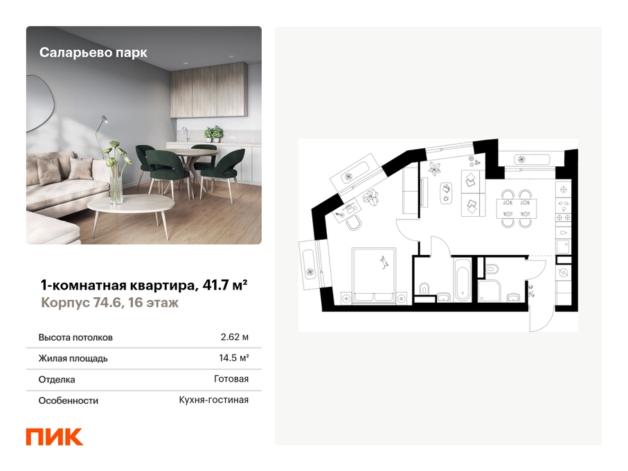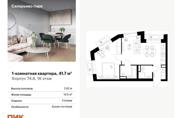 Продаётся 1-комн.квартира площадью 41.70 кв.м на 16 этаже 18 этажного дома (Корпус 74.6, секция 6) проекта ПИК Саларьево парк. Светлый просторный подъезд на уровне земли, функциональная планировка, большие окна, с отделкой. <br> <br>Жилой район «Саларьево парк» расположен в Новой Москве, в четырёх километрах от МКАД по Киевскому шоссе. Две станции метро: «Саларьево» и «Филатов луг» — находятся в пешей доступности от проекта. Дойти до них можно за 5–10 минут. В квартале уже создана качественная среда, где есть абсолютно всё для полноценной жизни, работы и отдыха. <br> <br>«Саларьево парк» — не просто квартал, а полноценный жилой район, который отличается разноплановой архитектурой. Над концепцией квартала работали несколько ведущих архитектурных бюро, которые стремились добиться разнообразия в фасадных решениях. Ярким примером такого подхода станет корпус 83, который относится к «Серии плюс». <br> <br>Новый корпус 83 был создан по принципам южной архитектуры: расслабленный и лаконичный силуэт зданий, привлекающий к себе внимание. Архитектурная изюминка 83-го корпуса — террасы и фигурные балконы. Вместе с окнами и другими акцентными элементами они создают уникальный облик здания, отсылая нас к изысканной южной архитектуре. <br> <br>Все корпуса в квартале гармонично сочетаются, образуя единую городскую среду. Здесь приятно гулять и проводить время на улице всей семьёй. <br> <br>В «Саларьево парке» создана уникальная образовательная среда, включающая в себя шесть школ, рассчитанных на 6 250 учеников. Две из них уже открыты, их посещает 2 300 детей. Также на территории «Саларьево парка» находится 12 детских садов, один из которых с бассейном. Сейчас уже открыты 7 садов. <br> <br>В «Саларьево парке» открыта уникальная игровая площадка — PlayHub «Оригами». Здесь есть ручей, горка-труба и рельефные холмы. Взрослые смогут отдохнуть в уютном кафе, пока дети играют. Также на территории проекта есть SportHub — большая спортивная зона, разделённая по интересам и возрастам. Здесь можно заниматься разными видами спорта: футболом, баскетболом, волейболом и стритболом. Зимой центральную часть площадки превращают в каток. <br> <br>Во дворах-парках жилого квартала есть места для отдыха, детские и спортивные площадки. На первых этажах домов расположены магазины, кафе и полезные сервисы. Также вблизи проекта есть несколько масштабных торговых центров. До ТЦ «Саларис» пять минут пешком, до «Рио», Metro Cash & Carry и «Лемана про» — пять минут на автомобиле. Артикул - 1006953О застройщике