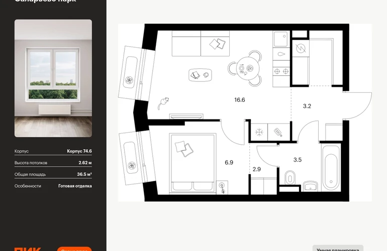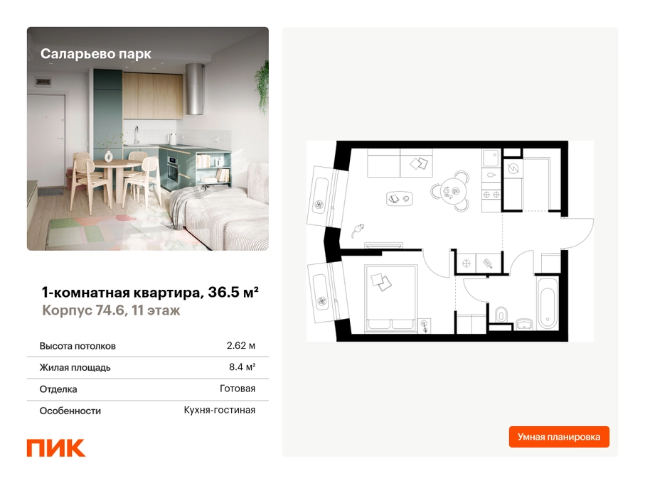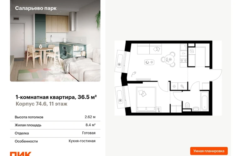 Продаётся 1-комн.квартира площадью 36.50 кв.м на 11 этаже 18 этажного дома (Корпус 74.6, секция 6) проекта ПИК Саларьево парк. Светлый просторный подъезд на уровне земли, функциональная планировка, большие окна, с отделкой. <br> <br>Жилой район «Саларьево парк» расположен в Новой Москве, в четырёх километрах от МКАД по Киевскому шоссе. Две станции метро: «Саларьево» и «Филатов луг» — находятся в пешей доступности от проекта. Дойти до них можно за 5–10 минут. В квартале уже создана качественная среда, где есть абсолютно всё для полноценной жизни, работы и отдыха. <br> <br>«Саларьево парк» — не просто квартал, а полноценный жилой район, который отличается разноплановой архитектурой. Над концепцией квартала работали несколько ведущих архитектурных бюро, которые стремились добиться разнообразия в фасадных решениях. Ярким примером такого подхода станет корпус 83, который относится к «Серии плюс». <br> <br>Новый корпус 83 был создан по принципам южной архитектуры: расслабленный и лаконичный силуэт зданий, привлекающий к себе внимание. Архитектурная изюминка 83-го корпуса — террасы и фигурные балконы. Вместе с окнами и другими акцентными элементами они создают уникальный облик здания, отсылая нас к изысканной южной архитектуре. <br> <br>Все корпуса в квартале гармонично сочетаются, образуя единую городскую среду. Здесь приятно гулять и проводить время на улице всей семьёй. <br> <br>В «Саларьево парке» создана уникальная образовательная среда, включающая в себя шесть школ, рассчитанных на 6 250 учеников. Две из них уже открыты, их посещает 2 300 детей. Также на территории «Саларьево парка» находится 12 детских садов, один из которых с бассейном. Сейчас уже открыты 7 садов. <br> <br>В «Саларьево парке» открыта уникальная игровая площадка — PlayHub «Оригами». Здесь есть ручей, горка-труба и рельефные холмы. Взрослые смогут отдохнуть в уютном кафе, пока дети играют. Также на территории проекта есть SportHub — большая спортивная зона, разделённая по интересам и возрастам. Здесь можно заниматься разными видами спорта: футболом, баскетболом, волейболом и стритболом. Зимой центральную часть площадки превращают в каток. <br> <br>Во дворах-парках жилого квартала есть места для отдыха, детские и спортивные площадки. На первых этажах домов расположены магазины, кафе и полезные сервисы. Также вблизи проекта есть несколько масштабных торговых центров. До ТЦ «Саларис» пять минут пешком, до «Рио», Metro Cash & Carry и «Лемана про» — пять минут на автомобиле. Артикул - 1006892О застройщике
