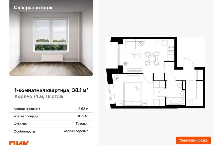 Продаётся 1-комн.квартира площадью 38.10 кв.м на 18 этаже 18 этажного дома (Корпус 74.6, секция 6) проекта ПИК Саларьево парк. Светлый просторный подъезд на уровне земли, функциональная планировка, большие окна, с отделкой. <br> <br>Жилой район «Саларьево парк» расположен в Новой Москве, в четырёх километрах от МКАД по Киевскому шоссе. Две станции метро: «Саларьево» и «Филатов луг» — находятся в пешей доступности от проекта. Дойти до них можно за 5–10 минут. В квартале уже создана качественная среда, где есть абсолютно всё для полноценной жизни, работы и отдыха. <br> <br>«Саларьево парк» — не просто квартал, а полноценный жилой район, который отличается разноплановой архитектурой. Над концепцией квартала работали несколько ведущих архитектурных бюро, которые стремились добиться разнообразия в фасадных решениях. Ярким примером такого подхода станет корпус 83, который относится к «Серии плюс». <br> <br>Новый корпус 83 был создан по принципам южной архитектуры: расслабленный и лаконичный силуэт зданий, привлекающий к себе внимание. Архитектурная изюминка 83-го корпуса — террасы и фигурные балконы. Вместе с окнами и другими акцентными элементами они создают уникальный облик здания, отсылая нас к изысканной южной архитектуре. <br> <br>Все корпуса в квартале гармонично сочетаются, образуя единую городскую среду. Здесь приятно гулять и проводить время на улице всей семьёй. <br> <br>В «Саларьево парке» создана уникальная образовательная среда, включающая в себя шесть школ, рассчитанных на 6 250 учеников. Две из них уже открыты, их посещает 2 300 детей. Также на территории «Саларьево парка» находится 12 детских садов, один из которых с бассейном. Сейчас уже открыты 7 садов. <br> <br>В «Саларьево парке» открыта уникальная игровая площадка — PlayHub «Оригами». Здесь есть ручей, горка-труба и рельефные холмы. Взрослые смогут отдохнуть в уютном кафе, пока дети играют. Также на территории проекта есть SportHub — большая спортивная зона, разделённая по интересам и возрастам. Здесь можно заниматься разными видами спорта: футболом, баскетболом, волейболом и стритболом. Зимой центральную часть площадки превращают в каток. <br> <br>Во дворах-парках жилого квартала есть места для отдыха, детские и спортивные площадки. На первых этажах домов расположены магазины, кафе и полезные сервисы. Также вблизи проекта есть несколько масштабных торговых центров. До ТЦ «Саларис» пять минут пешком, до «Рио», Metro Cash & Carry и «Леруа Мерлен» — пять минут на автомобиле. Артикул - 1006961О застройщике